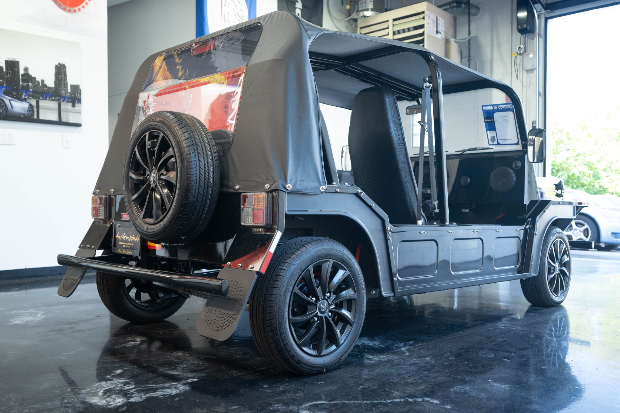 Black 14″ 10-spoke wheels are mounted with 175/60 Minnell tires. and a spare tire is mounted to the rear of the vehicle. Stopping power is provided by front disc and rear drum brakes.