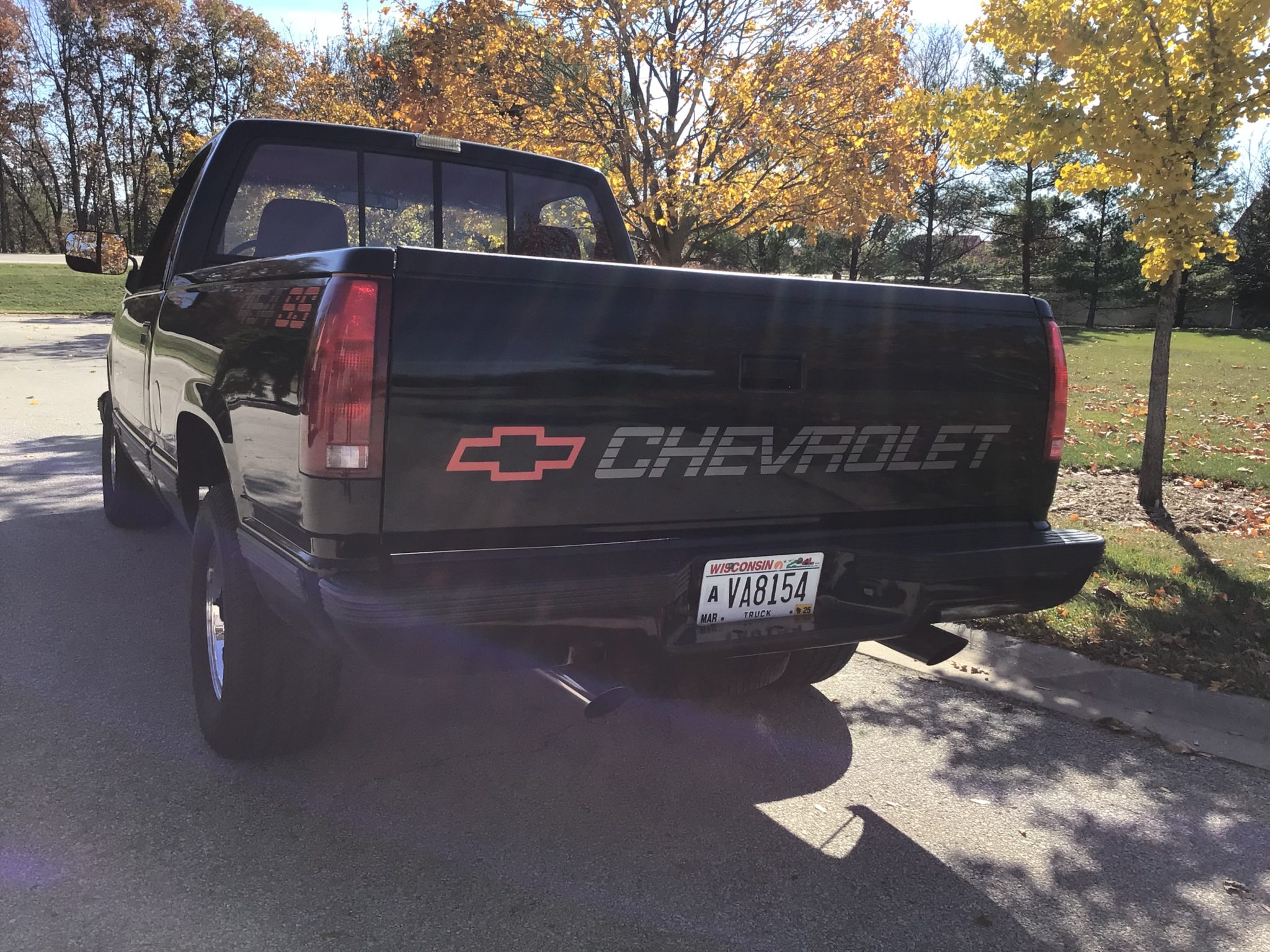Chrome-finished 15″ steel wheels are mounted with Cooper Cobra Radial G/T tires. All 454 SS trucks were equipped with the Performance Handling Package, which included a 32mm front sway bar, a 12.7:1 steering ratio, and Bilstein dampers. Braking is provided by power-assisted front discs and anti-lock rear drums.