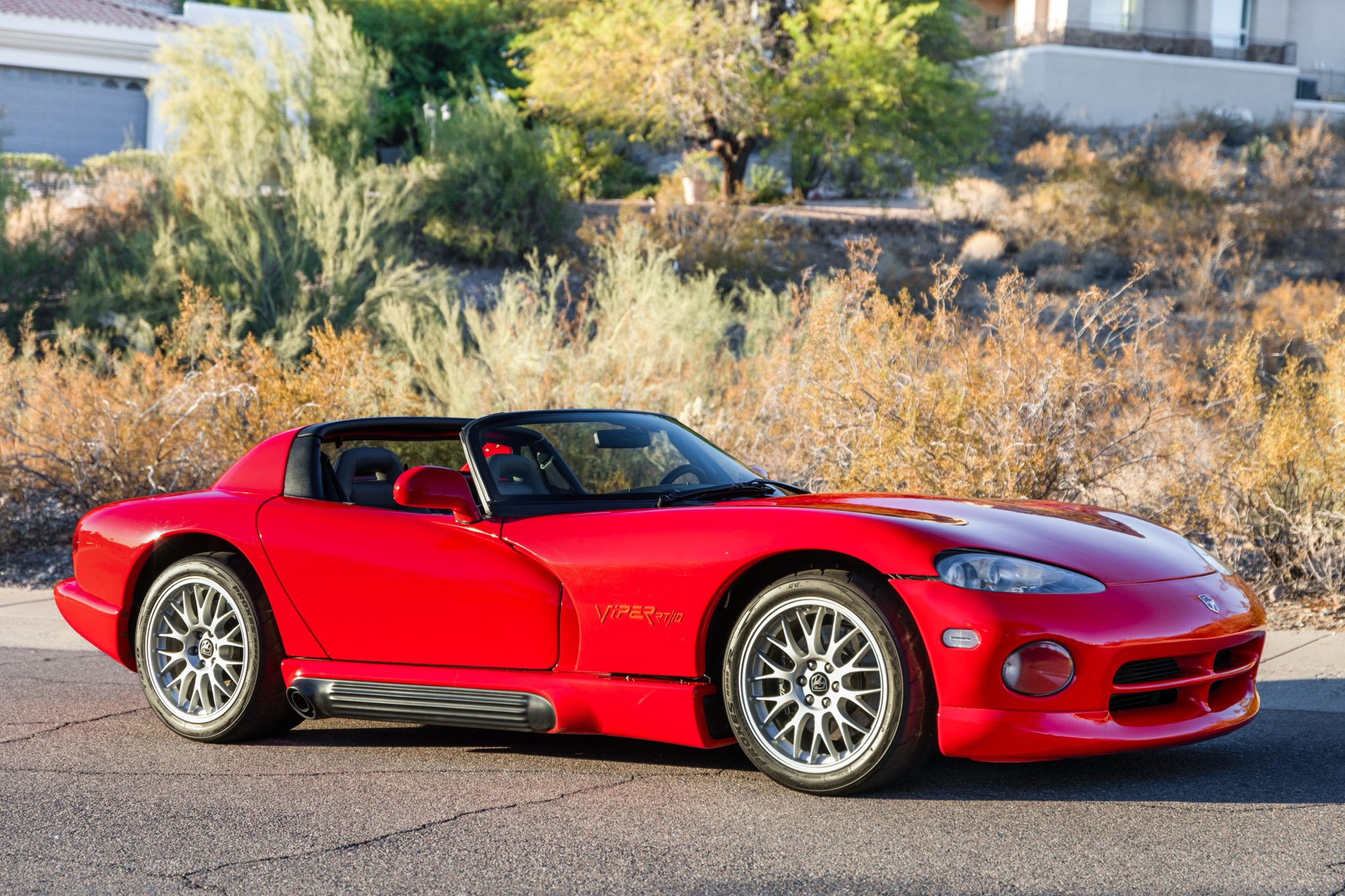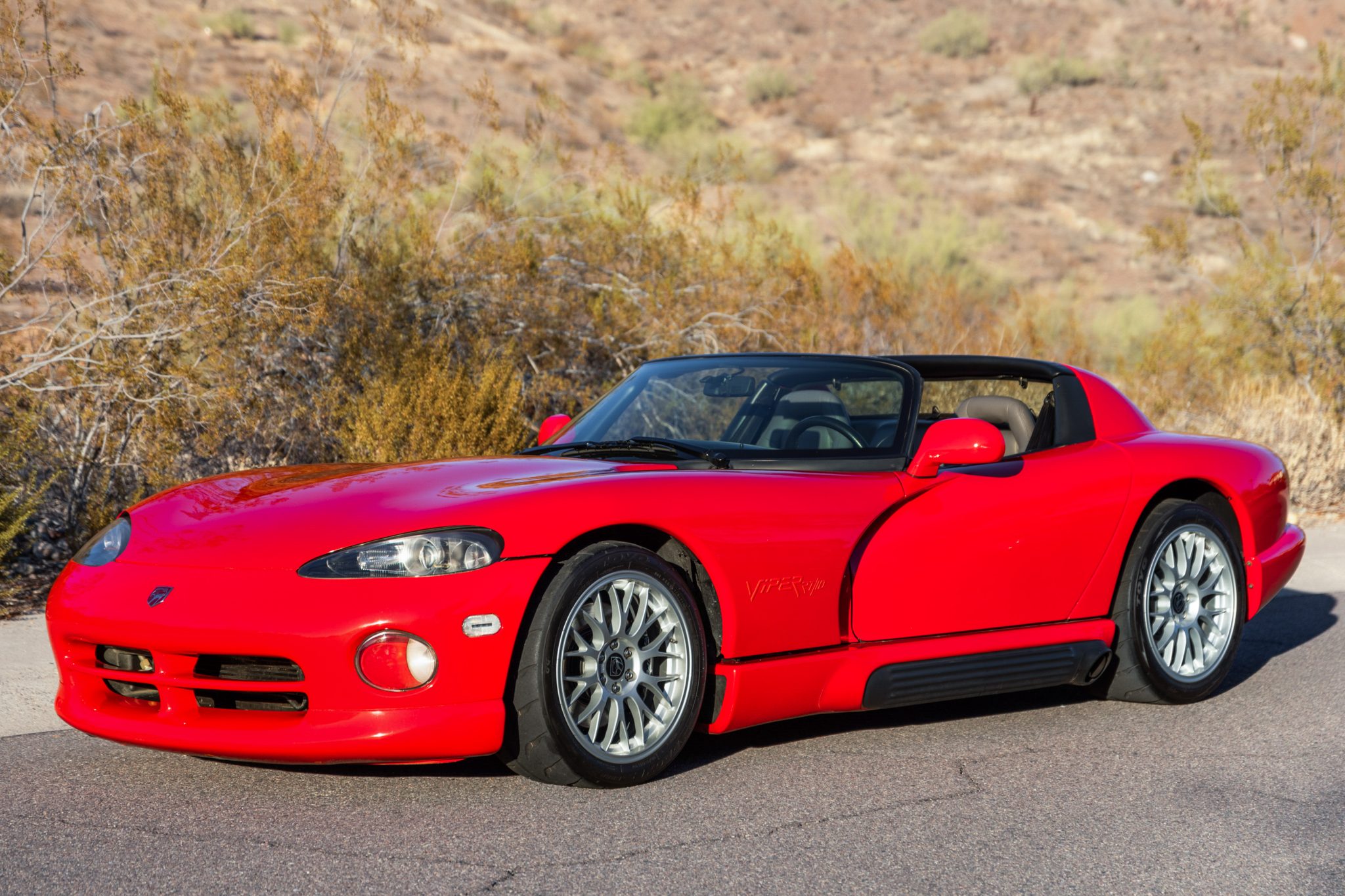 The 18″ ACR-style BBS Y-spoke wheels are mounted with Toyo Proxes R888 R tires, which show date codes from 2017 and 2018. The RT/10 is equipped with power-assisted rack-and-pinion steering, four-wheel independent suspension, and four-wheel vented disc brakes with RT/10-branded calipers up front. 1995 models were not equipped with ABS. EBC brake pads and 5/8″ lowering caps have reportedly been added. The removed 17″ three-spoke wheels are included in the sale, and they are shod with Michelin XGT tires.