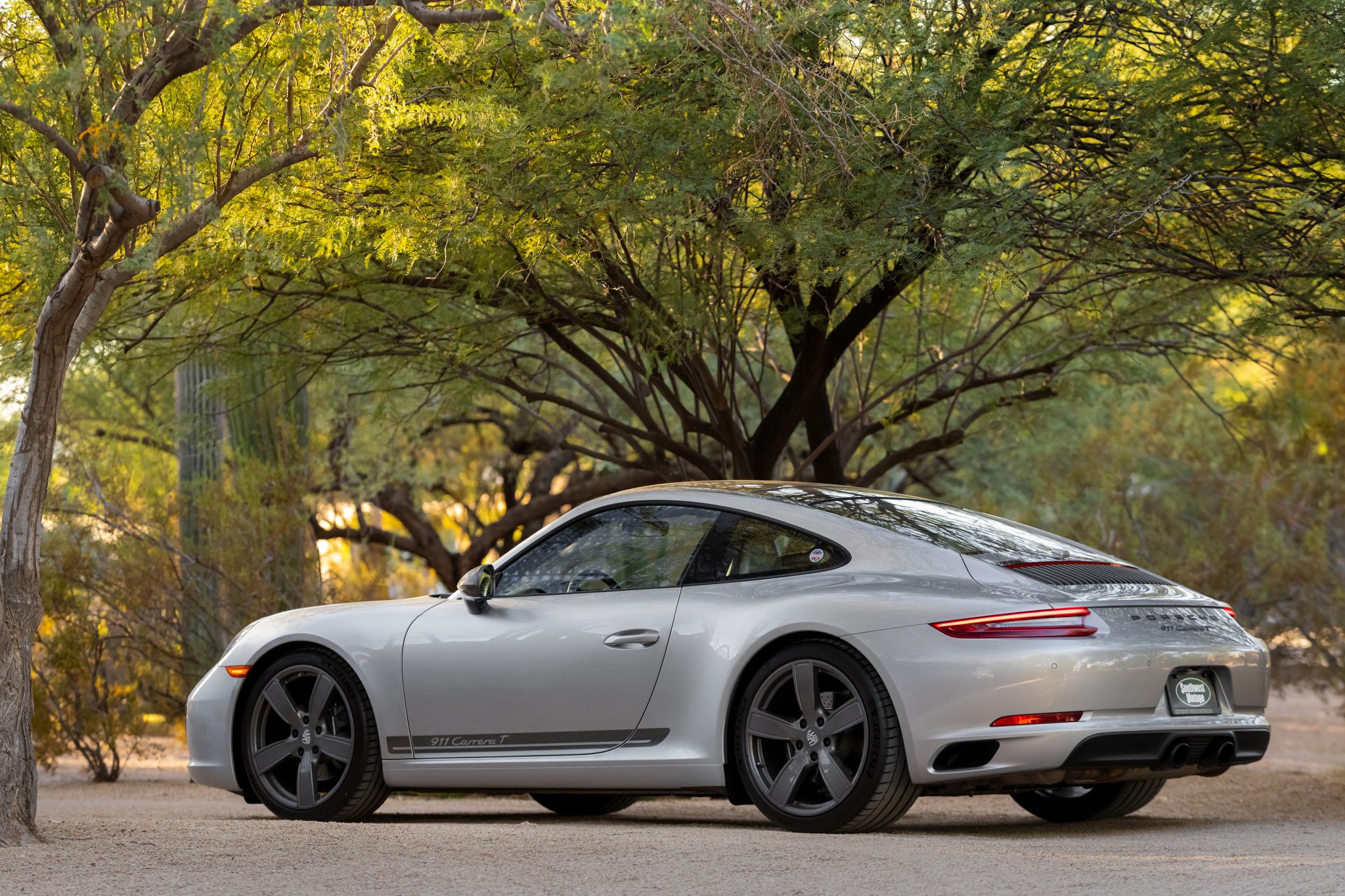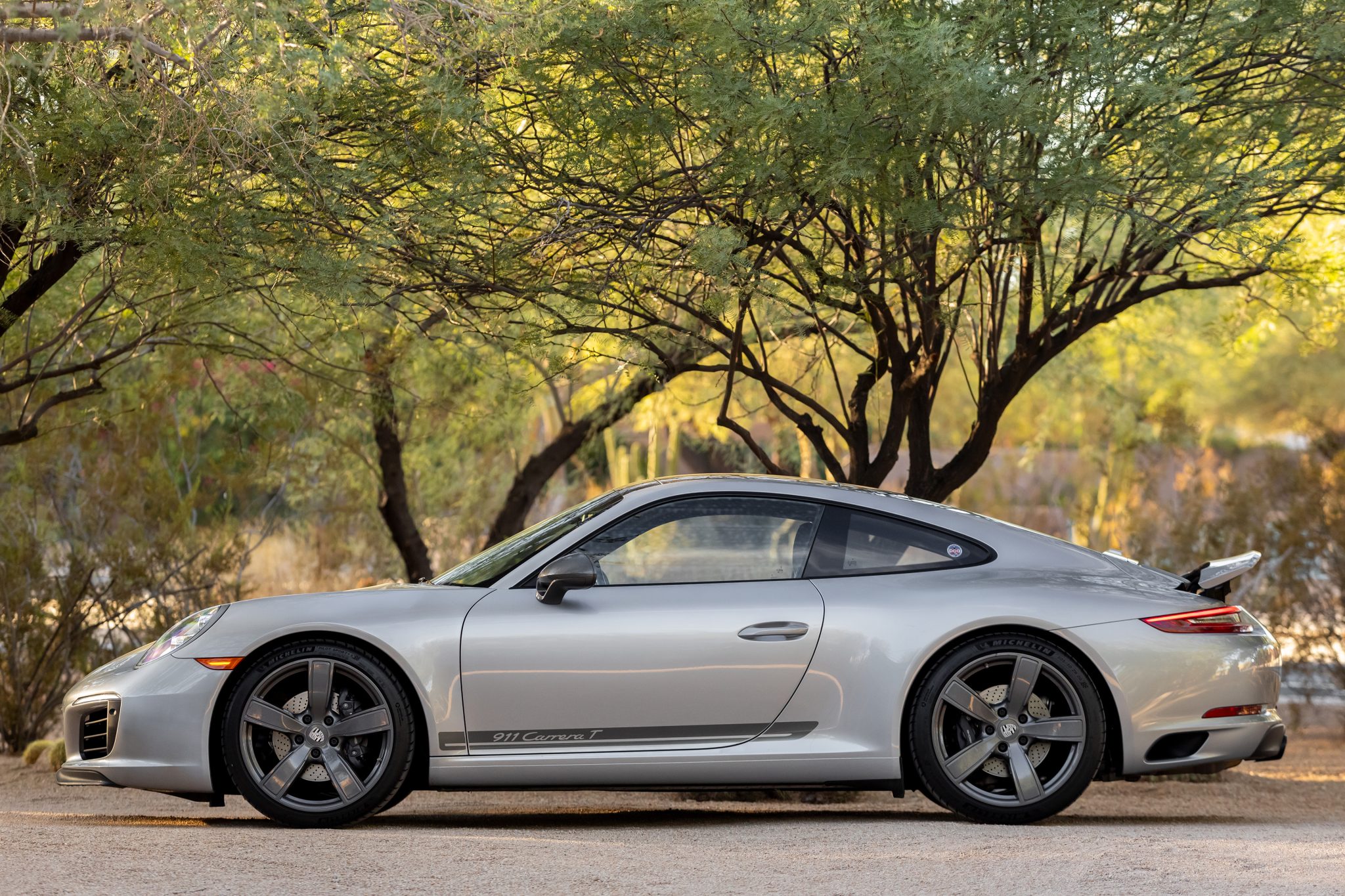 The 20″ Carrera Sport alloy wheels are mounted with Michelin tires. Braking is handled by black-painted Porsche-branded calipers over cross-drilled and ventilated discs. Porsche Active Suspension Management (PASM) Sport suspension was standard on the T, lowering the car’s ride height by 20mm when compared with the standard Carrera. Additional optional equipment on this example includes Power Steering Plus and rear-axle steering.