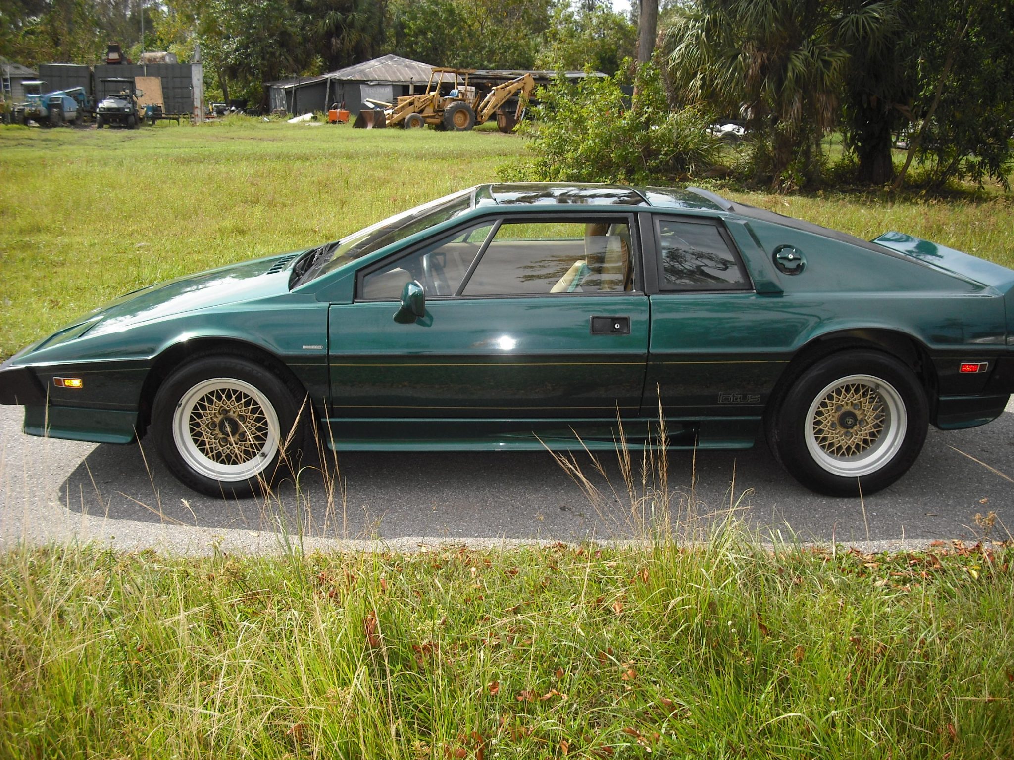 Gold-centered 15″ BBS basketweave alloy wheels are mounted with staggered Hankook tires showing 2010 date codes. The steel backbone chassis features independent suspension, and stopping power is provided by power-assisted discs with inboard rear units.