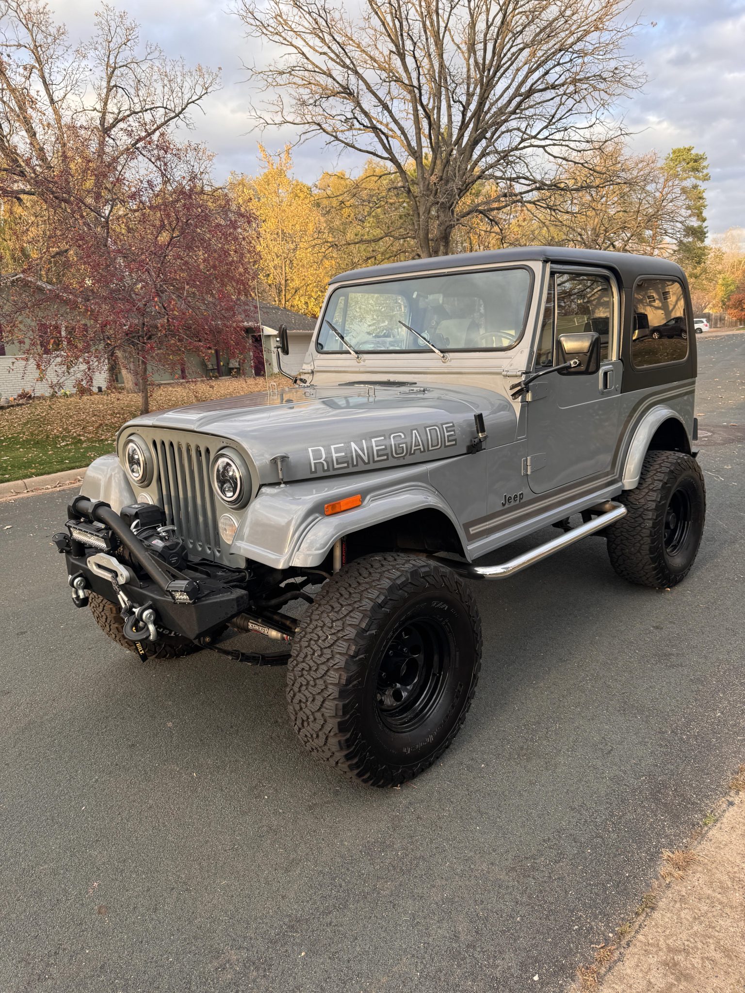Black-finished 15″ steel wheels are mounted with 33×12.5″ BFGoodrich All-Terrain T/A KO2 tires, and a matching spare is affixed to the rear swing-away carrier. The truck rides on a lifted suspension that features Rouch Country shock absorbers along with a Skyjacker steering damper, and braking is provided by discs at all four corners. The seller notes that the front suspension shackles and leaf springs were replaced in 2024, at which time the parking brake cable was also replaced.