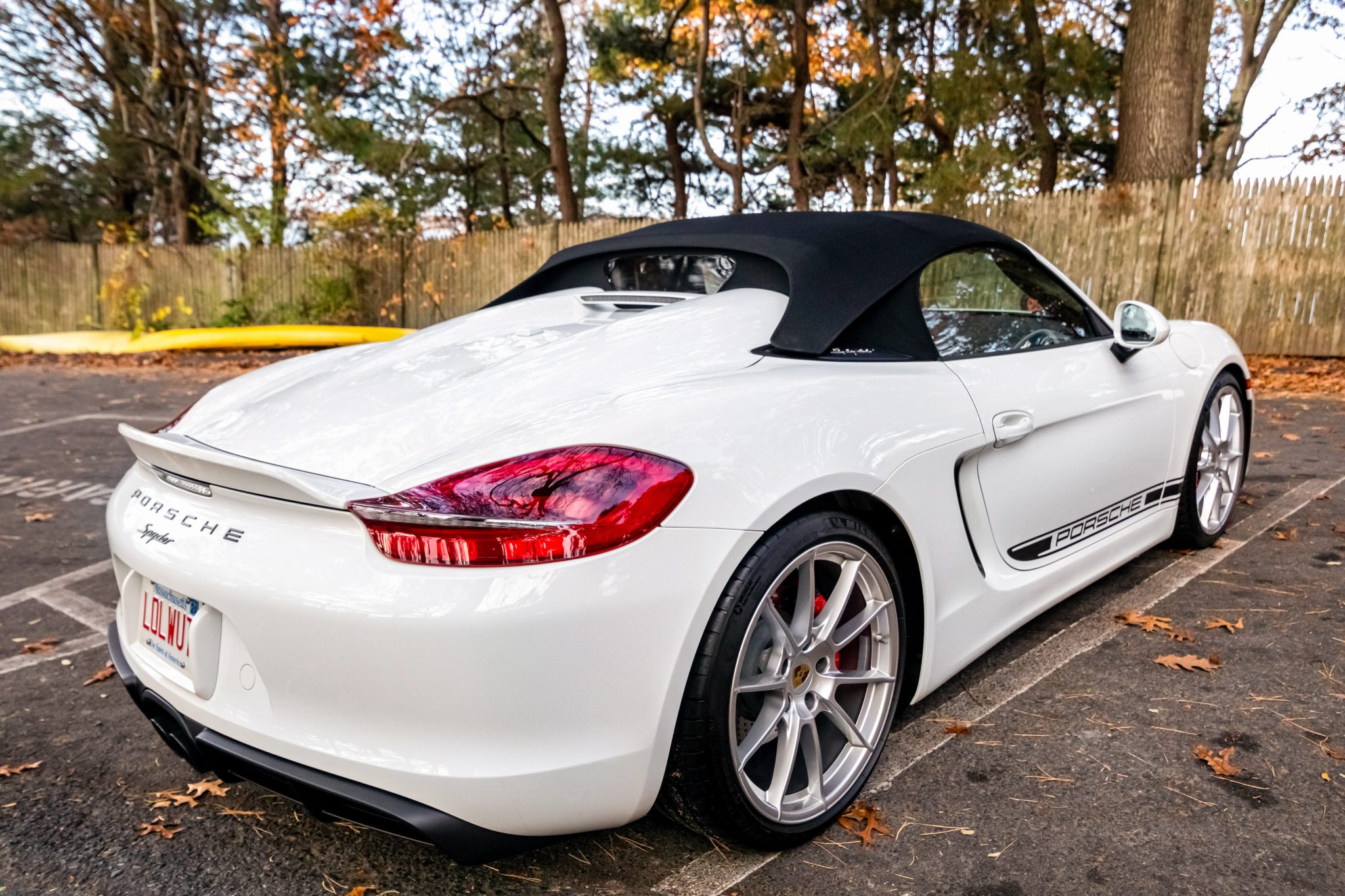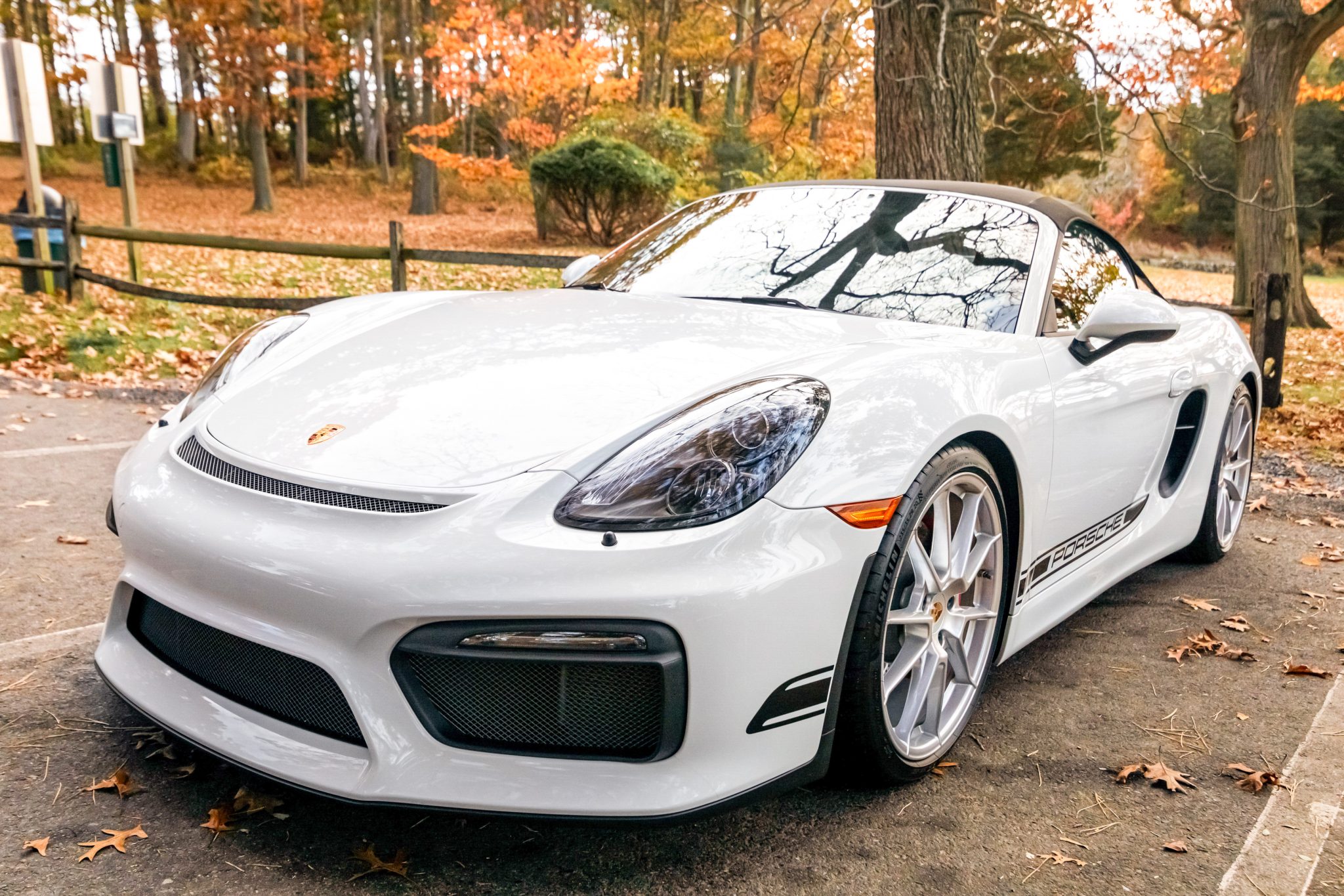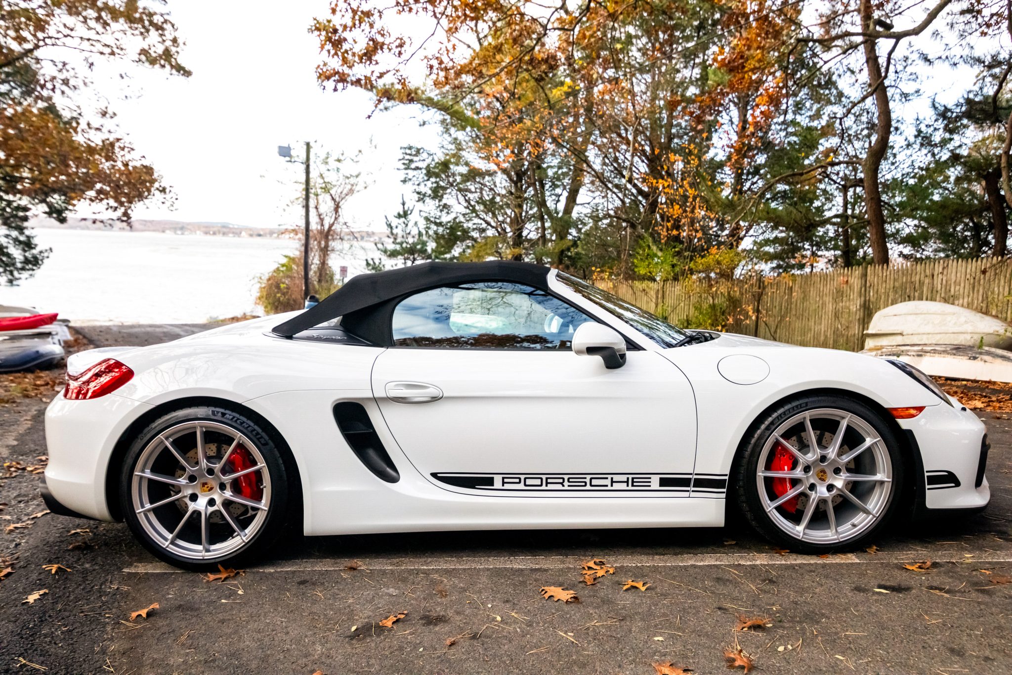 The 20″ Spyder alloy wheels were mounted with 235/35 front and 265/35 rear Michelin Pilot Sport 4S tires in August 2023. The left-front wheel was straightened in August 2023. Braking is handled by four-wheel cross-drilled and ventilated discs with red-painted Porsche-branded calipers. Boxster Spyders were equipped from the factory with a 20mm lower sport suspension than the standard Boxster. An electromechanical steering rack that was shared with the contemporary 911 Turbo was also fitted as standard.