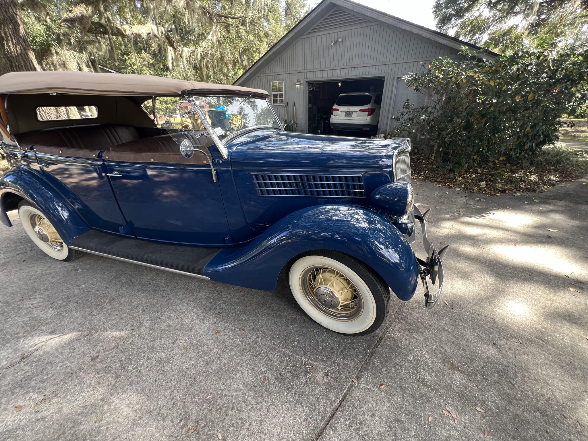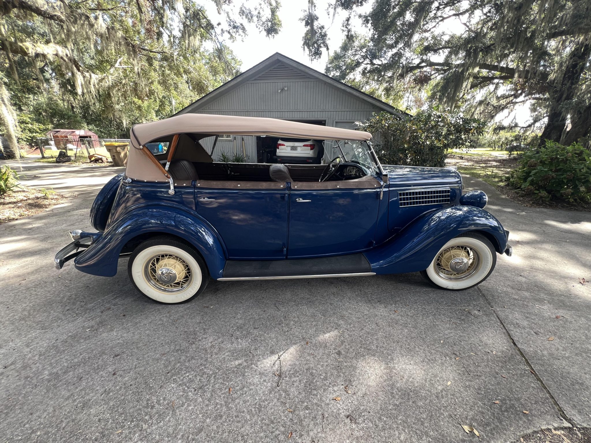 Cream-color 16″ wire wheels are mounted with 6.00-16 Firestone Deluxe Champion wide-whitewall tires. Braking is provided by hydraulic drums at each corner. A body-color spare tire carrier is affixed to the rear of the car. The left-rear shock requires replacement.
