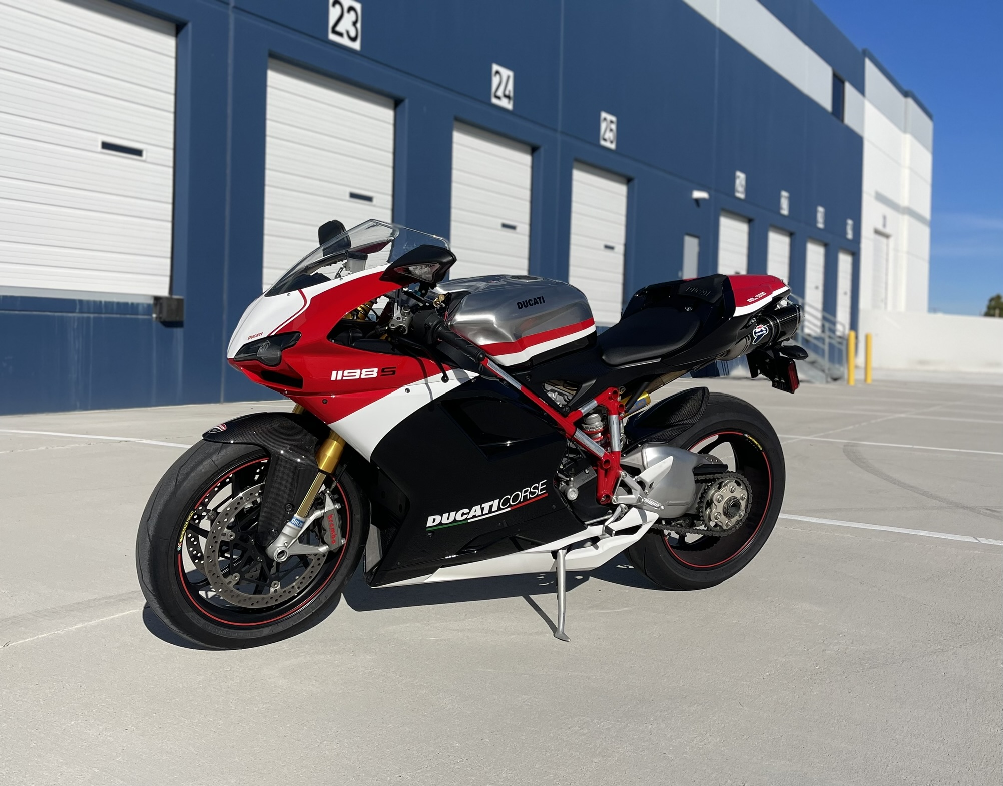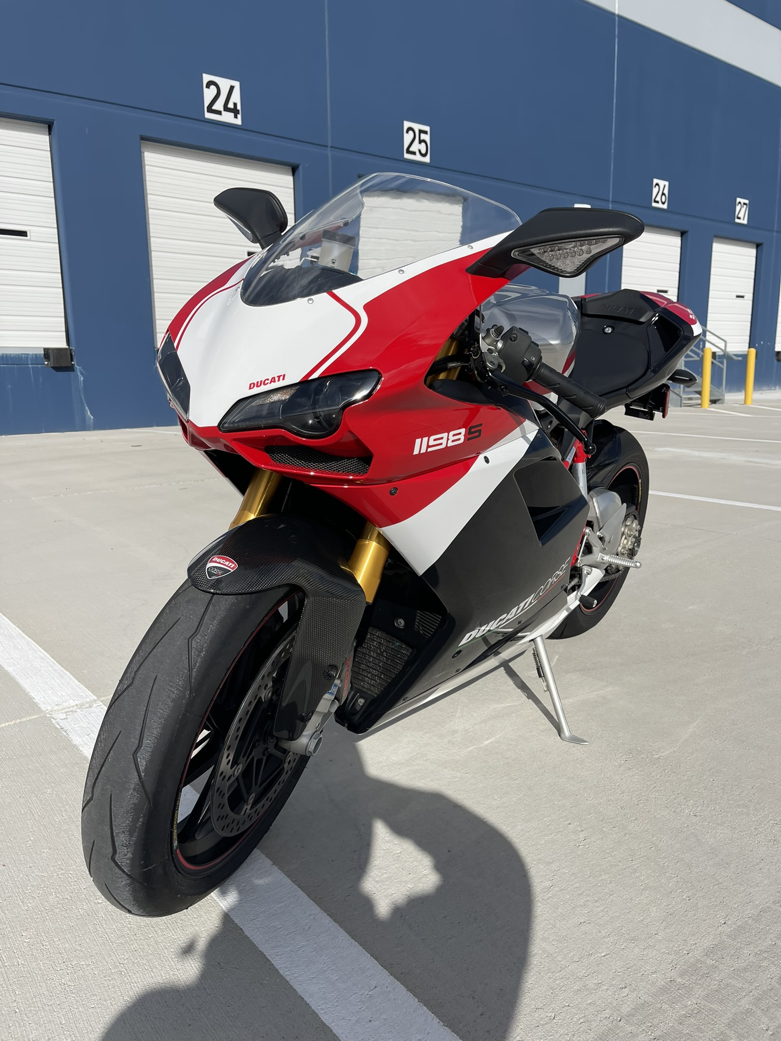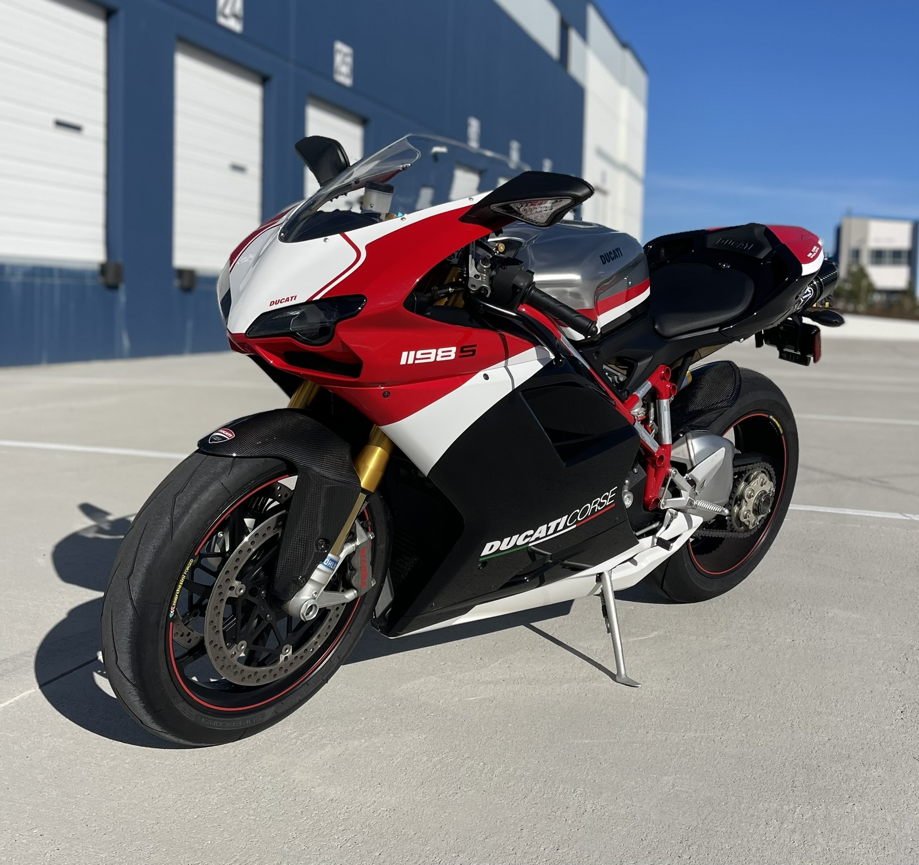 Marchesini forged-alloy wheels were mounted with Pirelli Diablo Supercorsa tires in July 2024. The adjustable suspension employs a 43mm Öhlins inverted fork with titanium nitride-coated stanchions in addition to aluminum single-sided swingarm that is damped by a monoshock with an aftermarket spring. Stopping power is provided by triple disc brakes, and radial-mount four-piston Brembo Monobloc calipers are fitted up front. The brake fluid was flushed in July 2024.