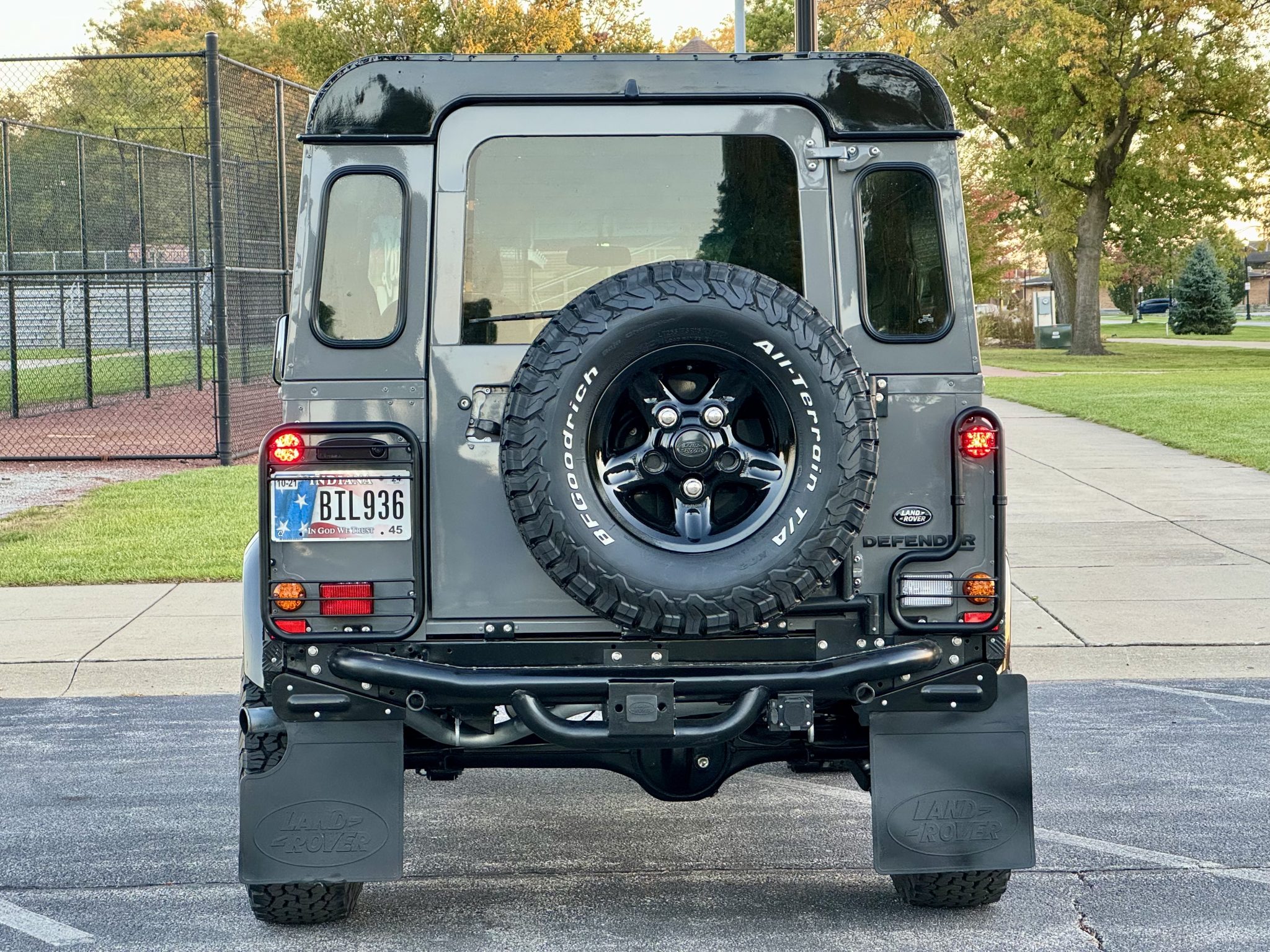 Black 16″ five-spoke alloy wheels were mounted with 265/75 BFGoodrich All-Terrain T/A KO2 tires in 2024, and a matching spare is affixed to the rear. Work during the refurbishment included overhauling the four-wheel disc brakes and installing braided stainless-steel lines and Terrafirma shock absorbers as well as rebuilding the steering box and replacing the steering stabilizer, tie rods, suspension bushings, ball joints, and wheel bearings.
