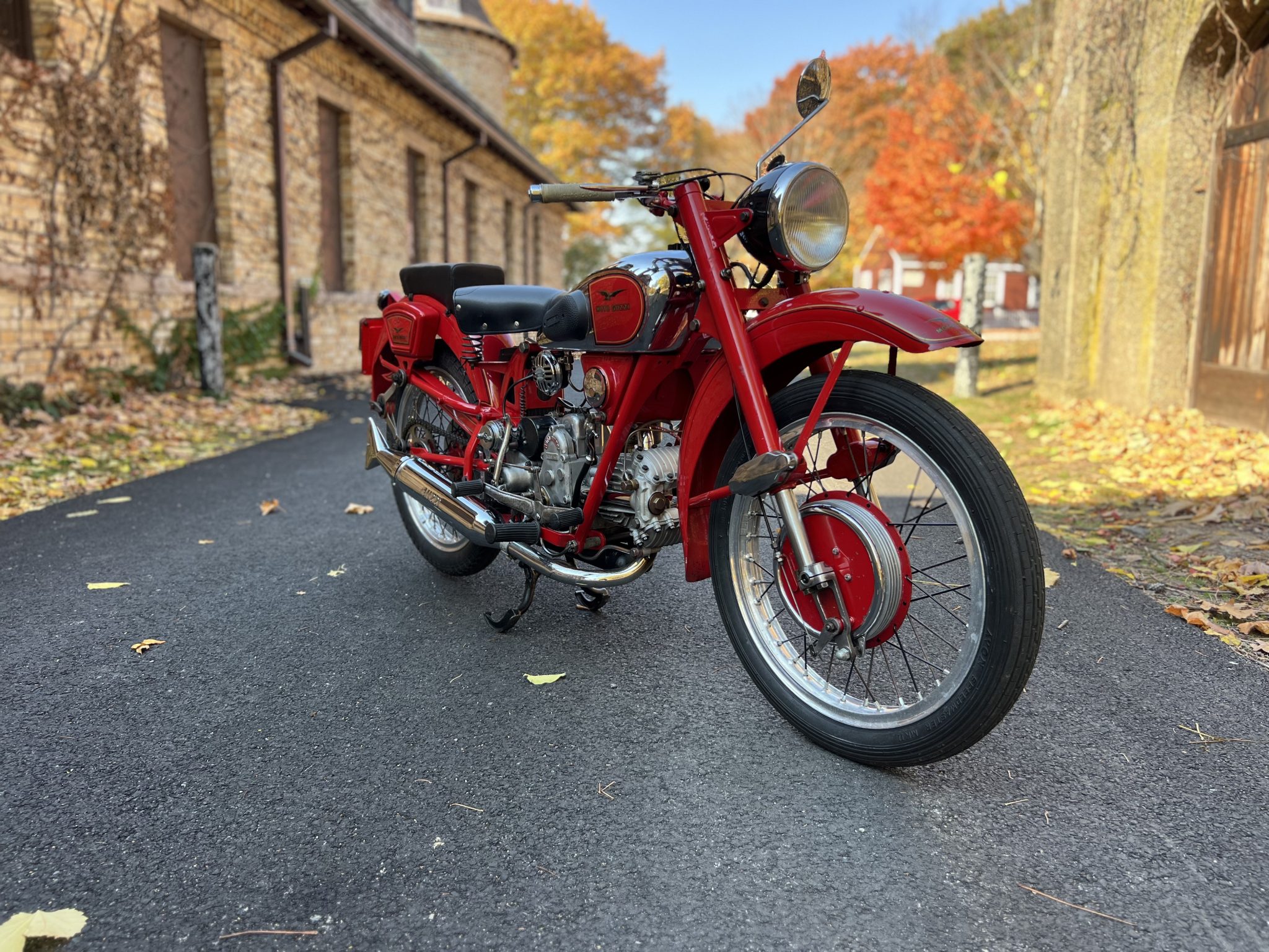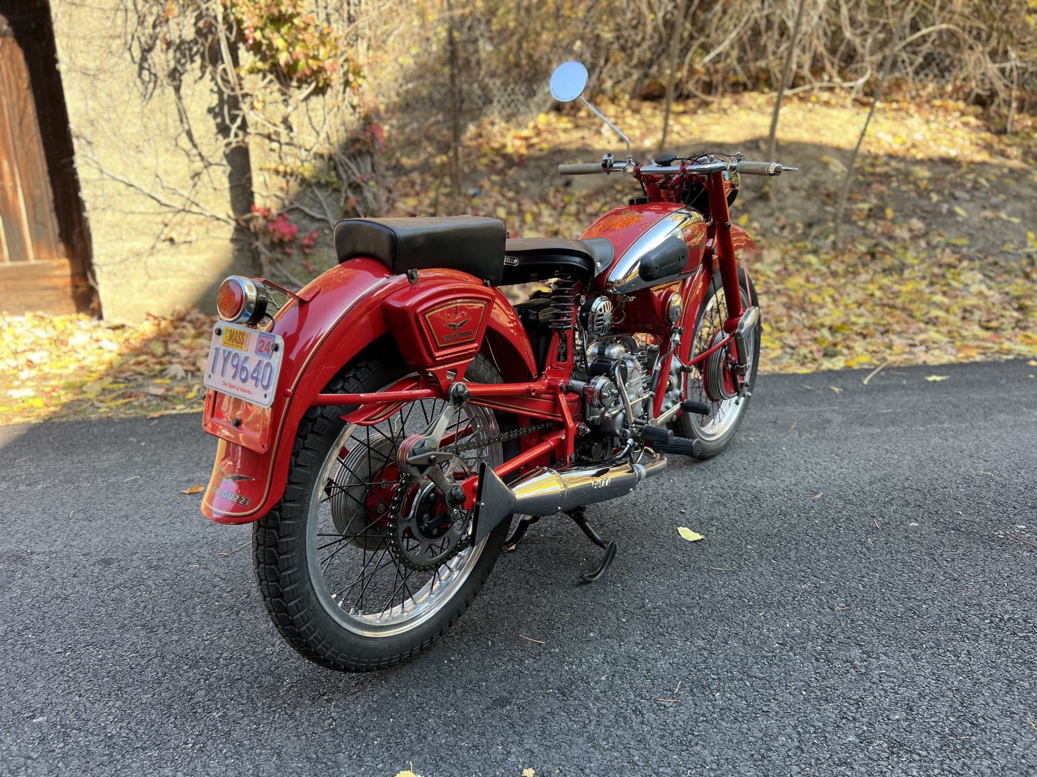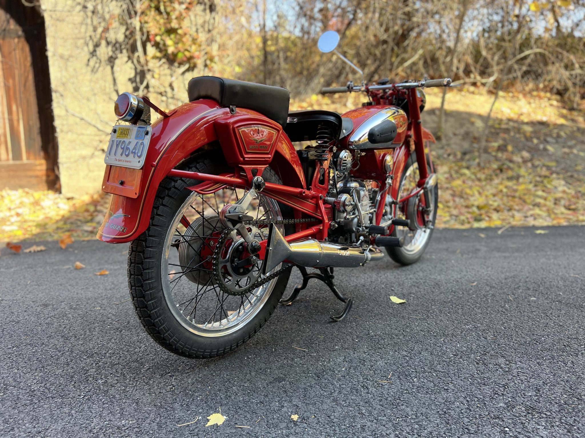 Wire-spoke 19″ wheels feature alloy rims mounted with Avon Speedmaster MKII front and Pirelli MT-53 rear tires. Suspension is handled by an inverted telescopic fork with roller stanchion guides as well as a triangulated swingarm connected to knee-action friction dampers with radius arms above and a set of concealed springs mounted horizontally under the engine below. Braking is provided by finned drums at both ends, the front of which was rebuilt at Two Wheel Motorsport of Ontario, Canada.