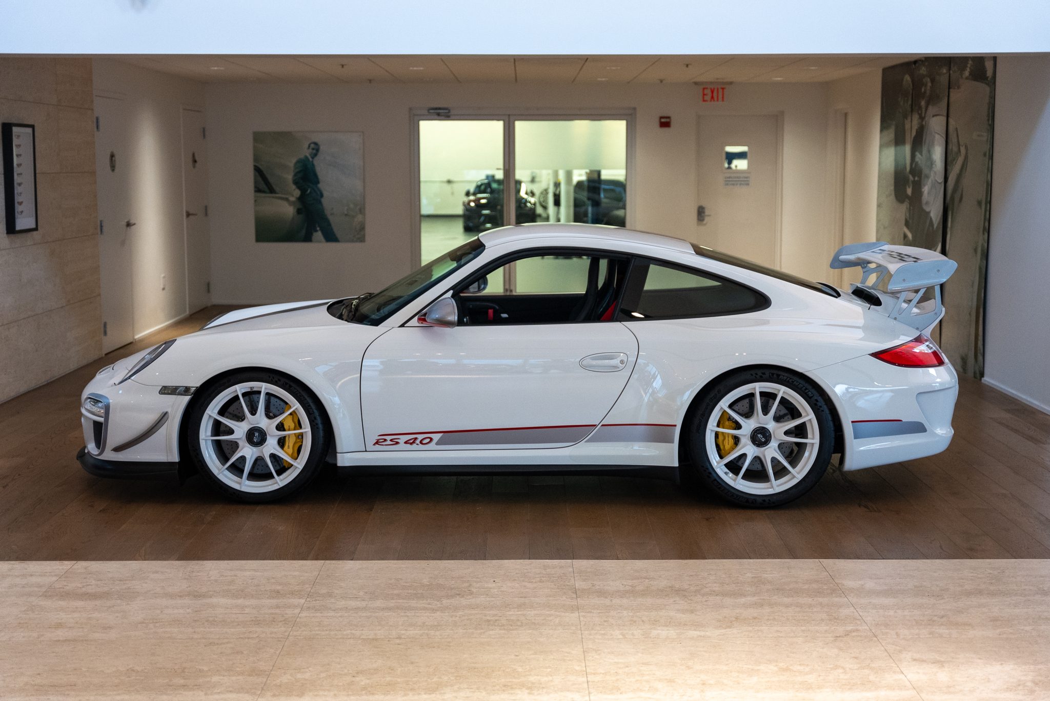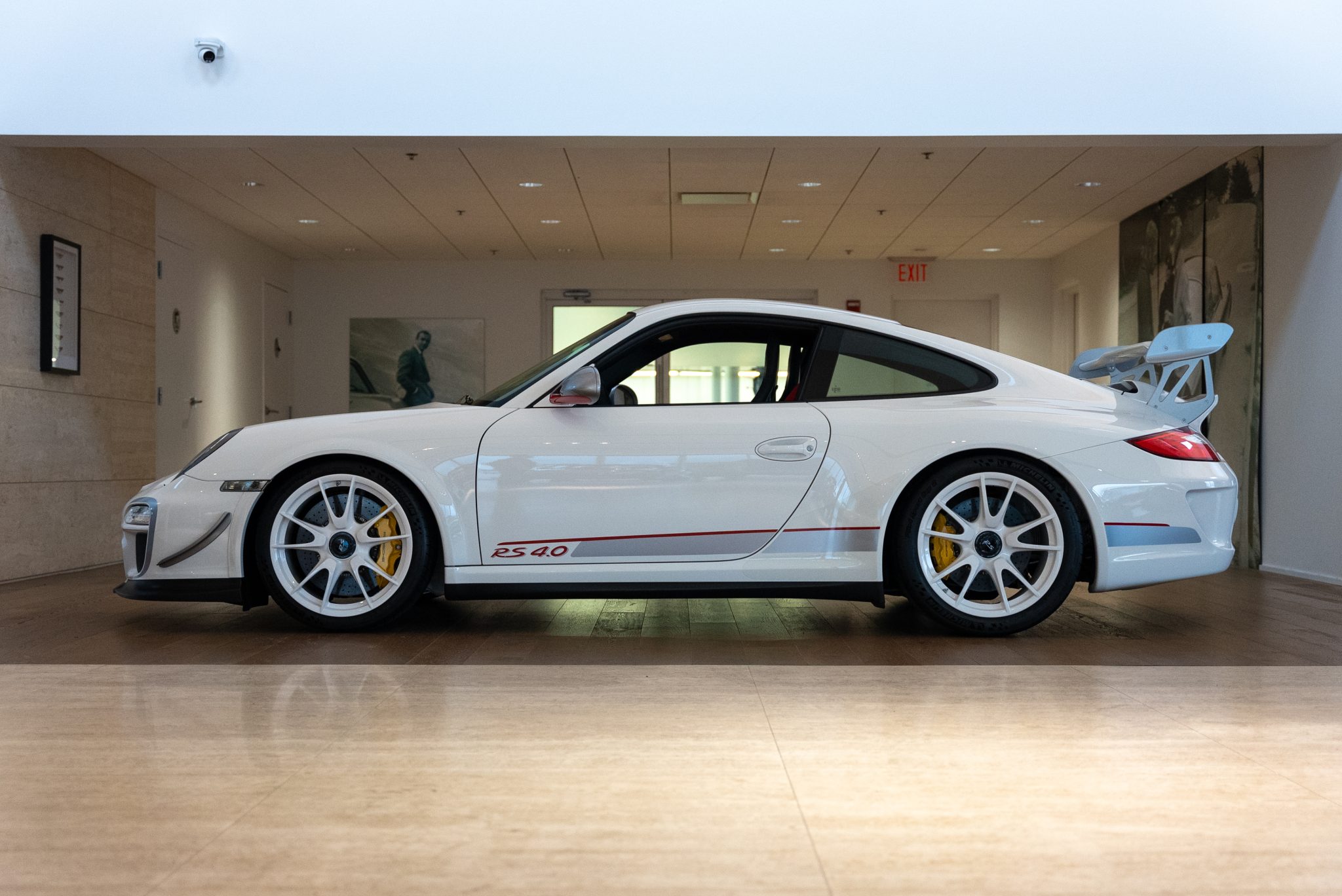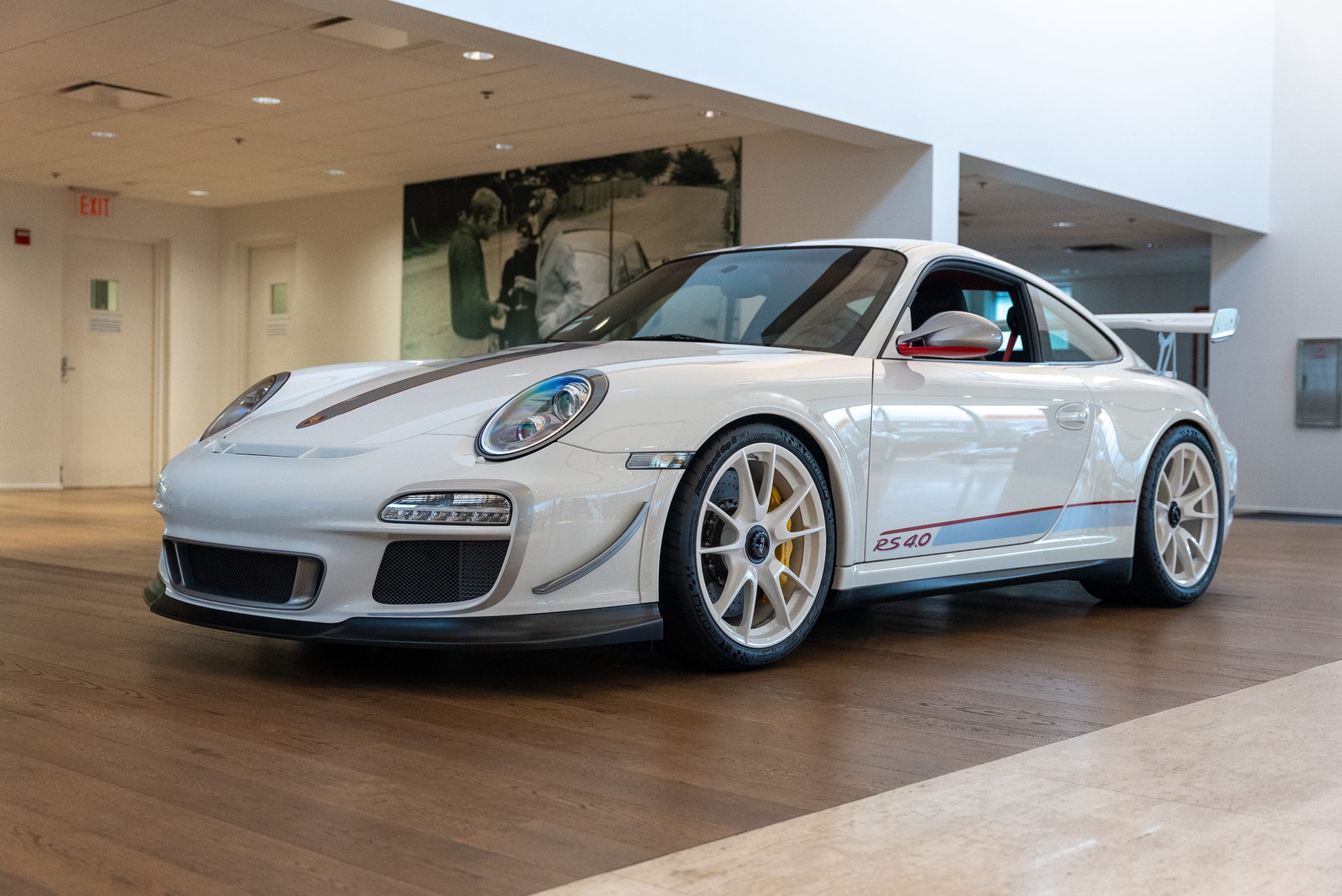 White 19″ center-locking multi-spoke wheels are mounted with Michelin Pilot Sport SP Cup2 tires measuring 245/35 up front and 325/30 out back. Braking is handled by Porsche-branded calipers over ceramic-composite rotors. The GT3 RS 4.0 was factory equipped with Porsche Active Suspension Management (PASM) featuring adjustable coilovers, and the car features a front axle lift system.