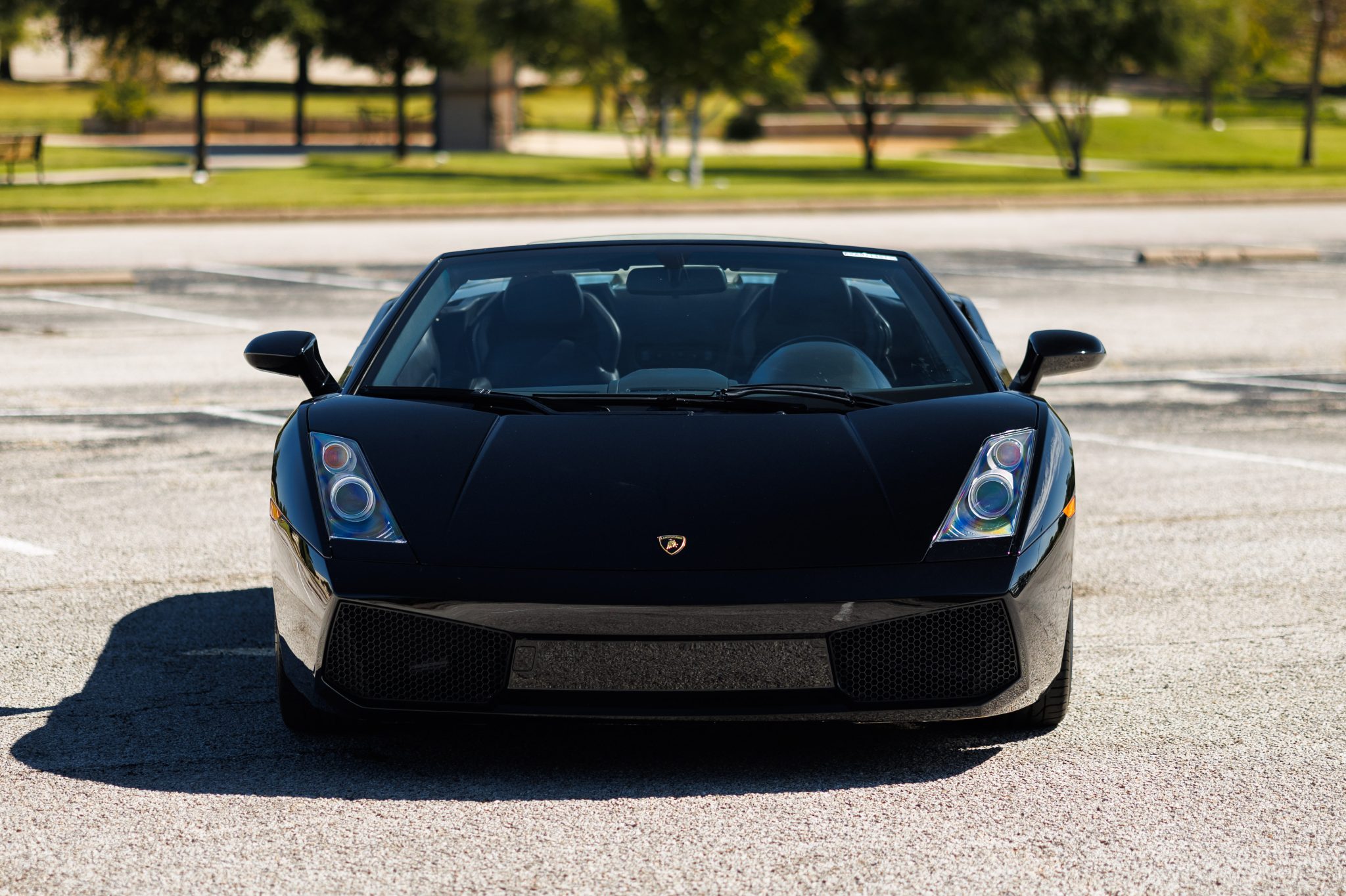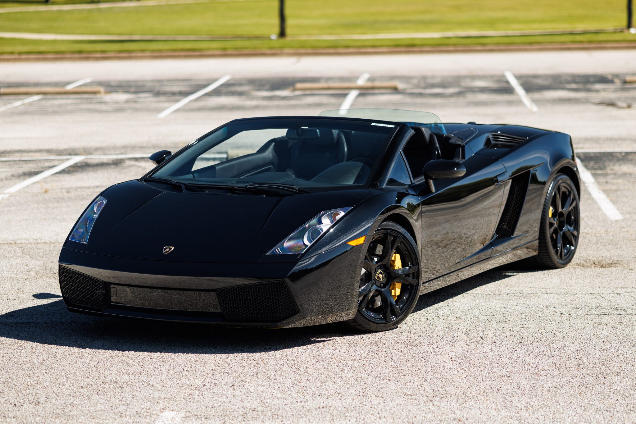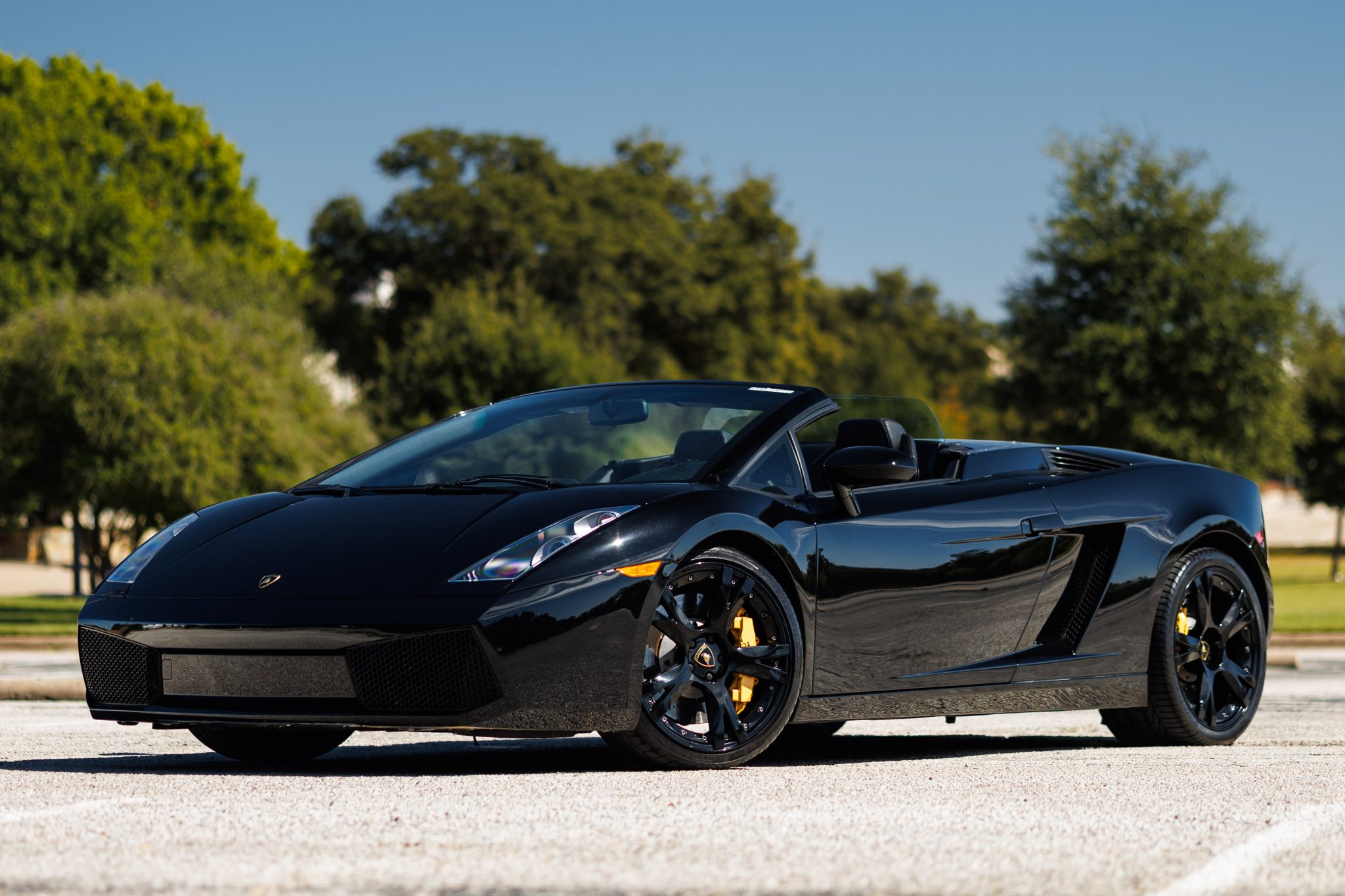 Black-finished 19″ Callisto wheels are mounted with Pirelli P Zero tires that measure 235/35 up front and 295/30 at the rear. Braking is provided by yellow-finished calipers with black Lamborghini script over cross-drilled and ventilated rotors at all four corners. The car is equipped with an optional front-axle lift system.