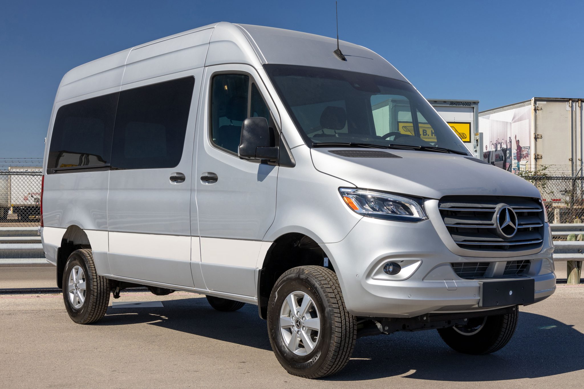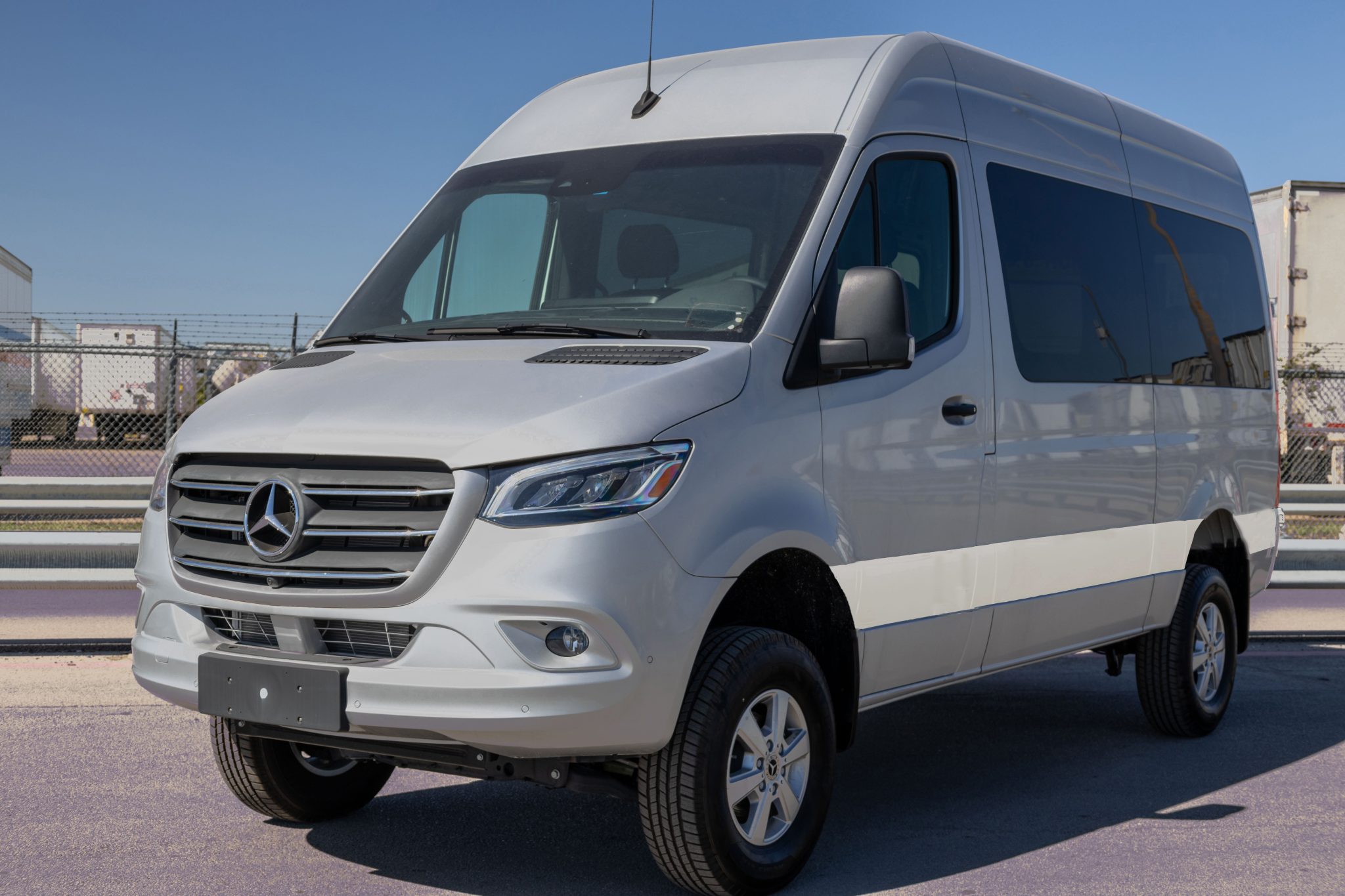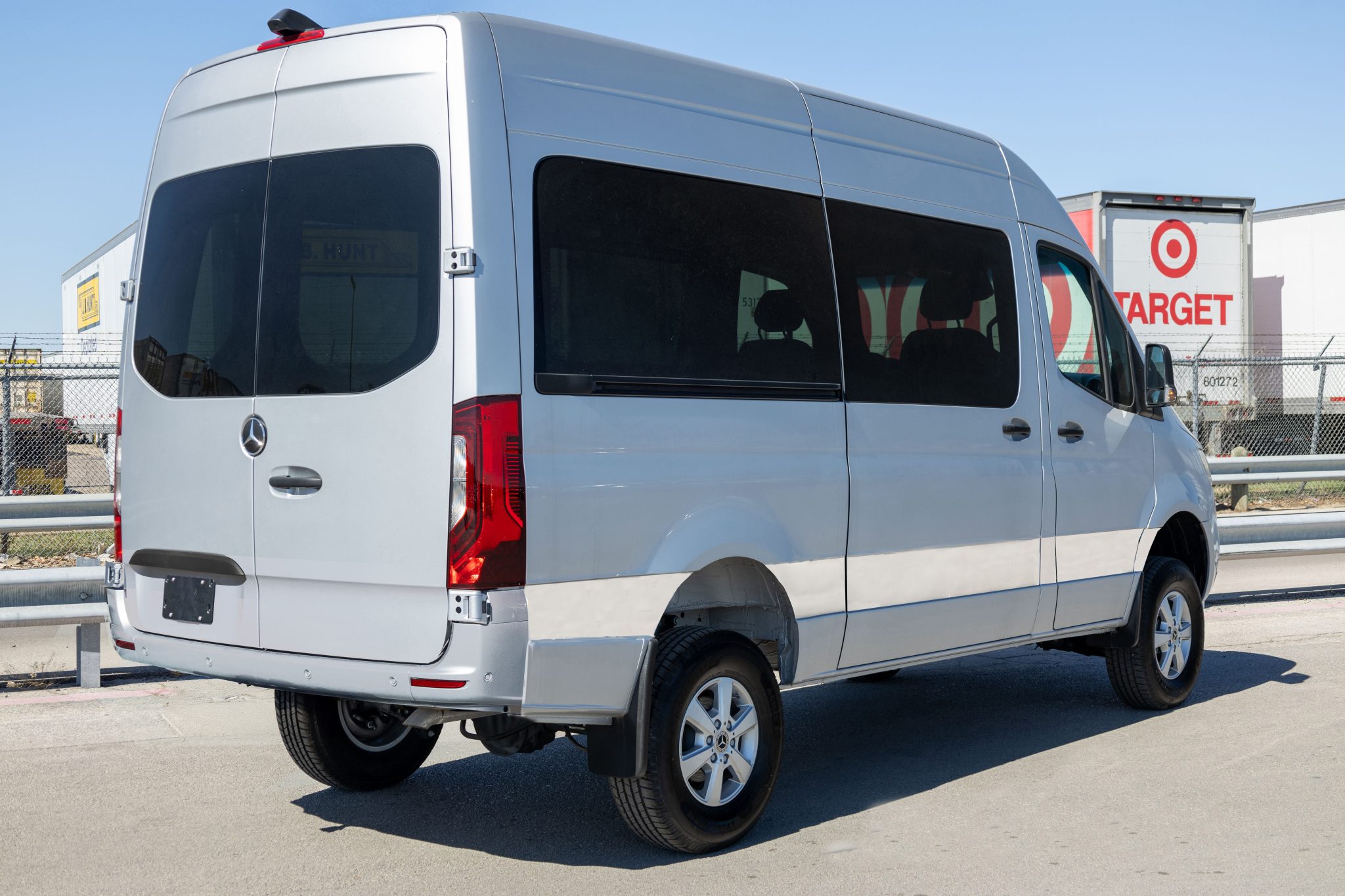 The 16″ six-spoke alloy wheels are mounted with 245/75 Michelin Agilis LTX tires. The van rides on independent front suspension and a solid rear axle, and braking is handled by anti-lock discs at all four corners. The chassis is equipped with an Electronic Stability Program (ESP).
