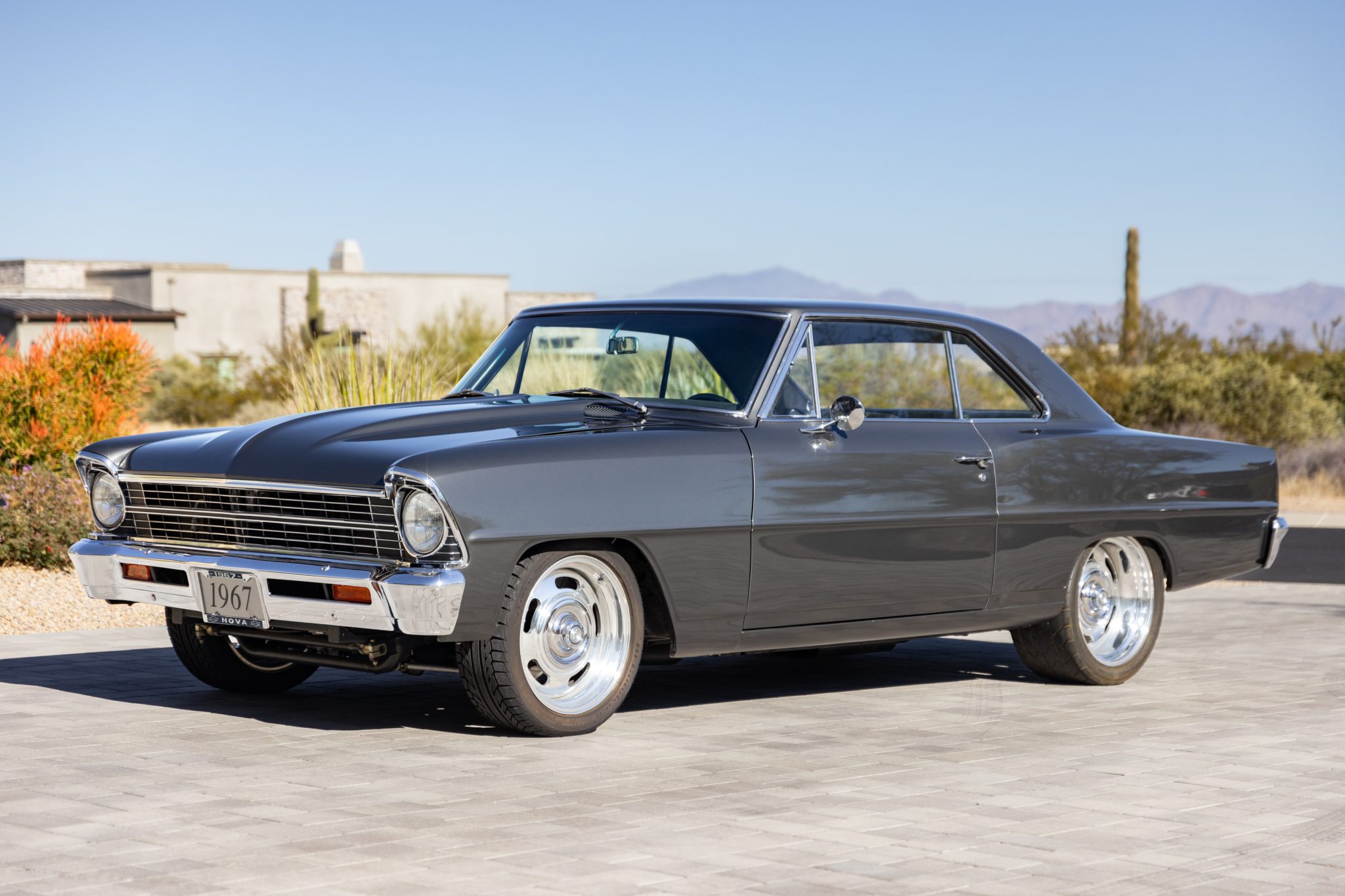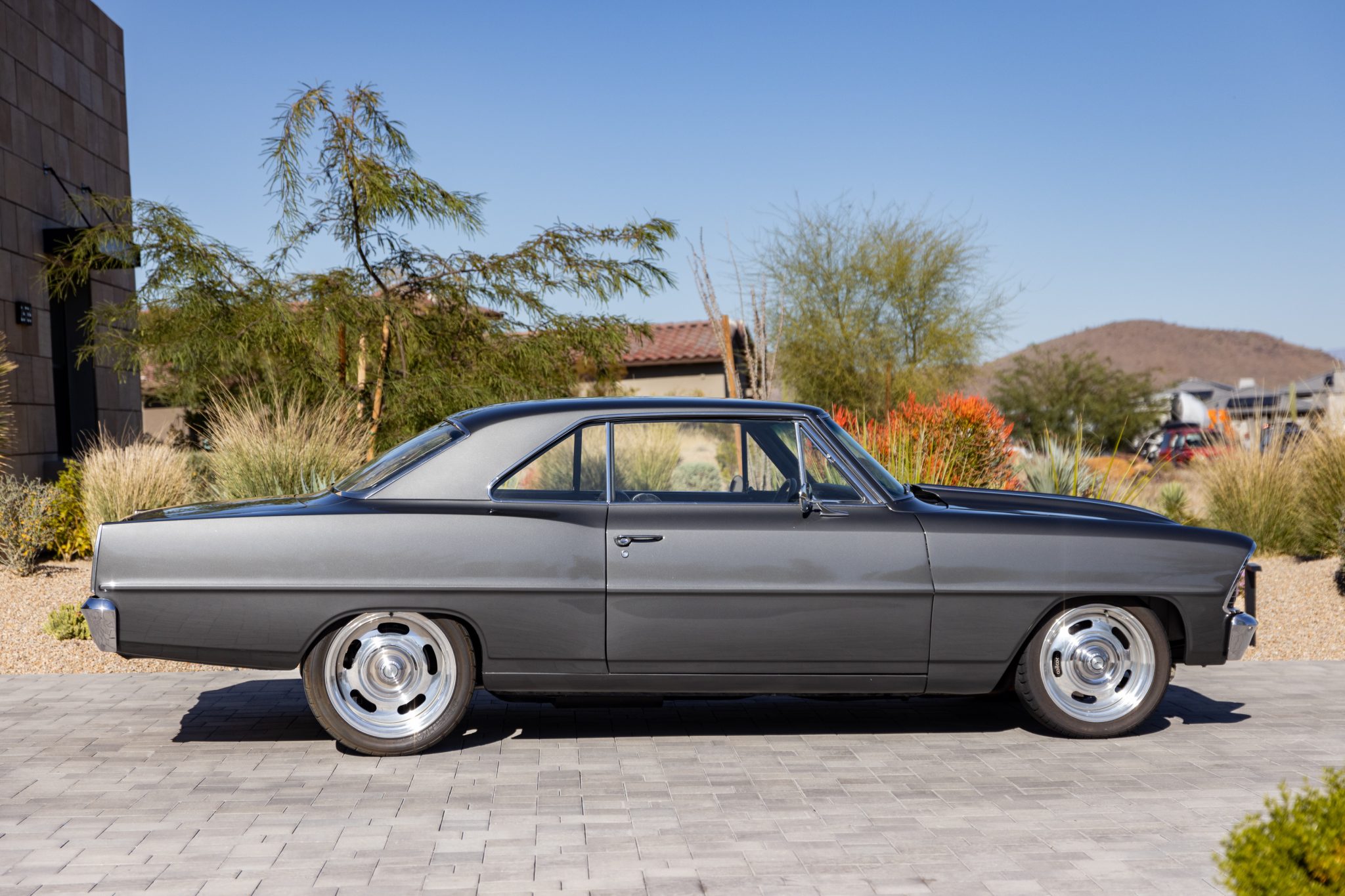Minitubbed rear wheel wells house 18″ Wheel Vintiques Rally-style wheels, while matching 17″ wheels are located at the front of the vehicle. BFGoodrich g-Force Sport Comp-2 front tires measure 225/45, while BFGoodrich g-Force T/A rear tires are 295/35; one of the front tires was replaced in 2020. A Heidts Pro-G tubular front subframe anchors control arms, QA-1 adjustable coilovers, and a Mustang II–style power-steering rack. The four-link rear also utilizes aftermarket subframe components and QA-1 adjustable coilovers. Braking is provided by power-assisted Wilwood discs at all four corners.