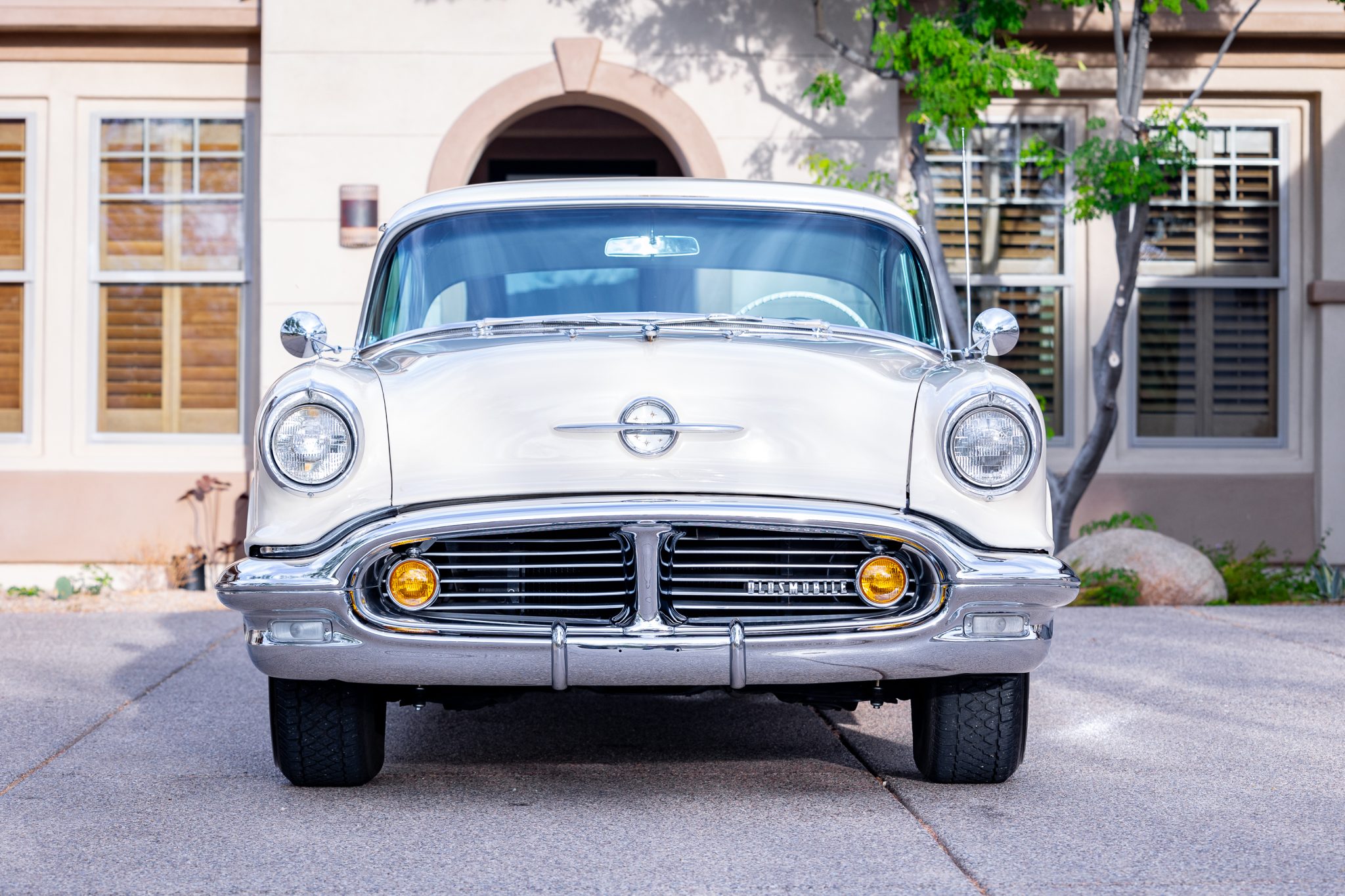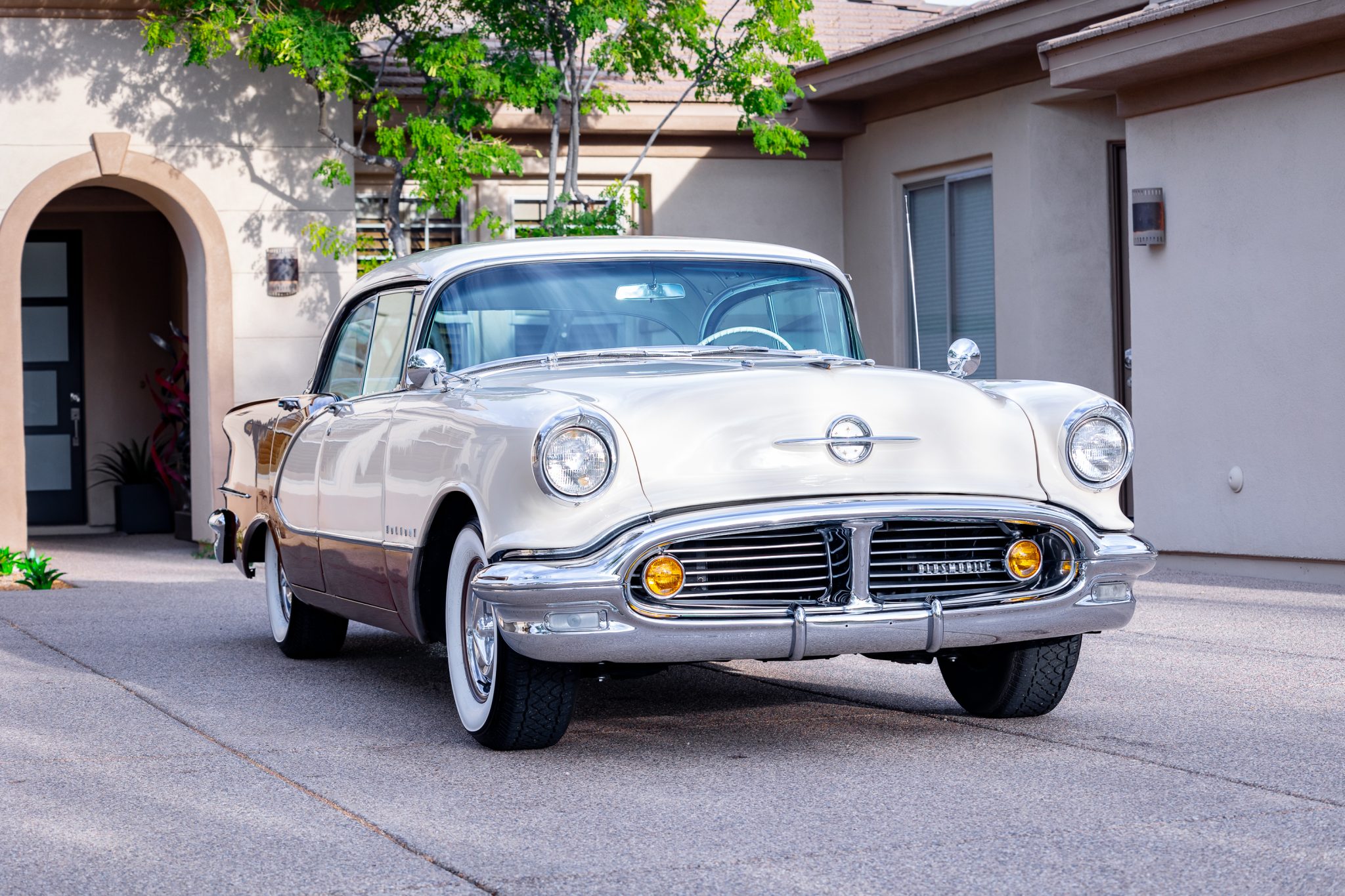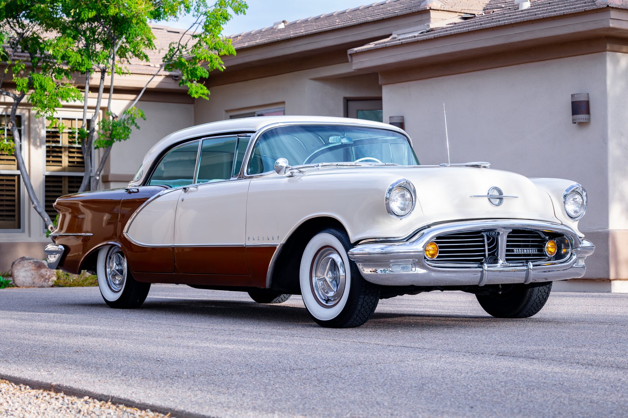 Bronze-finished 15″ steel wheels wear polished spinner-style covers and are mounted with reproduction Goodyear whitewall tires. The car is equipped with power-assisted steering.