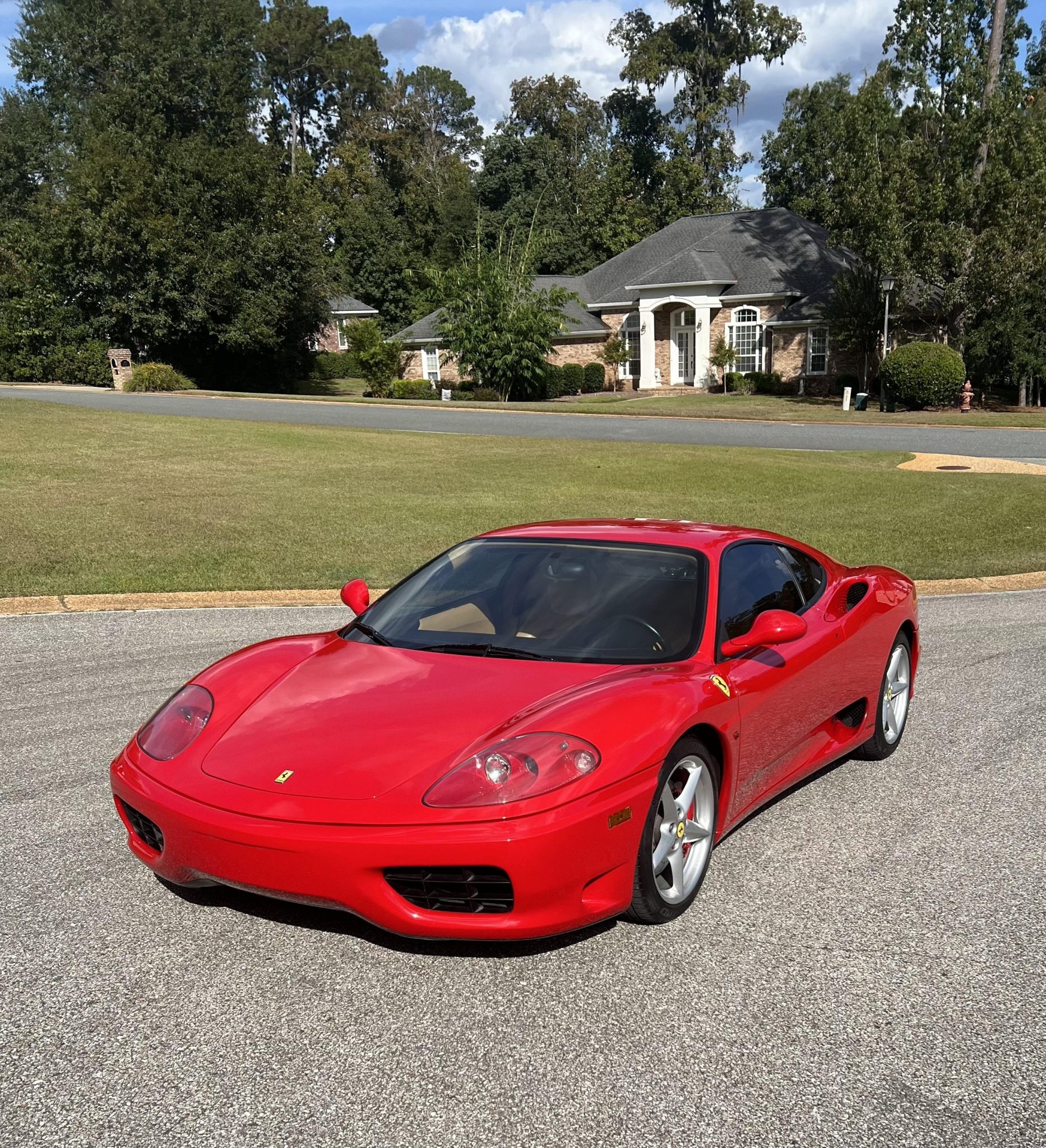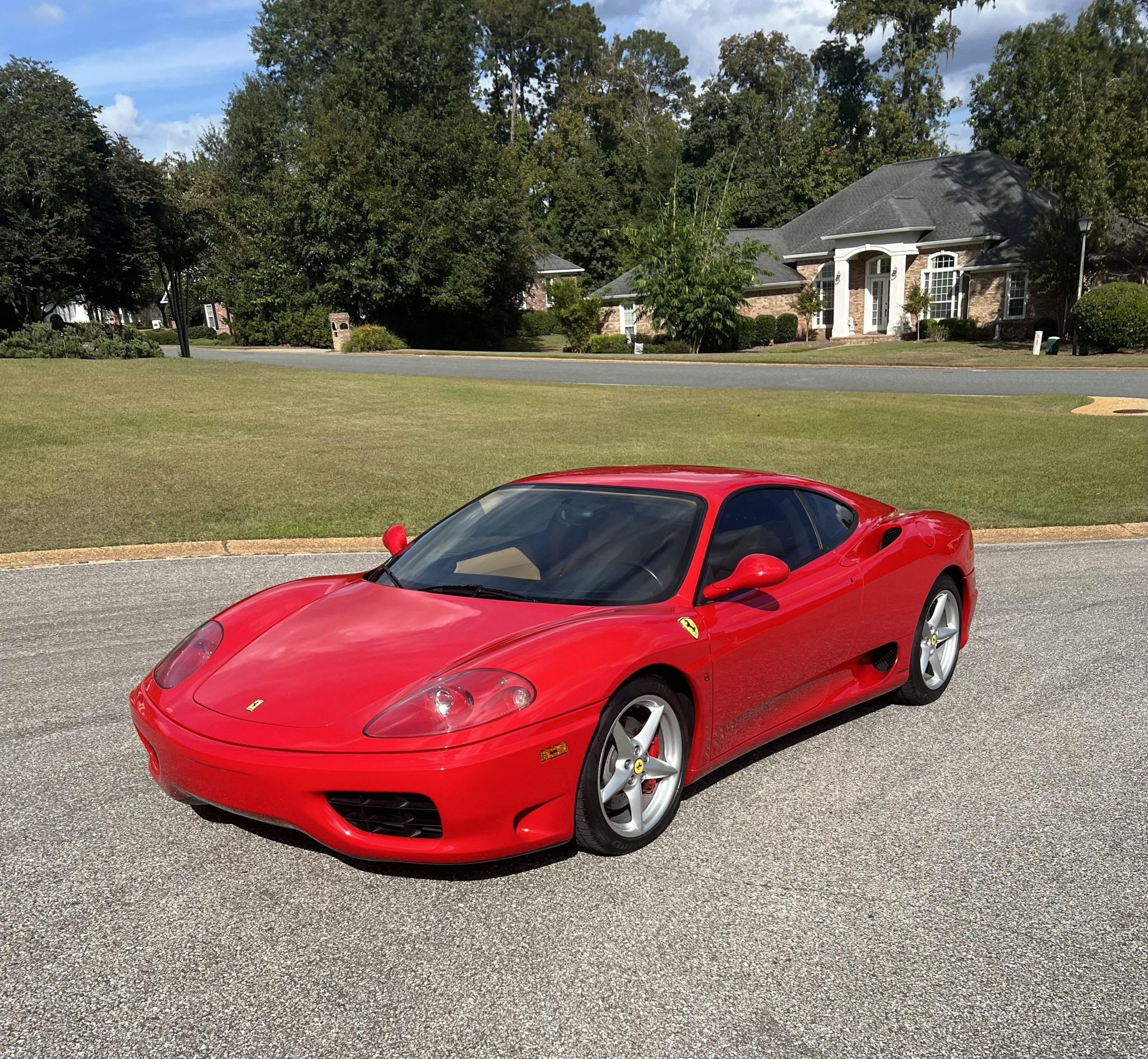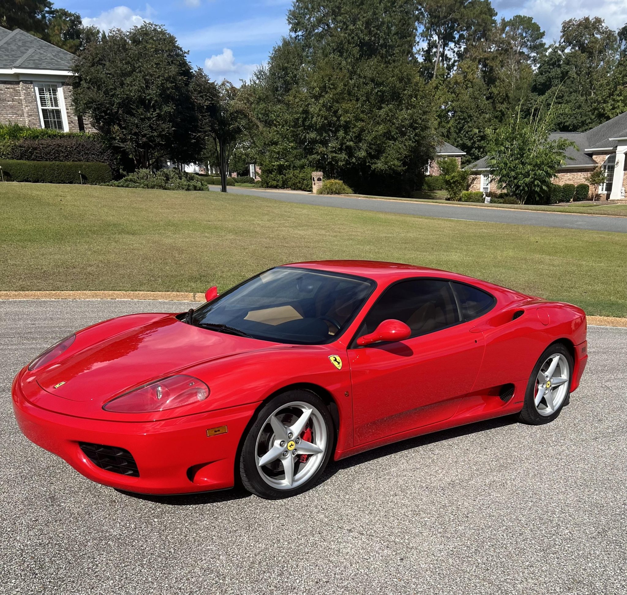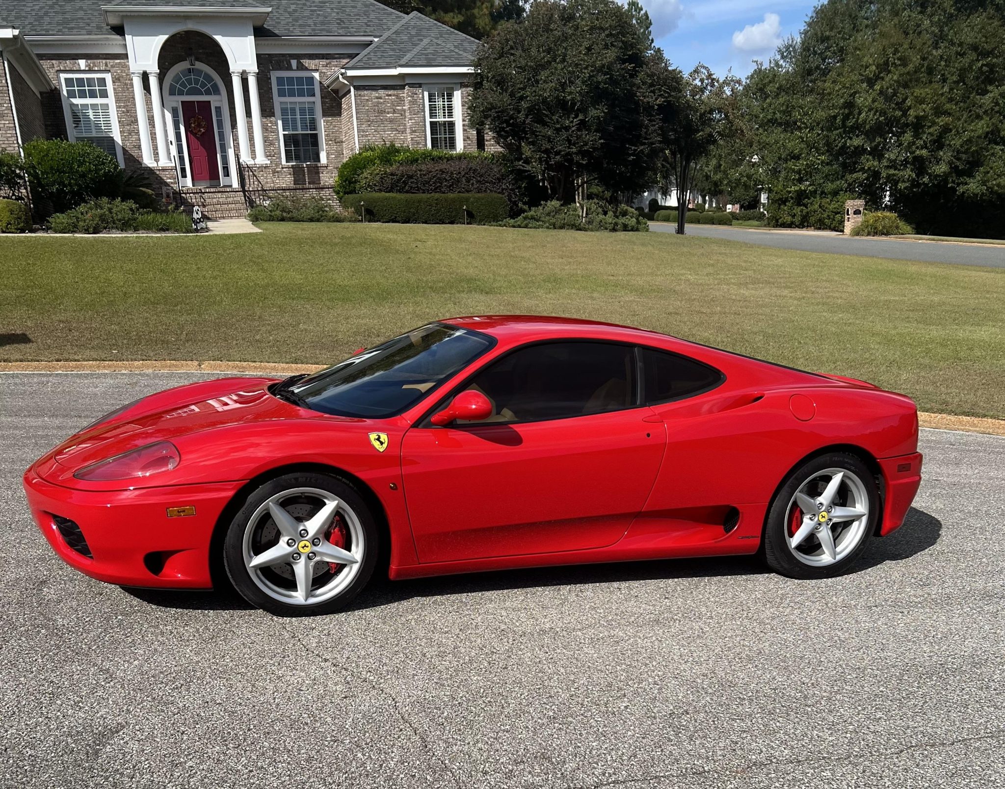 The 18″ five-spoke alloy wheels are mounted with Michelin tires. Stopping power is from red-finished Ferrari-branded calipers over cross-drilled and ventilated rotors at each corner. The right-side wheels have curb damage.