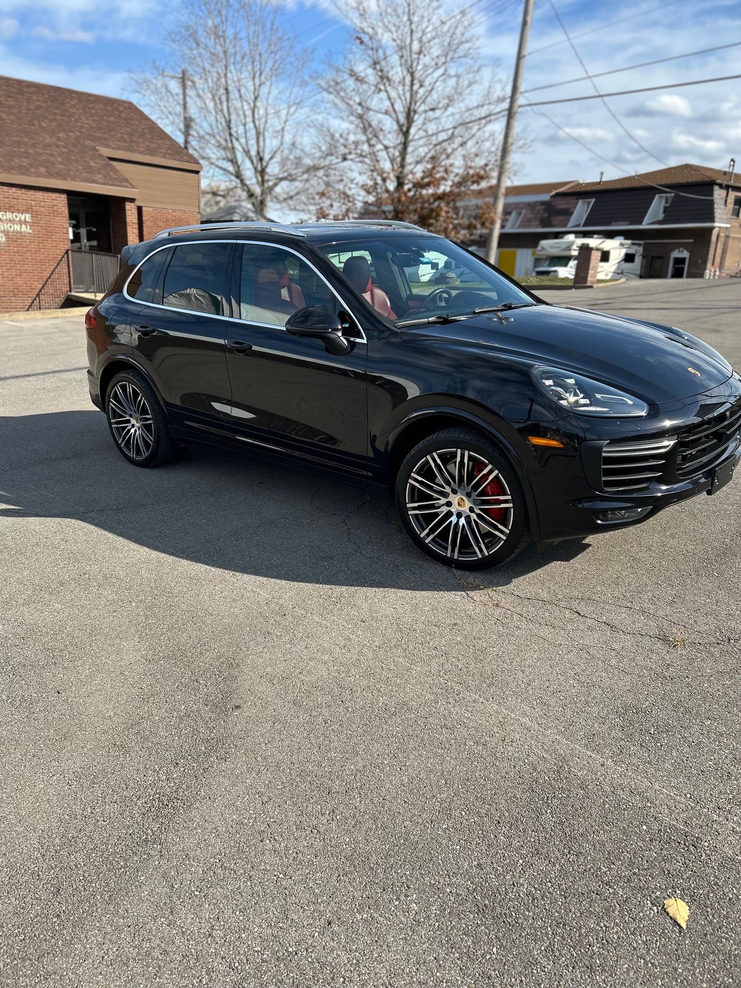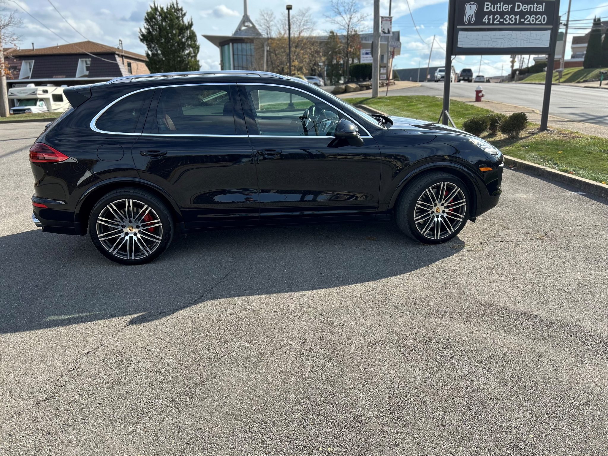 The 21″ 911 Turbo Design alloy wheels are mounted with 295/35 Michelin Latitude Sport 3 tires. The truck is equipped with an adjustable air suspension, Porsche Active Suspension Management (PASM), Power Steering Plus, and Porsche Dynamic Chassis Control (PDCC). Stopping power is provided by red-finished six-piston front and four-piston rear brake calipers over ventilated rotors at each corner.