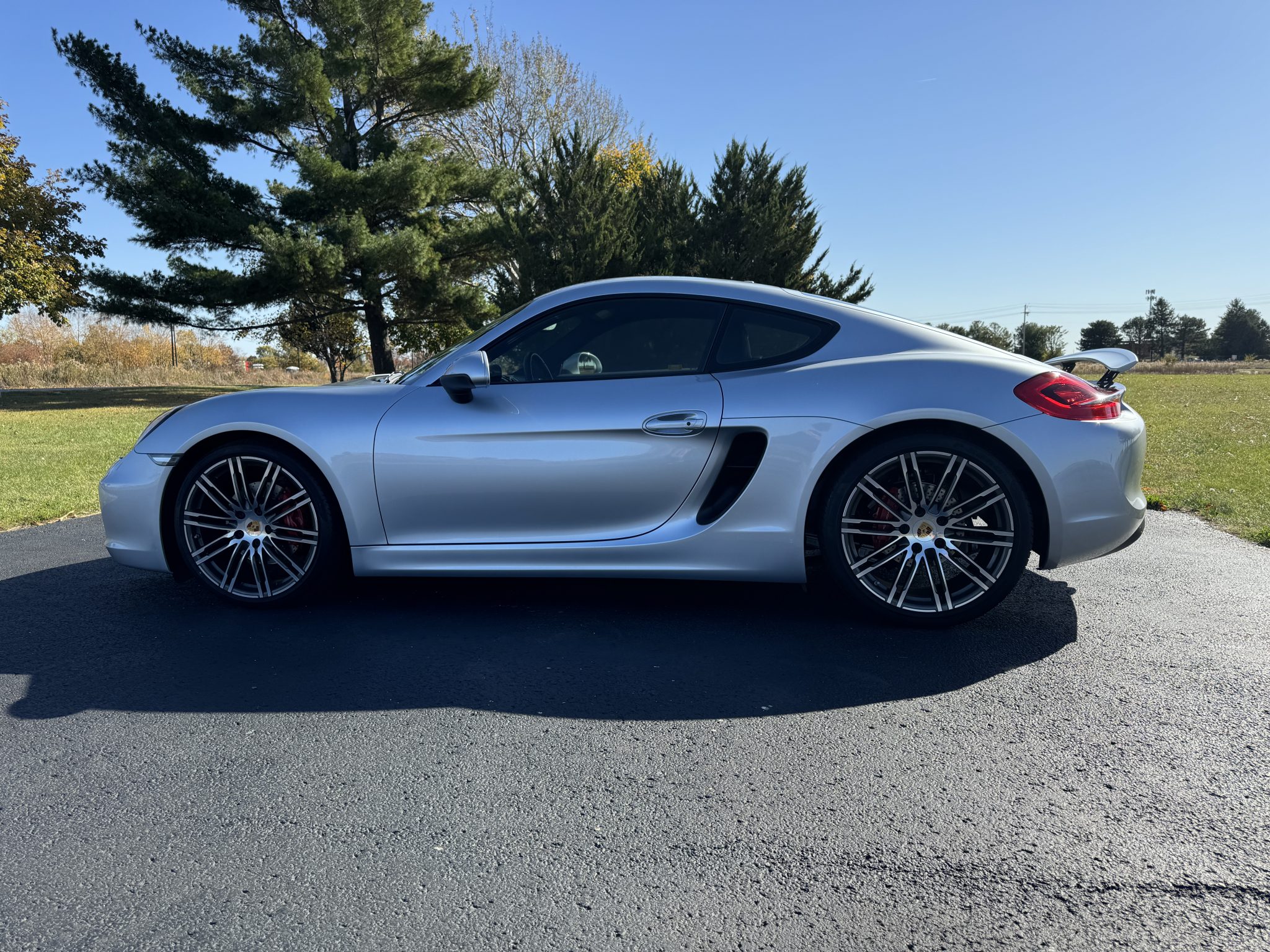 The 20″ Turbo Design alloy wheels are mounted with Pirelli P-zero tires measuring 235/35 up front and 265/35 at the rear. Braking is handled by four-wheel cross-drilled and ventilated discs with red-painted Porsche-branded calipers. The car is equipped with Porsche Active Suspension Management. A brake fluid flush was performed in September 2024.