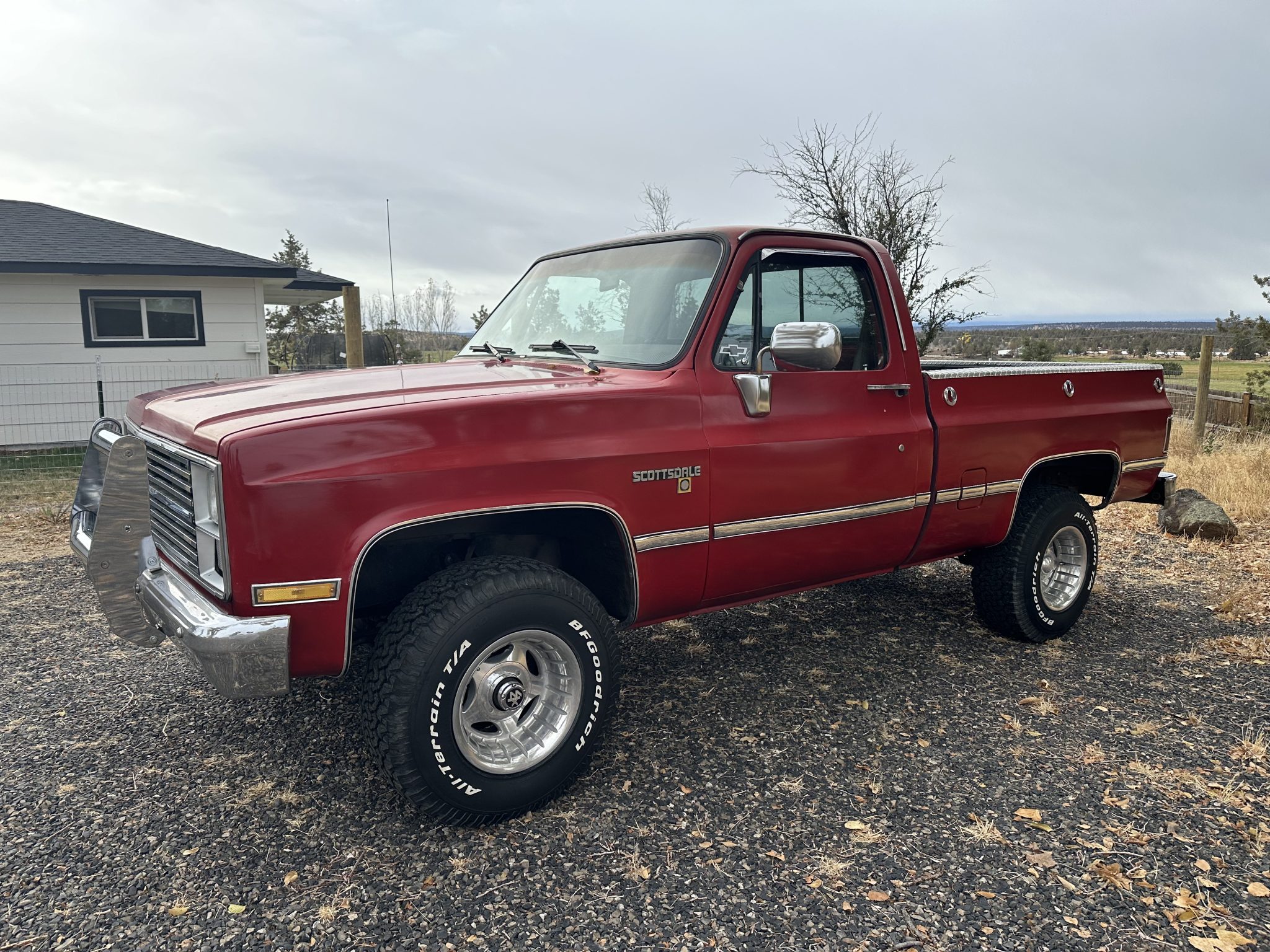 The five-spoke Centerline wheels are mounted with 31×10.5″ BFGoodrich All-Terrain T/A tires that were installed recently. The truck is equipped with automatic locking front hubs, and braking is provided by power-assisted front discs and rear drums.