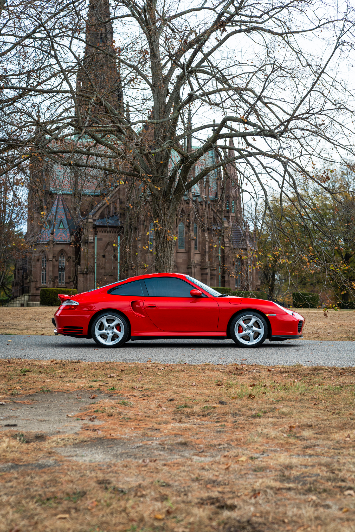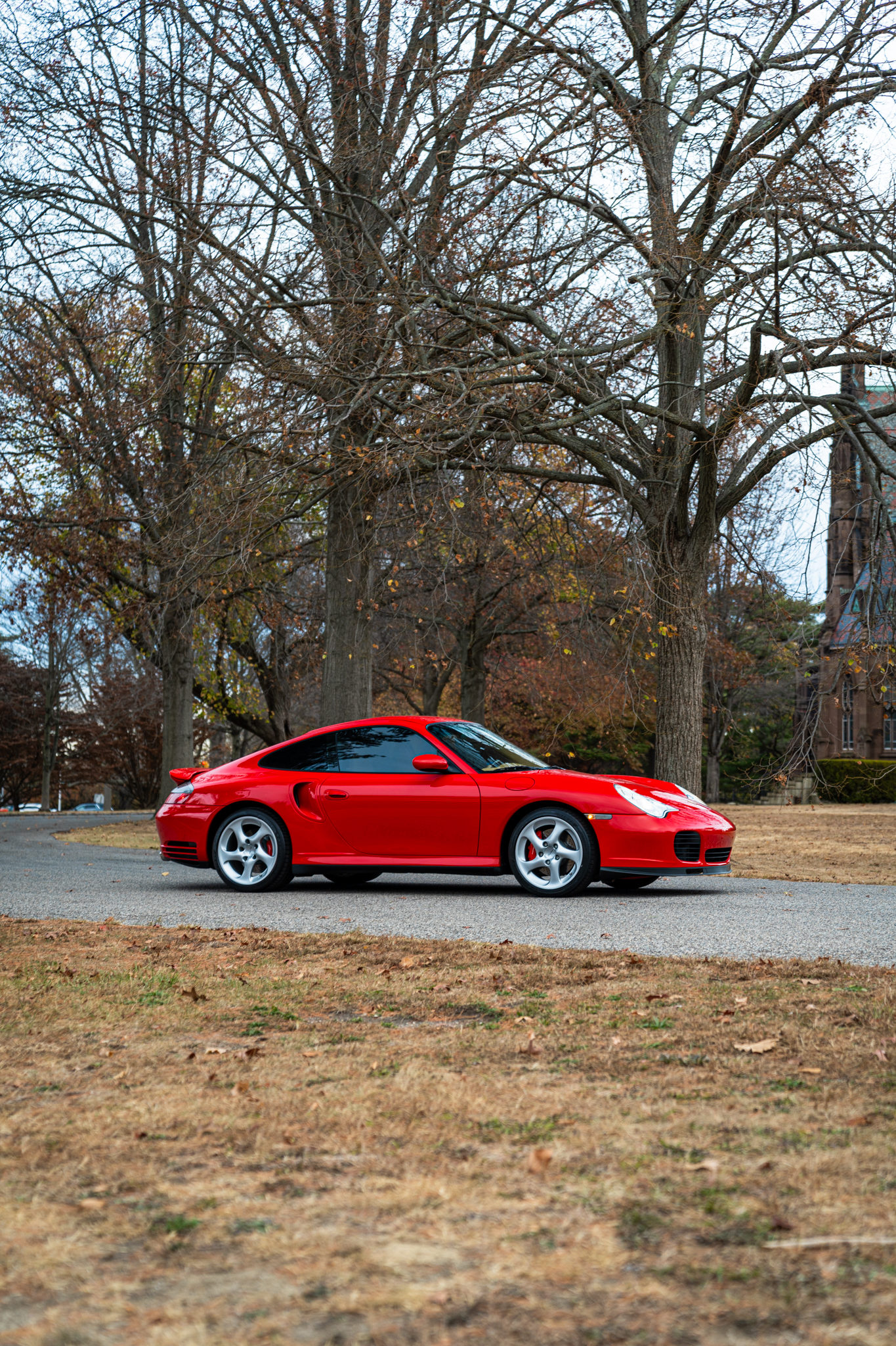 The 18″ Turbo Twist wheels are mounted with staggered-width Sumitomo tires. The car is equipped with Porsche Stability Management (PSM) and an automatic brake differential. Braking is from vented and cross-drilled rotors at all four corners.