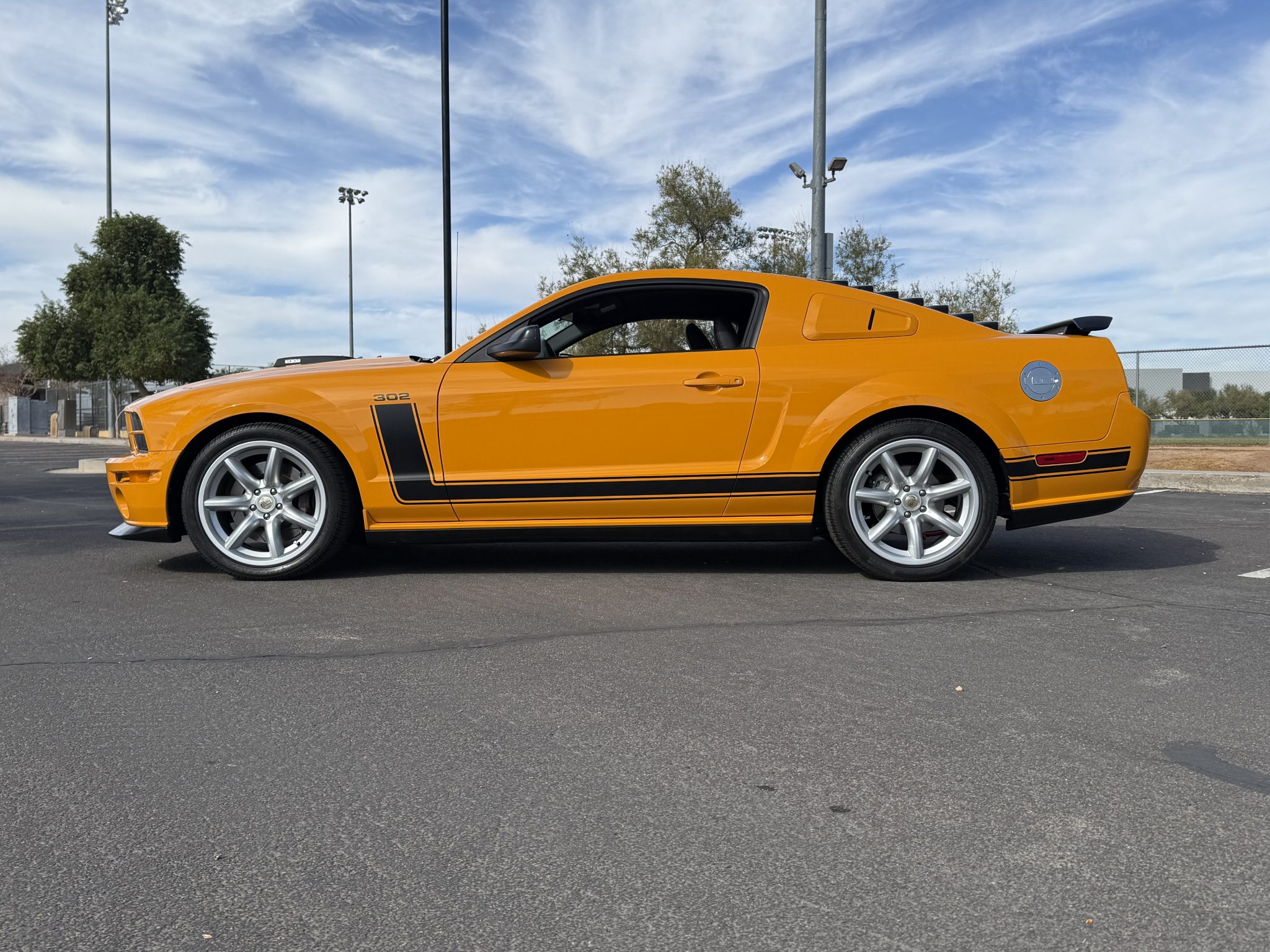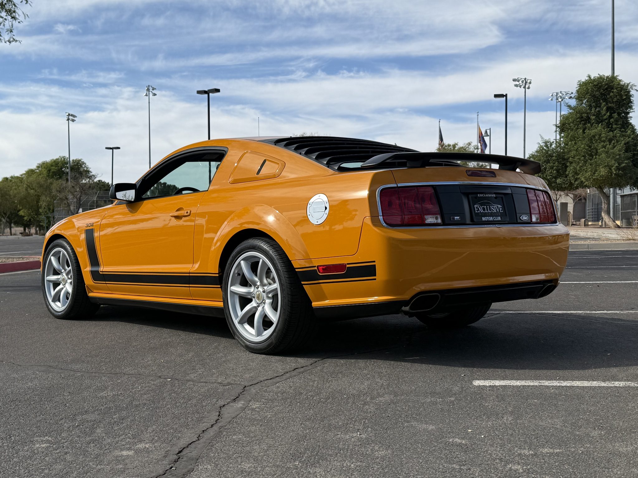 The 19″ seven-spoke wheels feature edition-specific center caps and are mounted with Pirelli tires. The car is equipped with Saleen suspension components, and stopping power is provided by four-wheel disc brakes with four-piston front calipers over slotted rotors.
