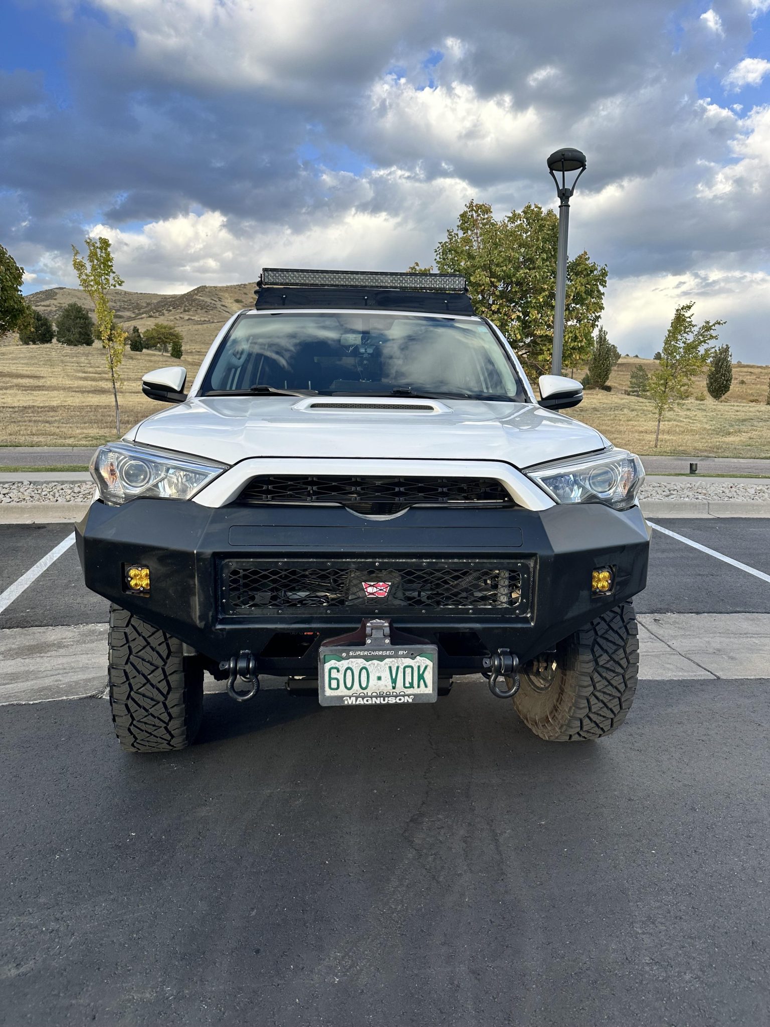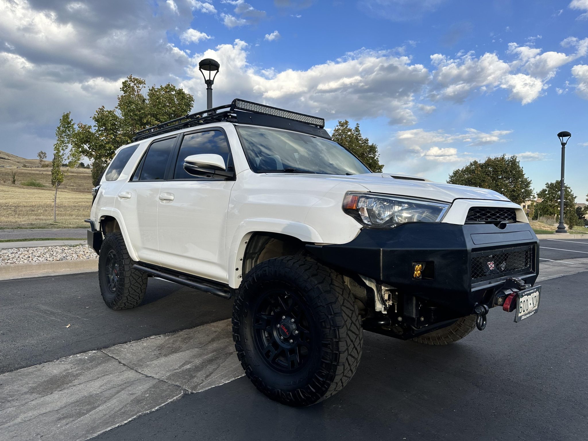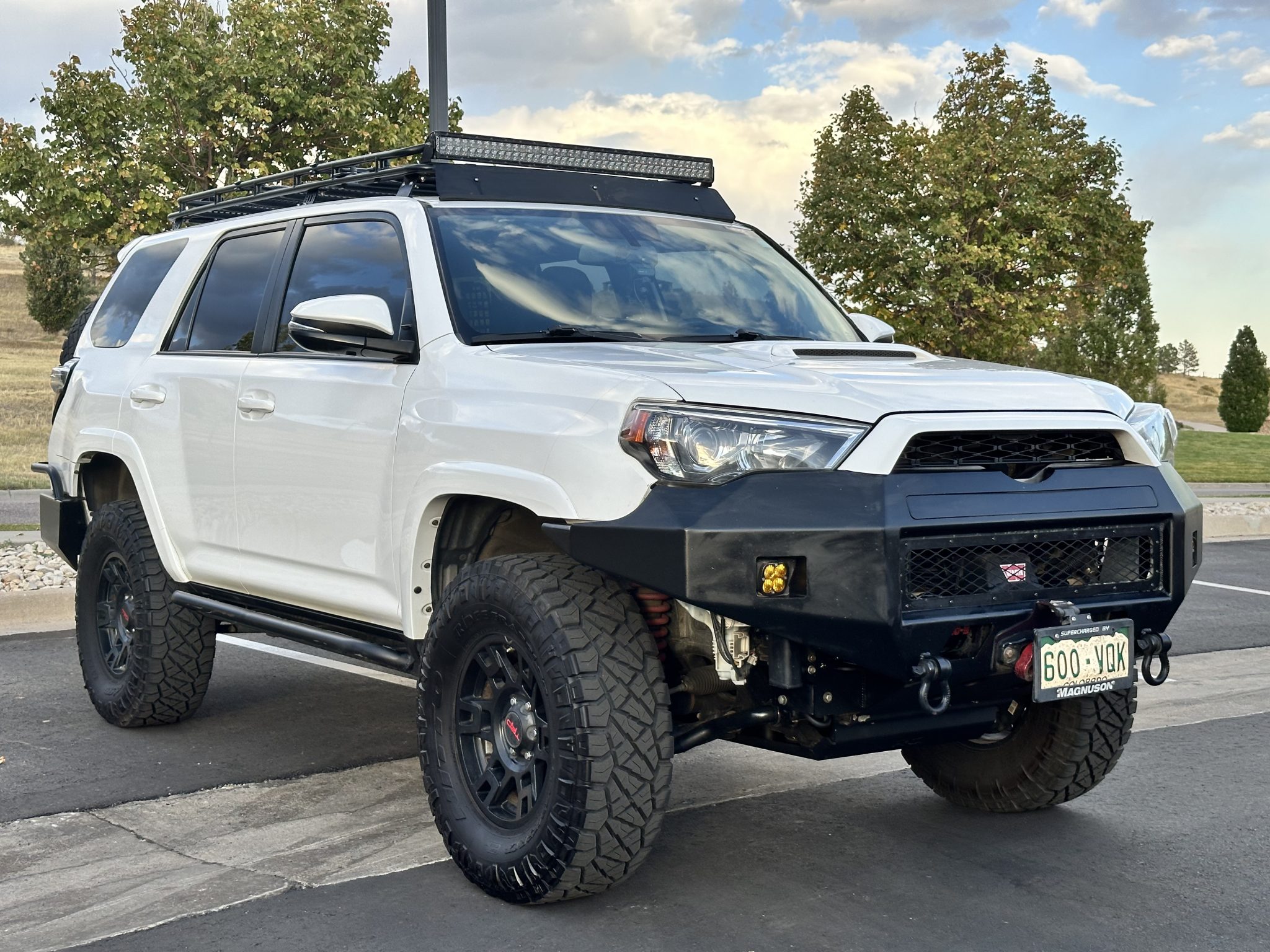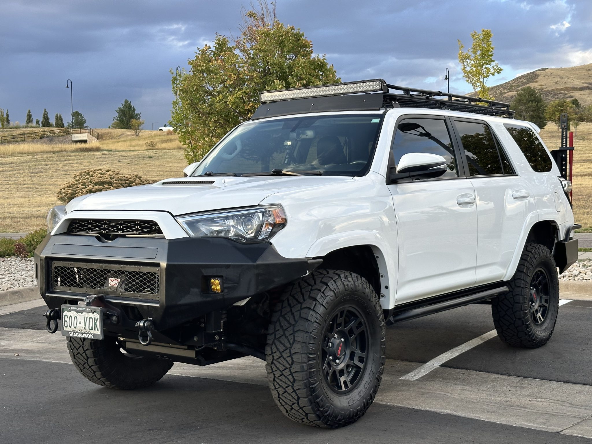 Matte black 17″ TRD alloy wheels are mounted with Nitto Ridge Grappler tires measuring 285/75, and braking is provided by anti-lock ventilated discs at each corner. The truck was modified with a ToyTec lift kit, and Fox shocks were installed up front in November 2024.