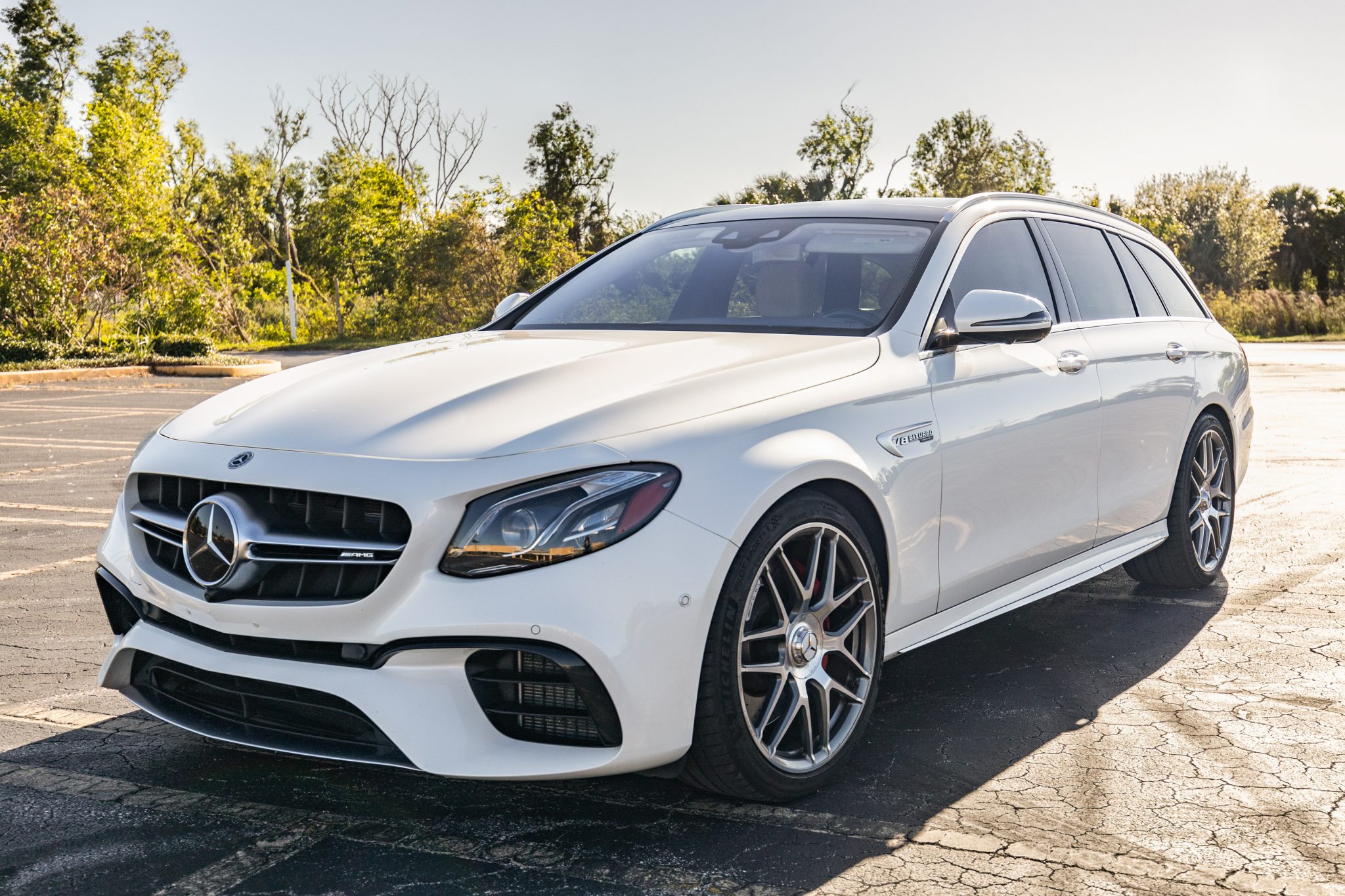 The 20″ AMG forged cross-spoke wheels are mounted with Michelin tires. The car is equipped with an Air Body Control AMG Sport Suspension and an Electronic Stability Program (ESP). Stopping power is provided by red-finished AMG-branded brake calipers over cross-drilled and slotted rotors at all four corners. A brake fluid flush was performed and the front brake pads were replaced in February 2024.