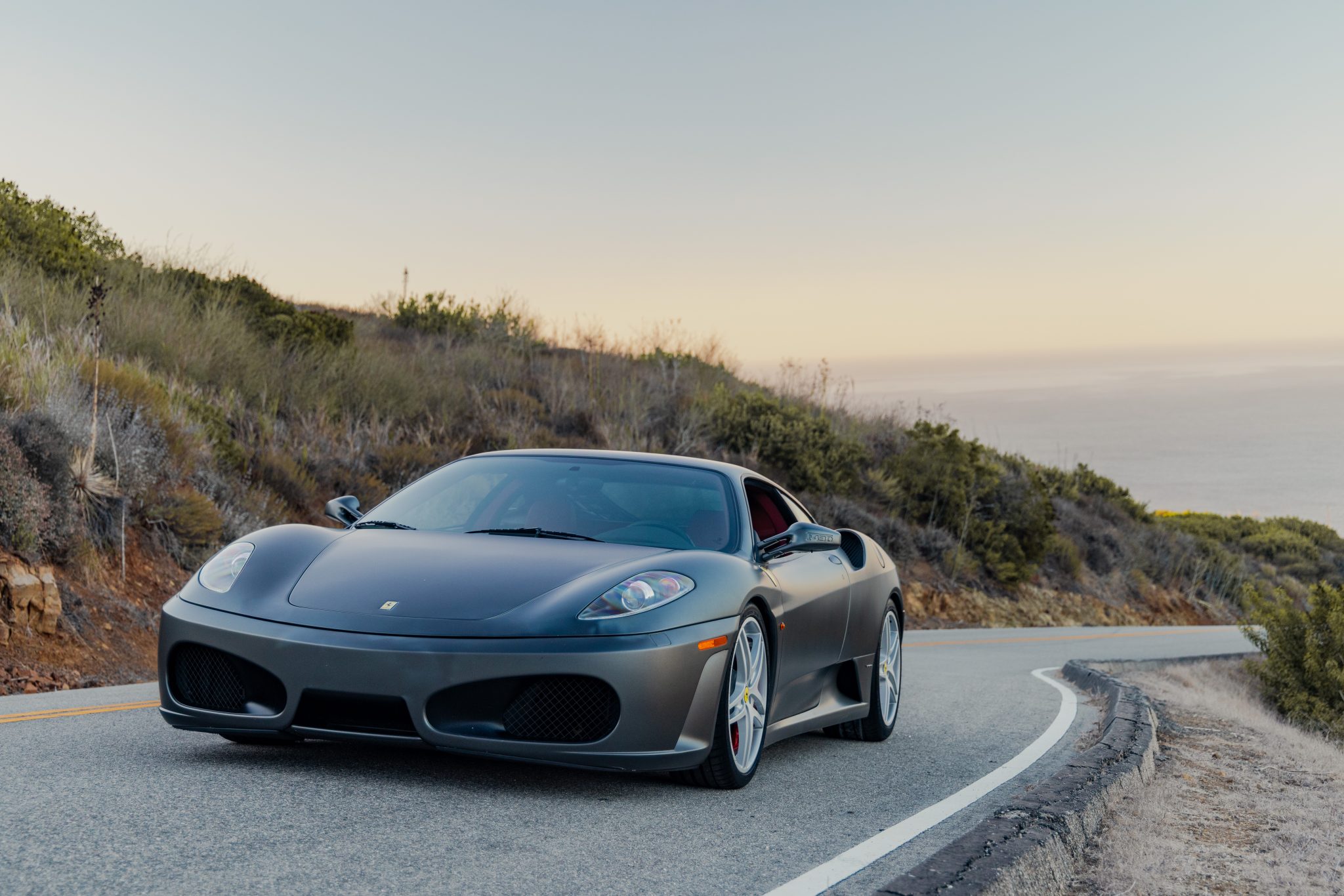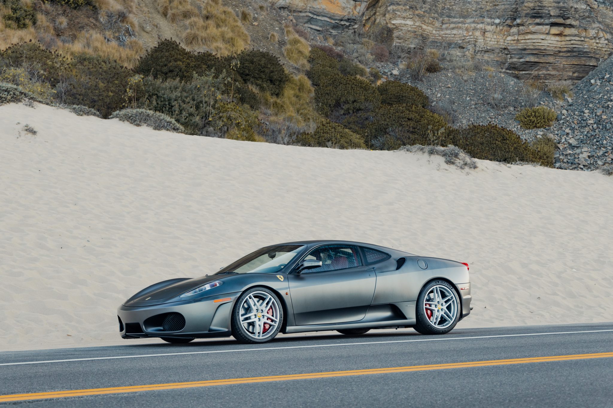 Refinished 19″ split-spoke alloy wheels are mounted with Michelin Pilot Sport 4S tires. Braking is handled by red Ferrari-branded brake calipers over a cross-drilled carbon-ceramic rotor at each corner. The left and right lower ball joints were replaced in 2021.