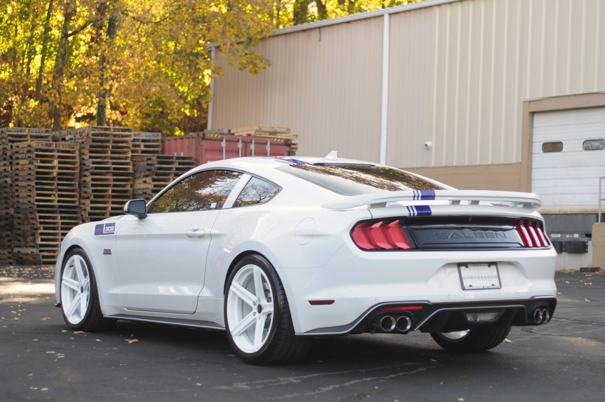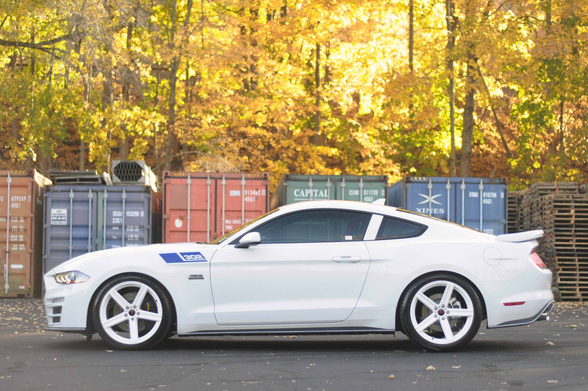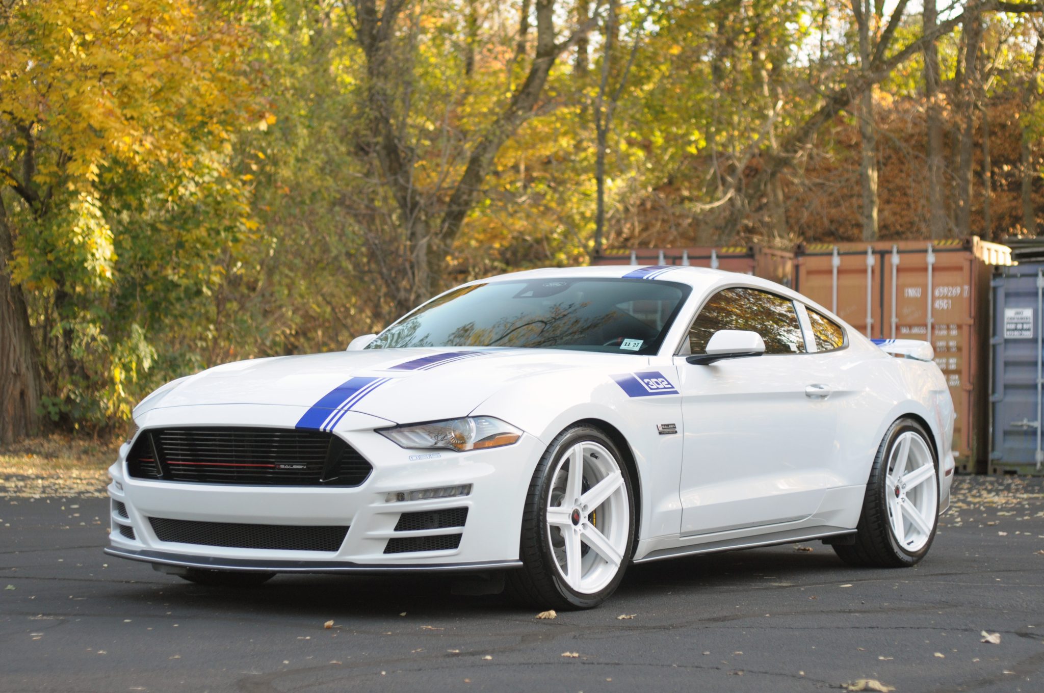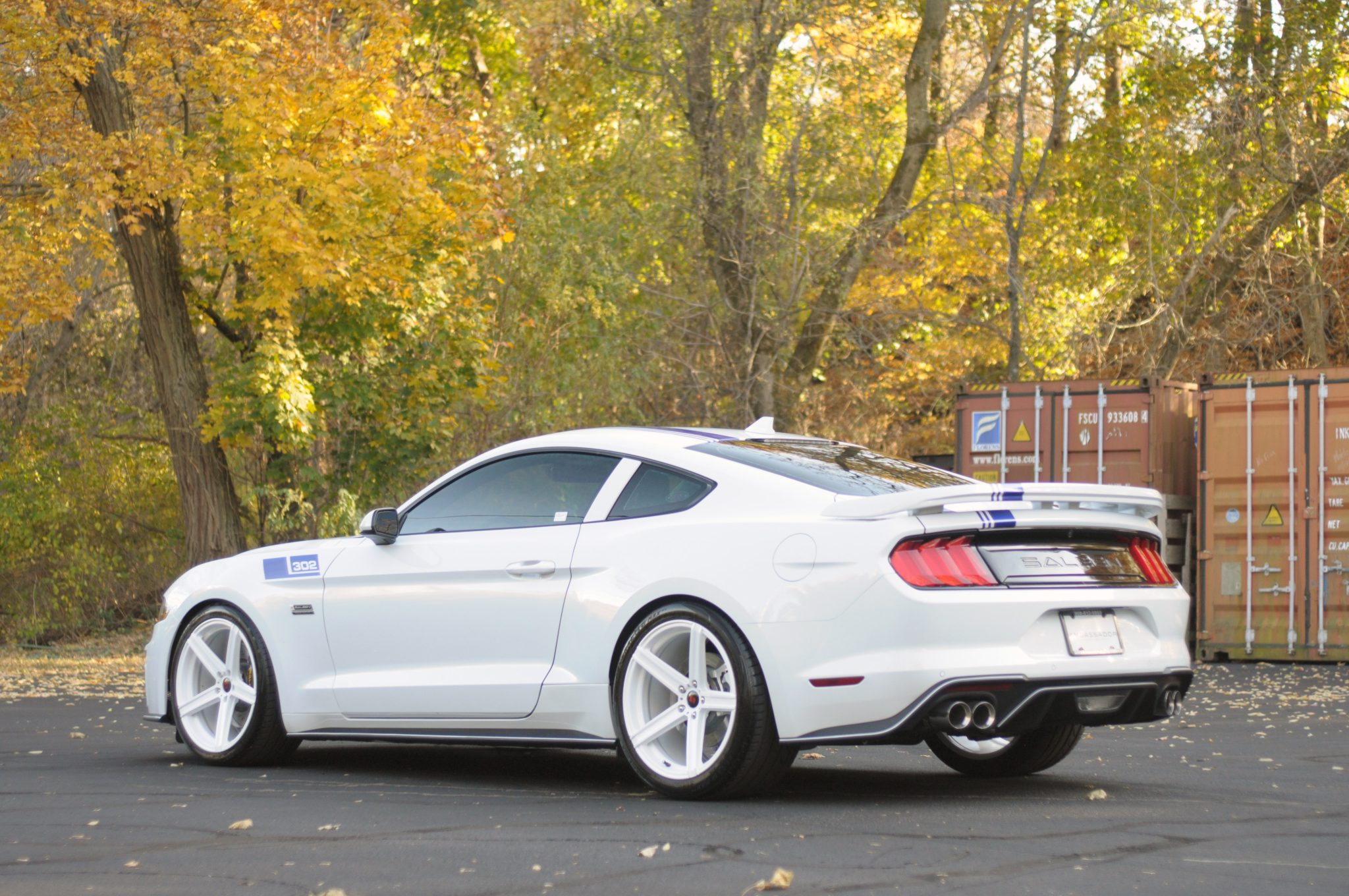 White-finished 20″ staggered-width alloy wheels are wrapped in General G-MAX RS tires. The car features S4 springs and a front strut tower brace. The braking system has Saleen Performance pads and black-finished calipers over slotted rotors up front.