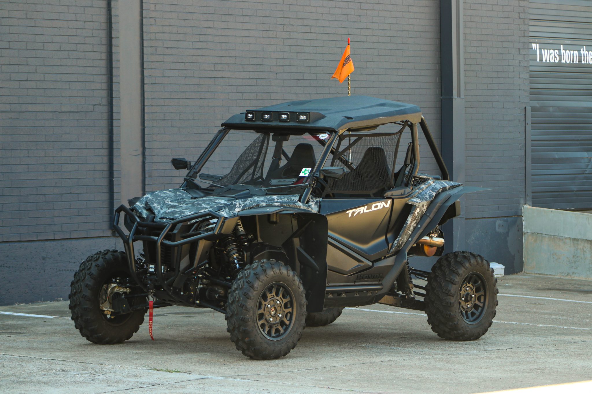 Black-finished 15″ alloy wheels are mounted with 28×9.00″ front and 28×11.00 rear Maxxis tires. The Talon 1000R features FOX Live Valve suspension that automatically adjusts the damping of each 2.5″ piggyback shock individually up to 200 times per second. The independant double-wishbone front suspension has 17.7″ of travel and the rear four-plus-link trailing-arm rear has 20.1″ of travel, and all shocks feature dual-rate springs. Braking is from 250mm hydraulic discs at all four corners.