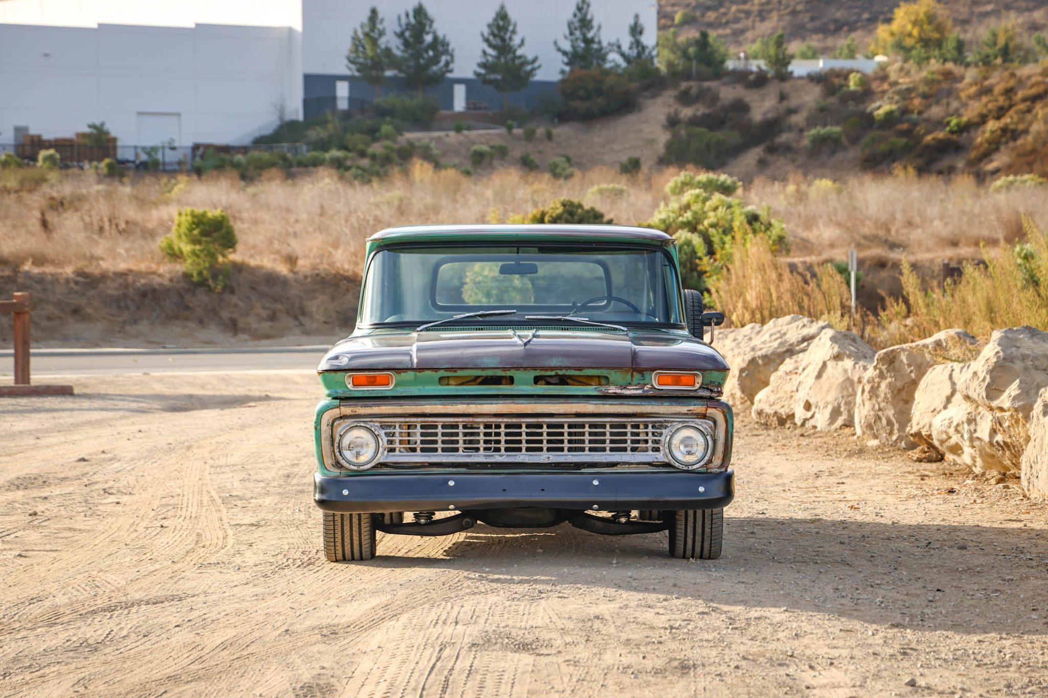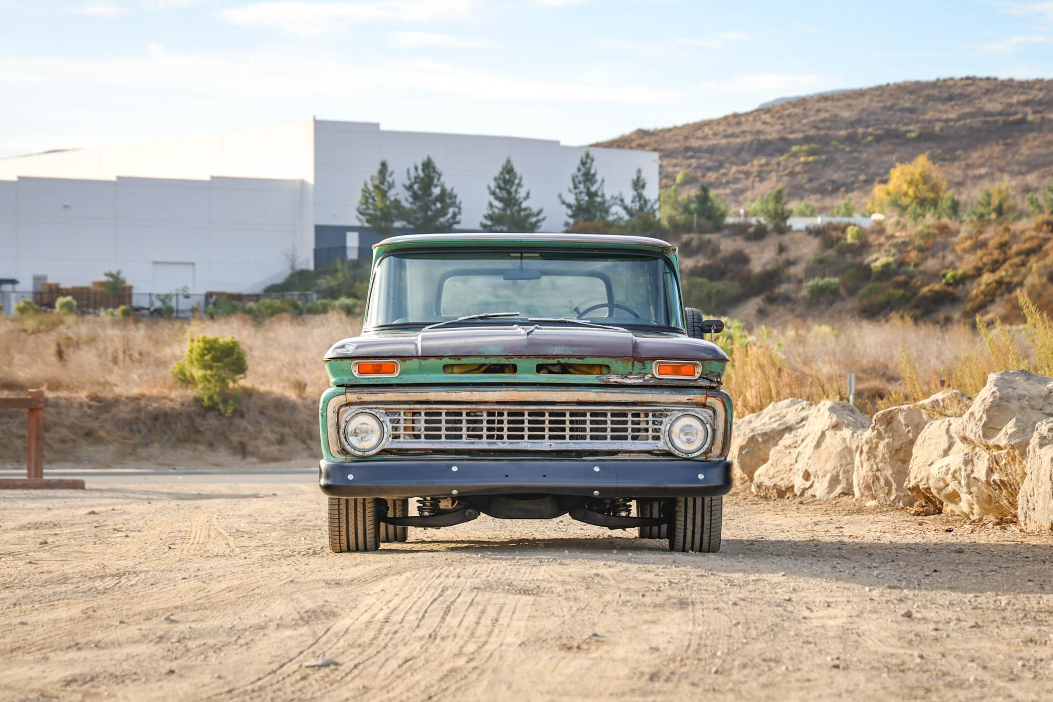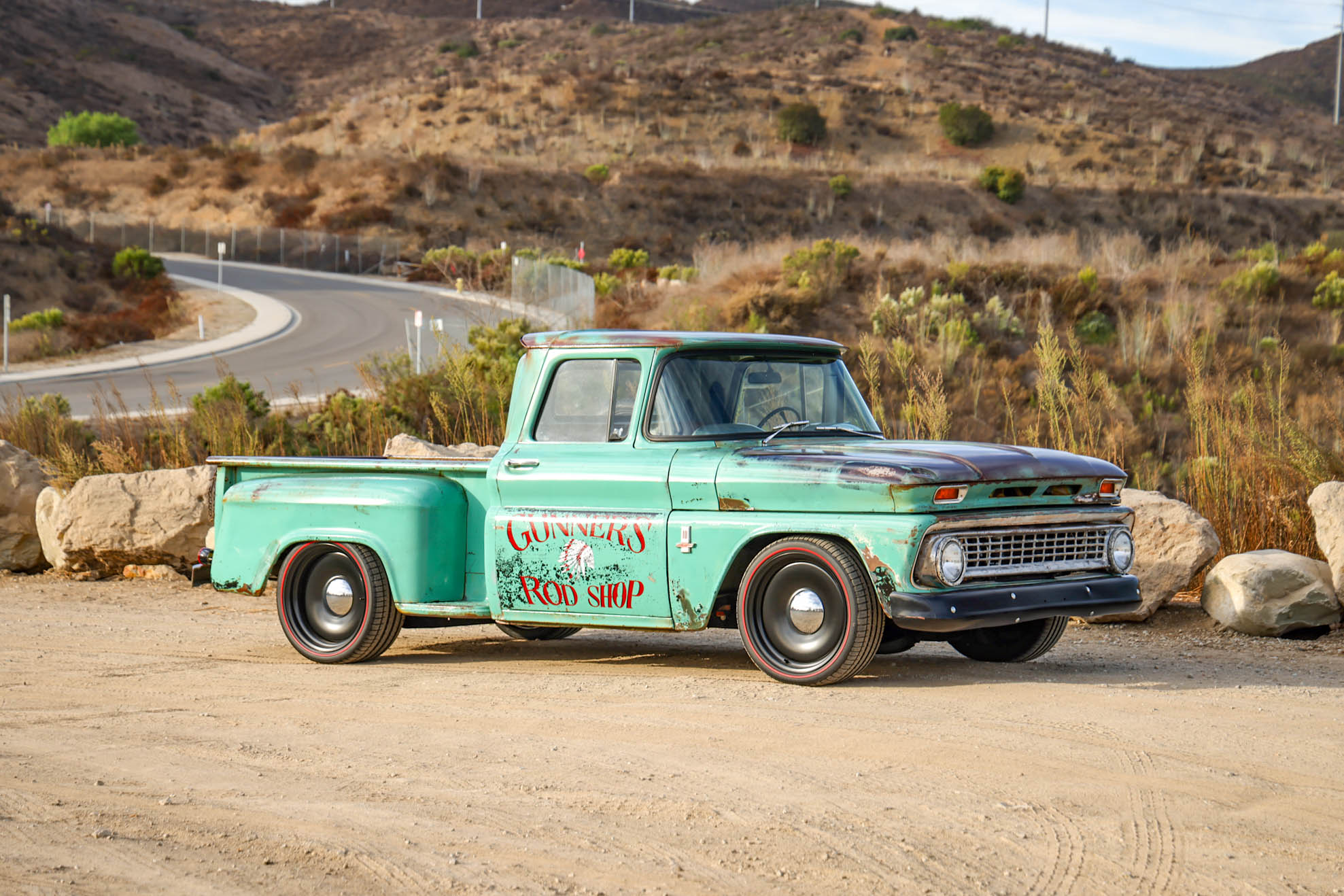 A previously installed air suspension system was removed and replaced with front and rear coilovers in 2023. Black-finished Detroit Diesel Smoothie wheels were added and mounted with redline tires in May 2023, and the front brake lines were re-routed earlier that year. The truck is equipped with power-assisted steering, and braking is handled by power front discs and rear drums.
