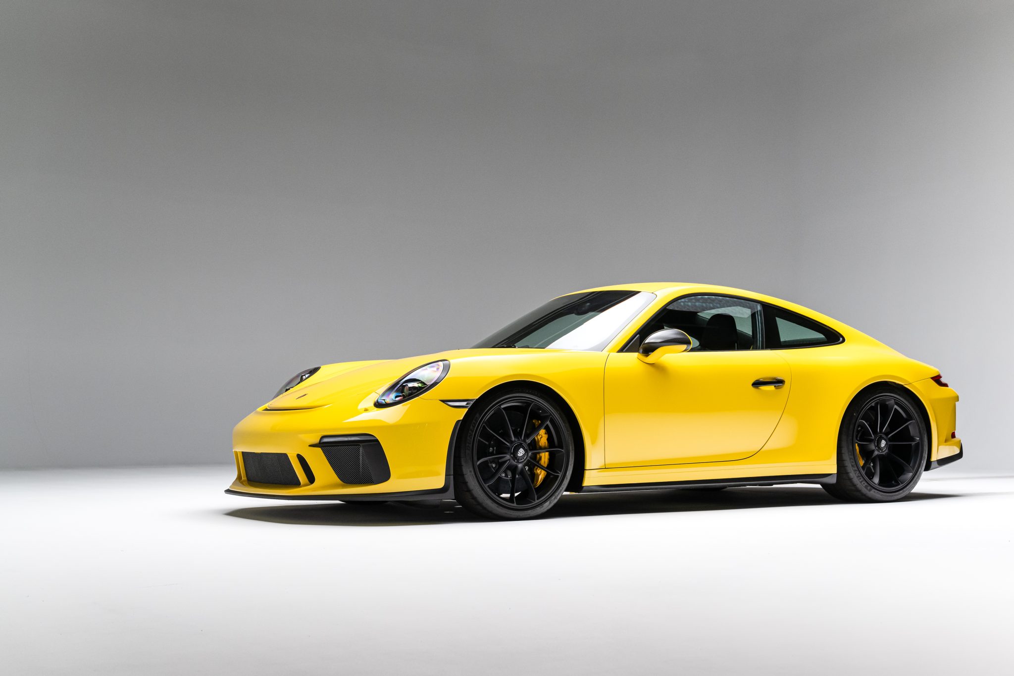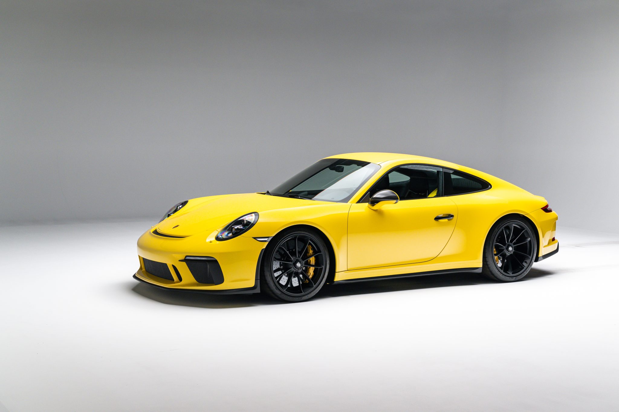 Black-finished 20″ center-lock alloy wheels are mounted with Dunlop tires. Braking is handled by yellow Porsche-branded calipers over ceramic-composite rotors, and the car was optioned with a front-axle lift system. A brake fluid flush was performed in January 2024.