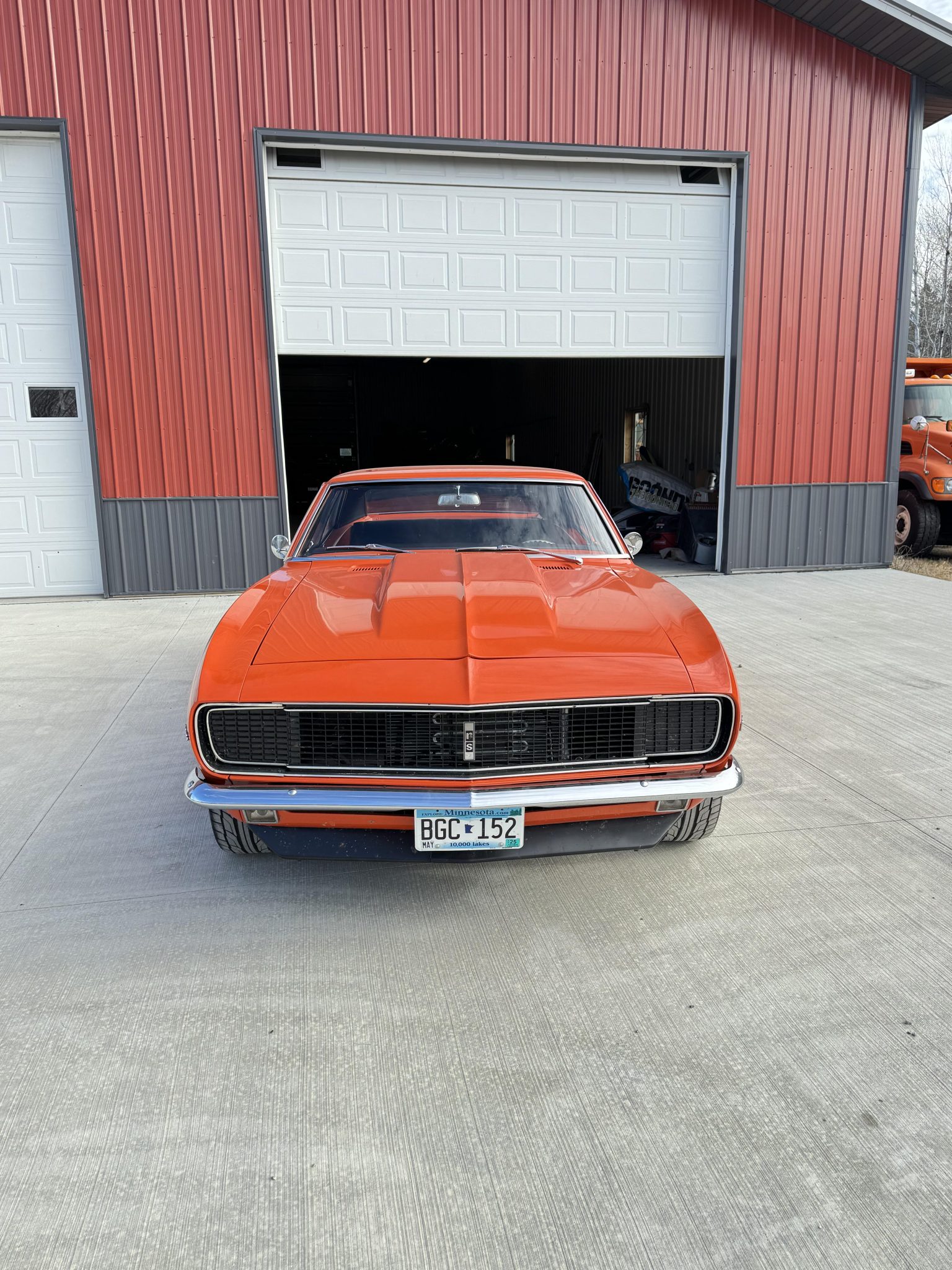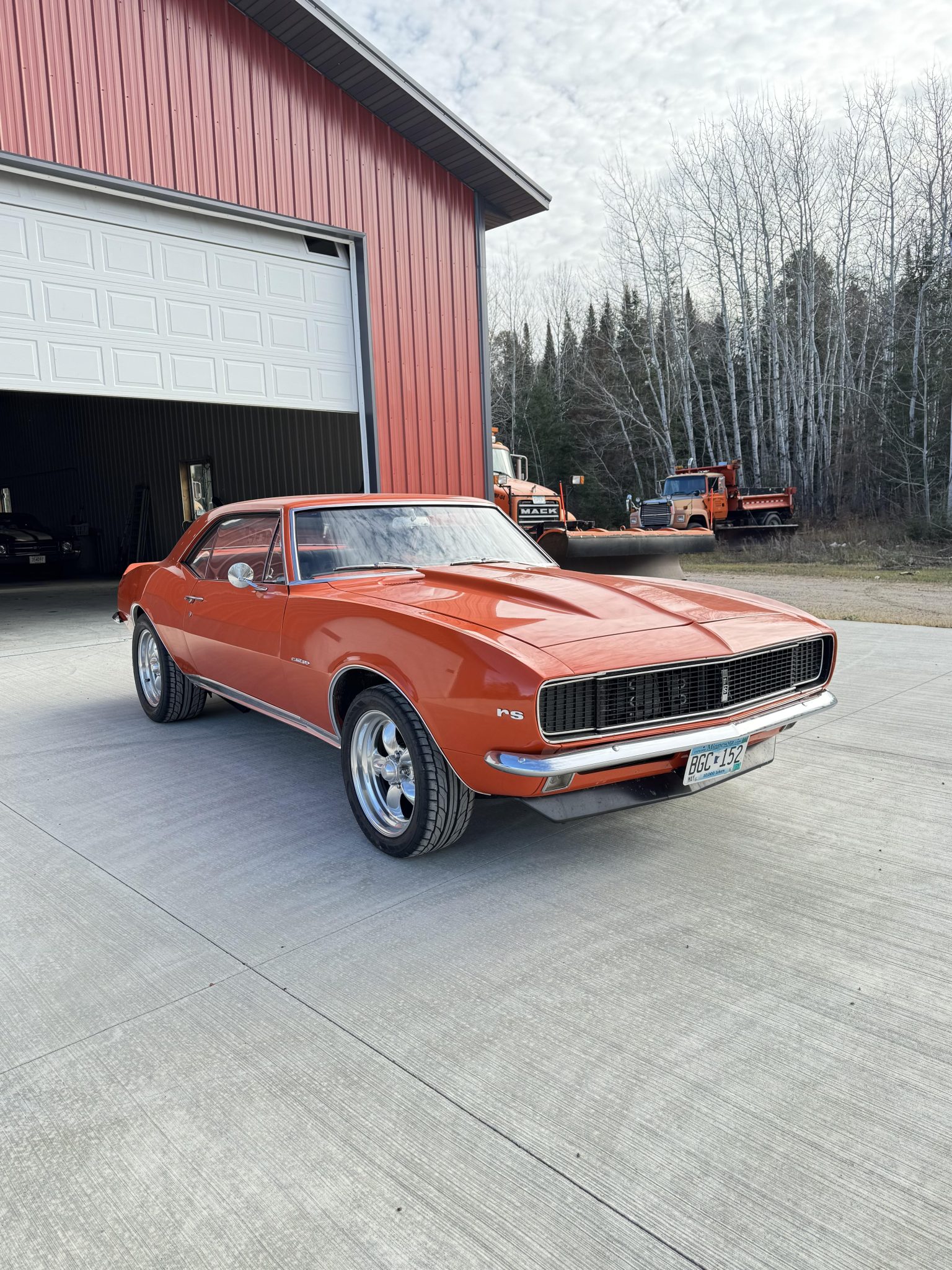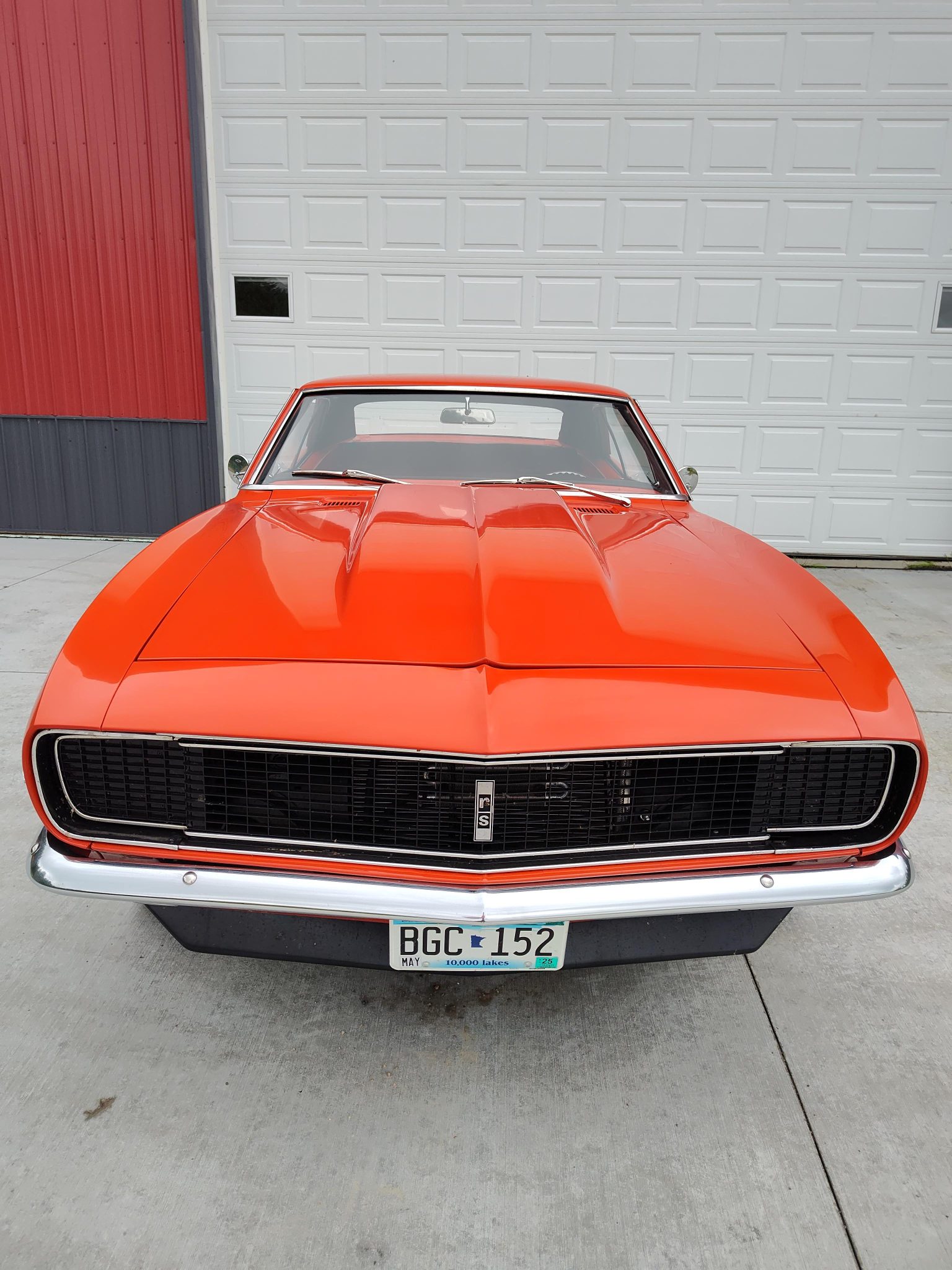 The body has been refinished in orange and features a cowl hood, concealed headlights, RS badging, and front and rear spoilers.