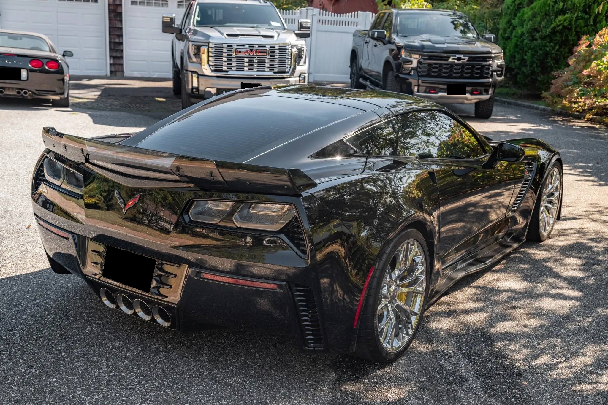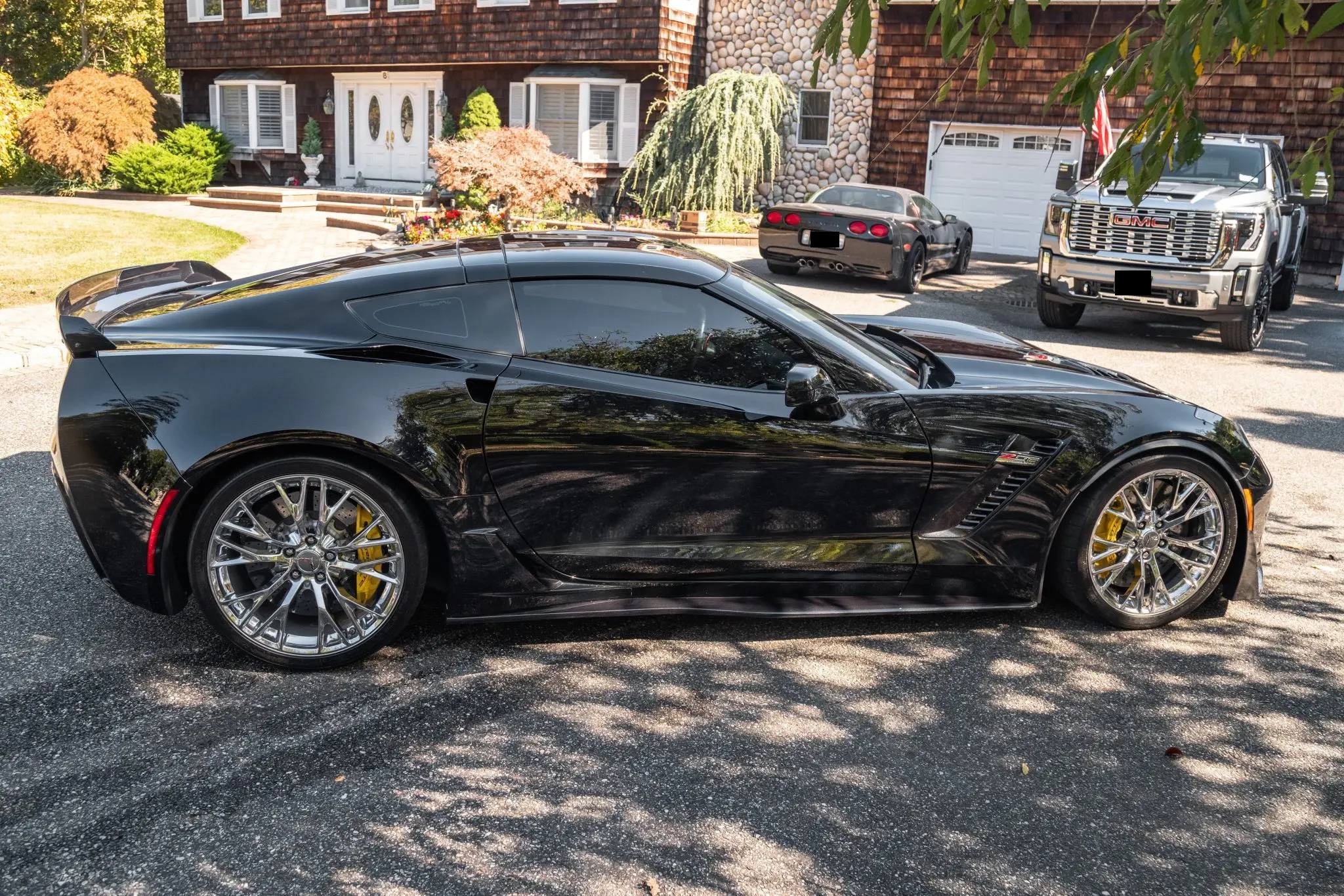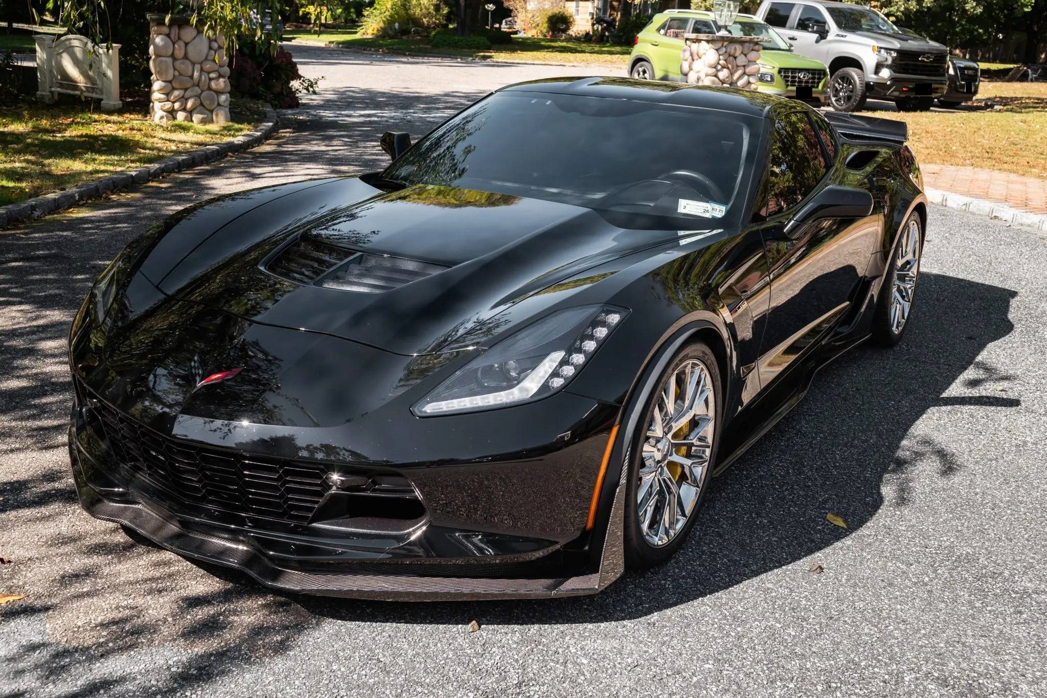 Chrome-finished 19″ and 20″ Z06 aluminum wheels are mounted with Michelin Pilot Super Sport tires measuring 285/30 up front and 335/25 out back. The car is equipped with a Z07 suspension with Magnetic Ride Control in addition to Performance Traction Management and an Active Handling System. Stopping power is provided by optional yellow-finished Brembo brake calipers over drilled and ventilated carbon-ceramic rotors at each corner.