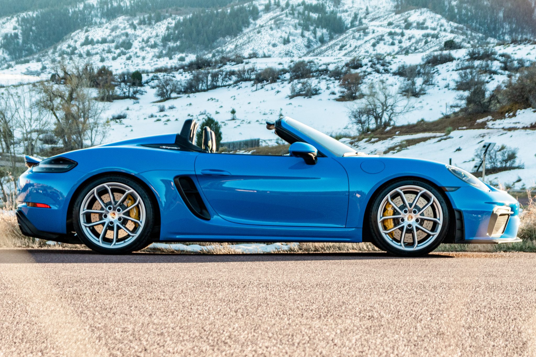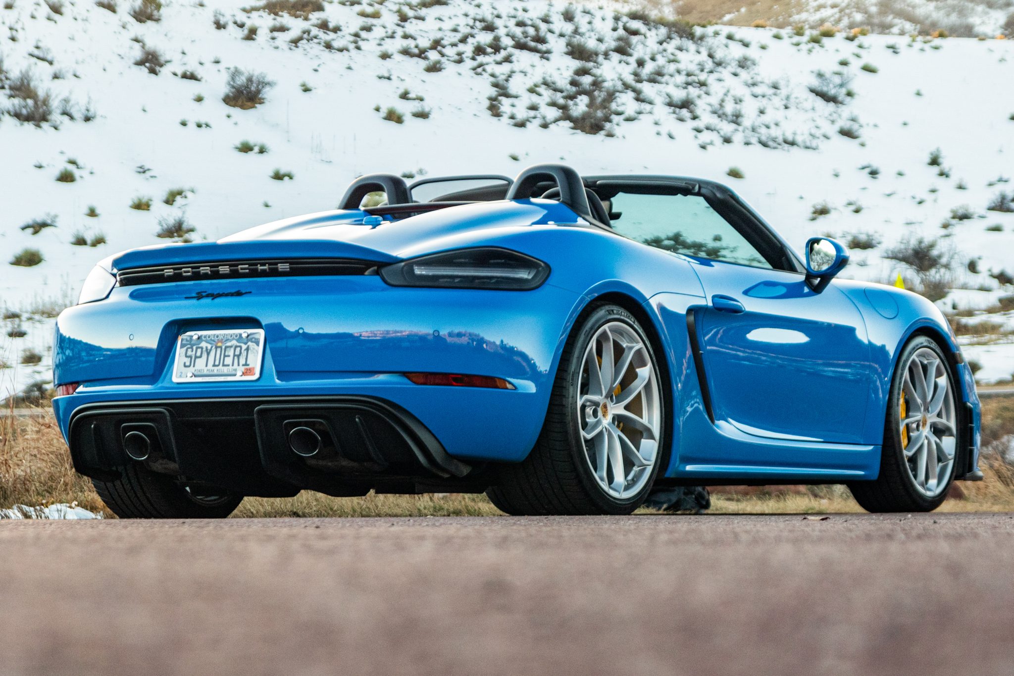The 20″ 718 Spyder alloy wheels are mounted with Michelin tires showing 2022 date codes. Stopping power is provided by Porsche Ceramic-Composite Brakes with yellow-finished calipers. The car is equipped with Porsche Active Suspension Management (PASM).