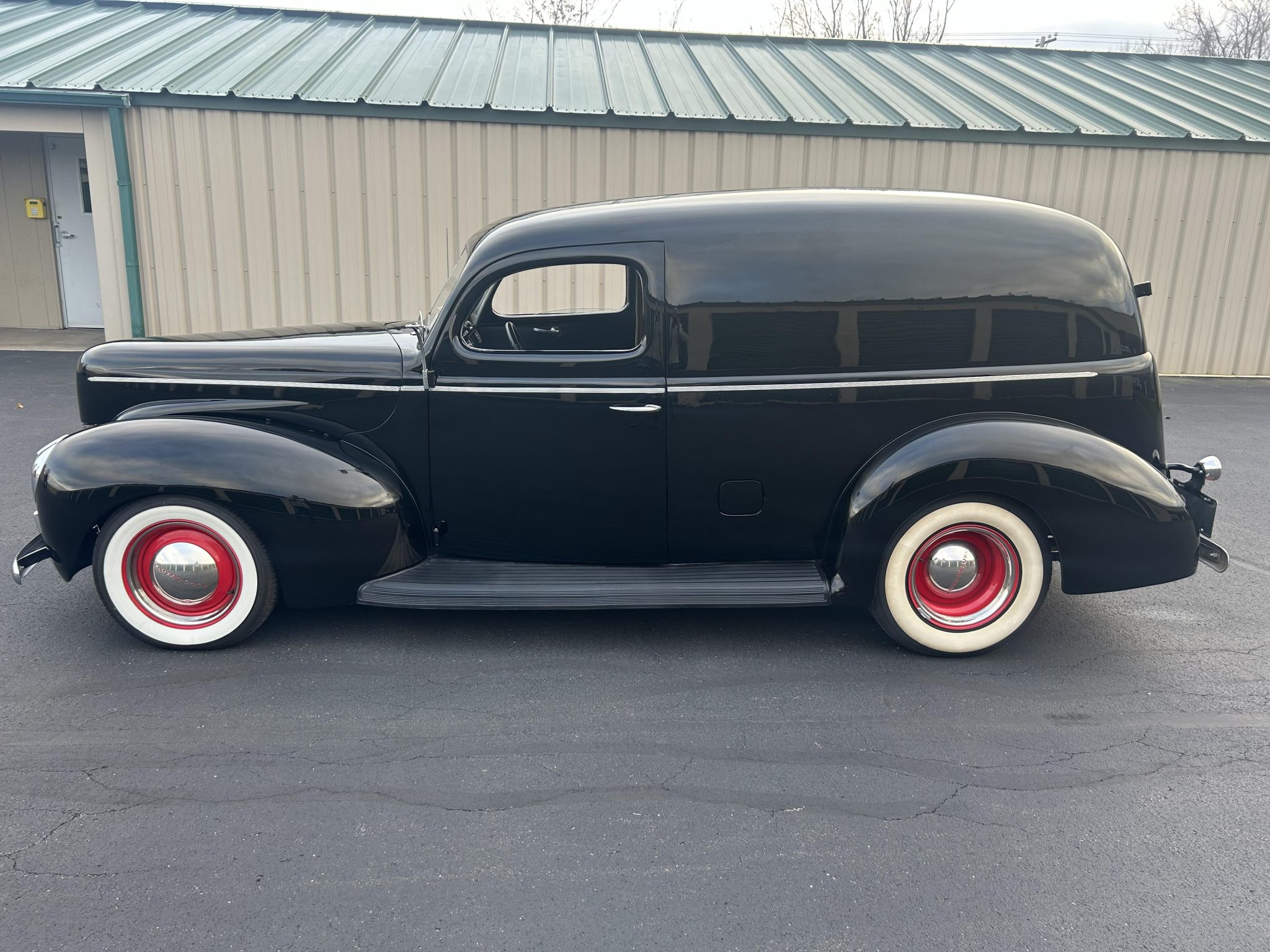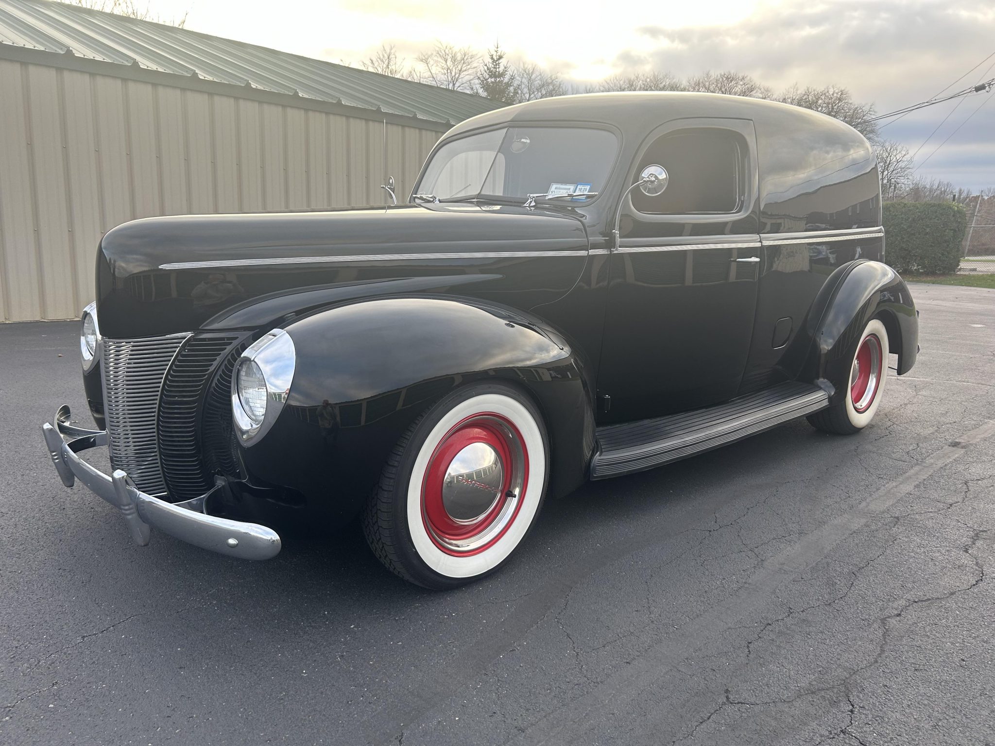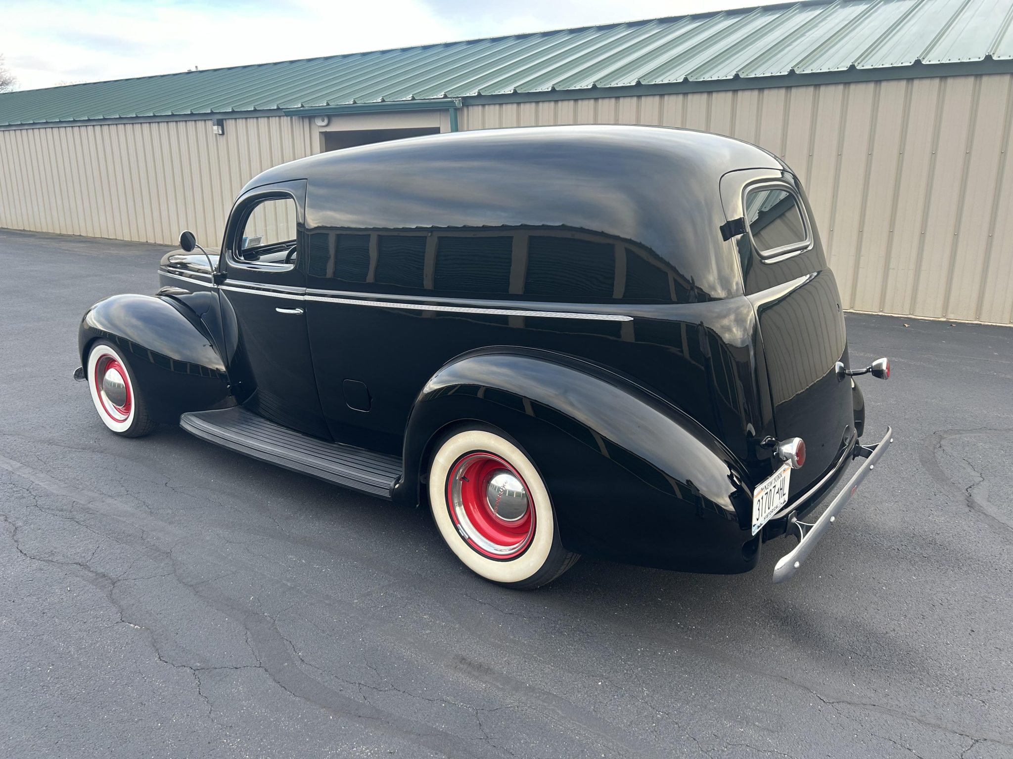 Red-finished 15″ wheels wear chrome trim rings and Ford Deluxe–branded smoothie covers. Coker classic whitewall tires up front are paired with Hankook Kinergy tires out back. The car has been fitted with a Mustang II–style front suspension with power rack-and-pinion steering as well as a longitudinal rear leaf spring setup with hydraulic shocks. Further suspension modifications include Aldan American adjustable front coilovers as well as front and rear sway bars. Braking is handled by power-assisted front discs and rear drums.
