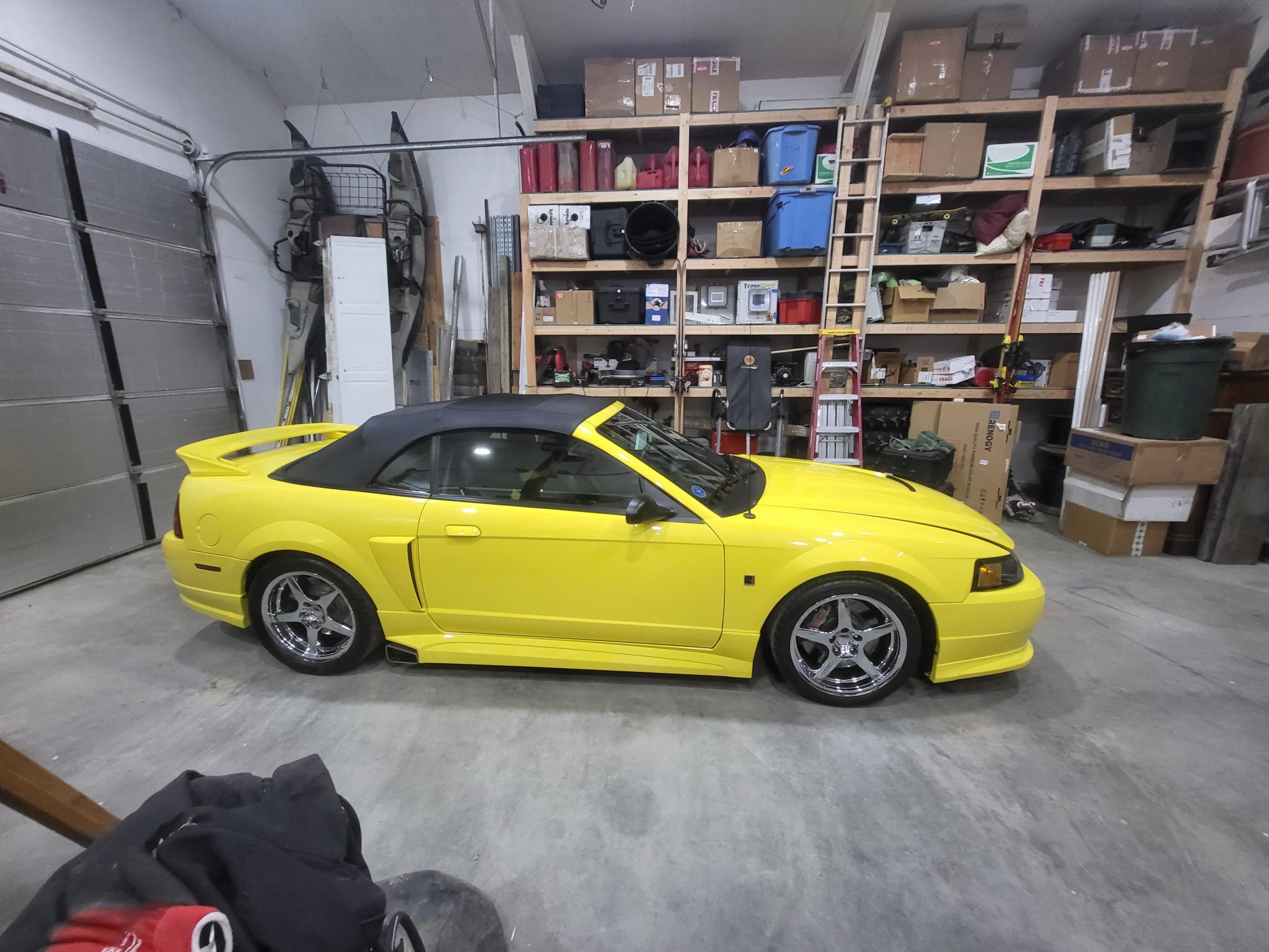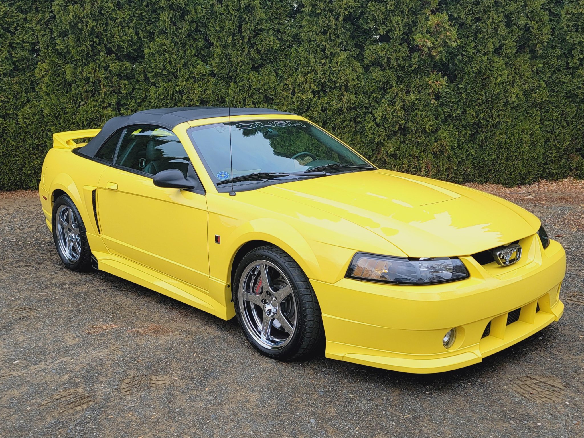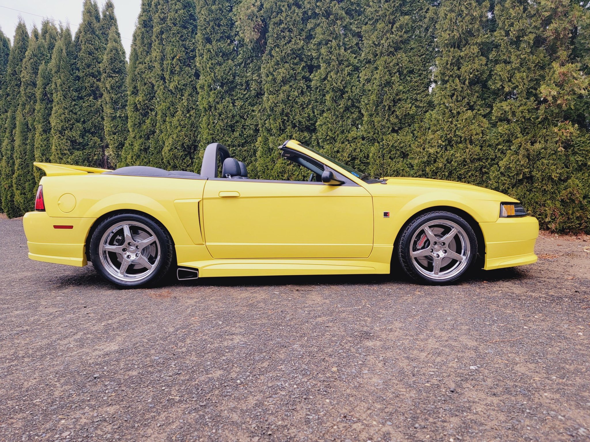 Roush 18″ five-spoke wheels wear older BFGoodrich Comp T/A tires. Stopping power is provided by slotted rotors with Roush-Alcon four-piston calipers up front, and the car is equipped with traction control as well as a Roush-tuned Stage 3 suspension including revised springs, dampers, sway bars, and lower control arms.