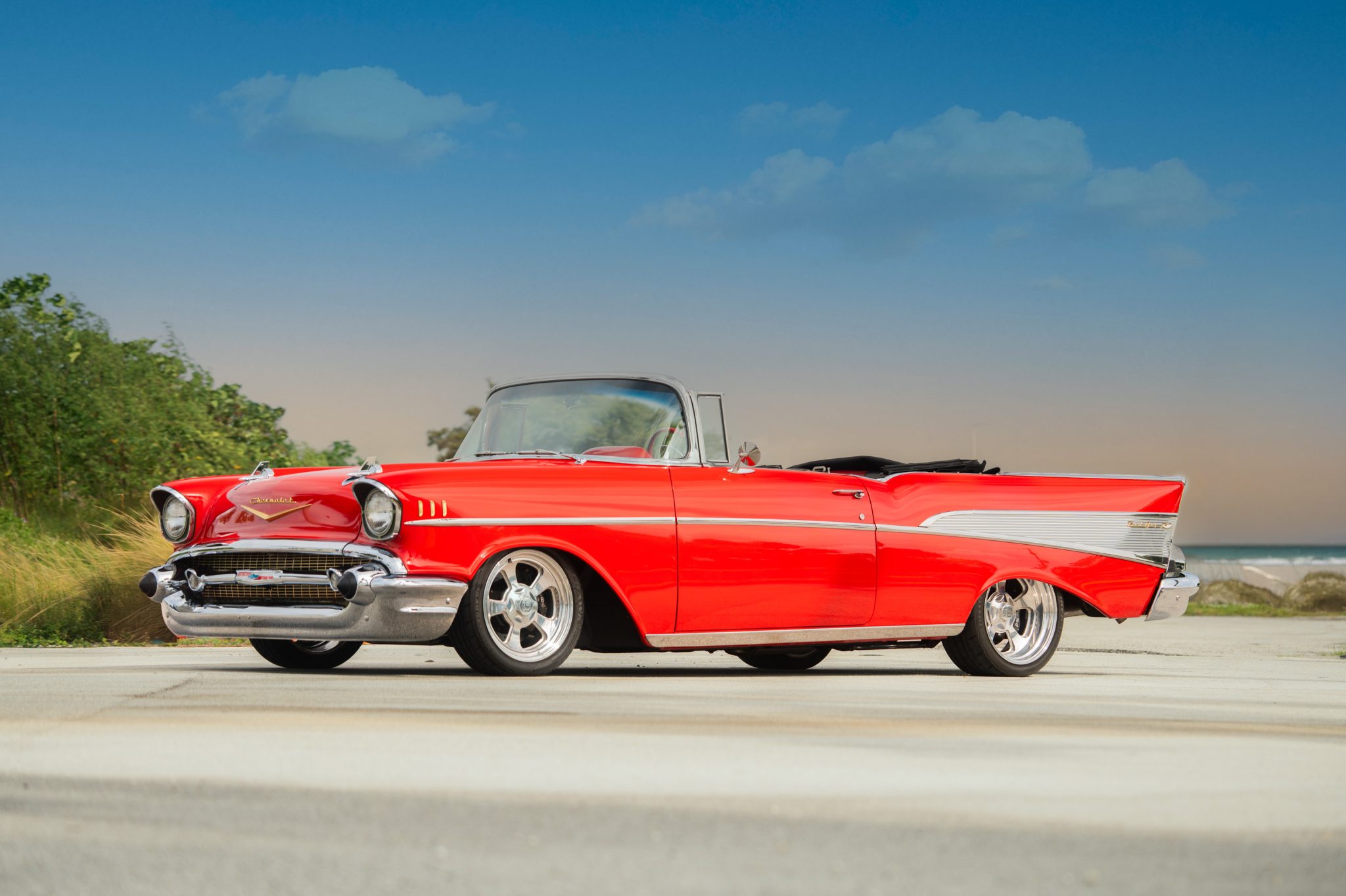 Suspension includes a Mustang II front setup, a triangulated four-link rear setup, and coilovers. Billet Specialties 17″ and 18″ wheels are mounted with Firestone Firehawk Indy 500 tires measuring 215/45 front and 275/35 rear, respectively. Braking is provided by six-piston front and four-piston rear Wilwood calipers over cross-drilled and slotted discs.