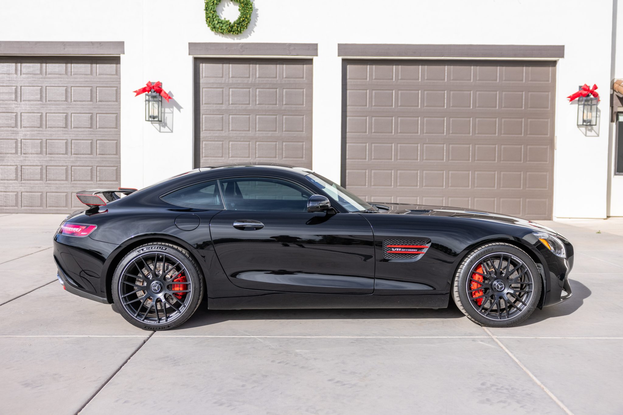 Black-finished 19″ and 20″ AMG forged cross-spoke wheels wear Michelin Pilot Sport 4s tires. Braking is handled by red-finished calipers over cross-drilled and ventilated discs at all four corners. The car is equipped with an adaptive suspension, and the AMG Dynamic Plus Package added firmer suspension damping, revised steering, and increased negative front-wheel camber.