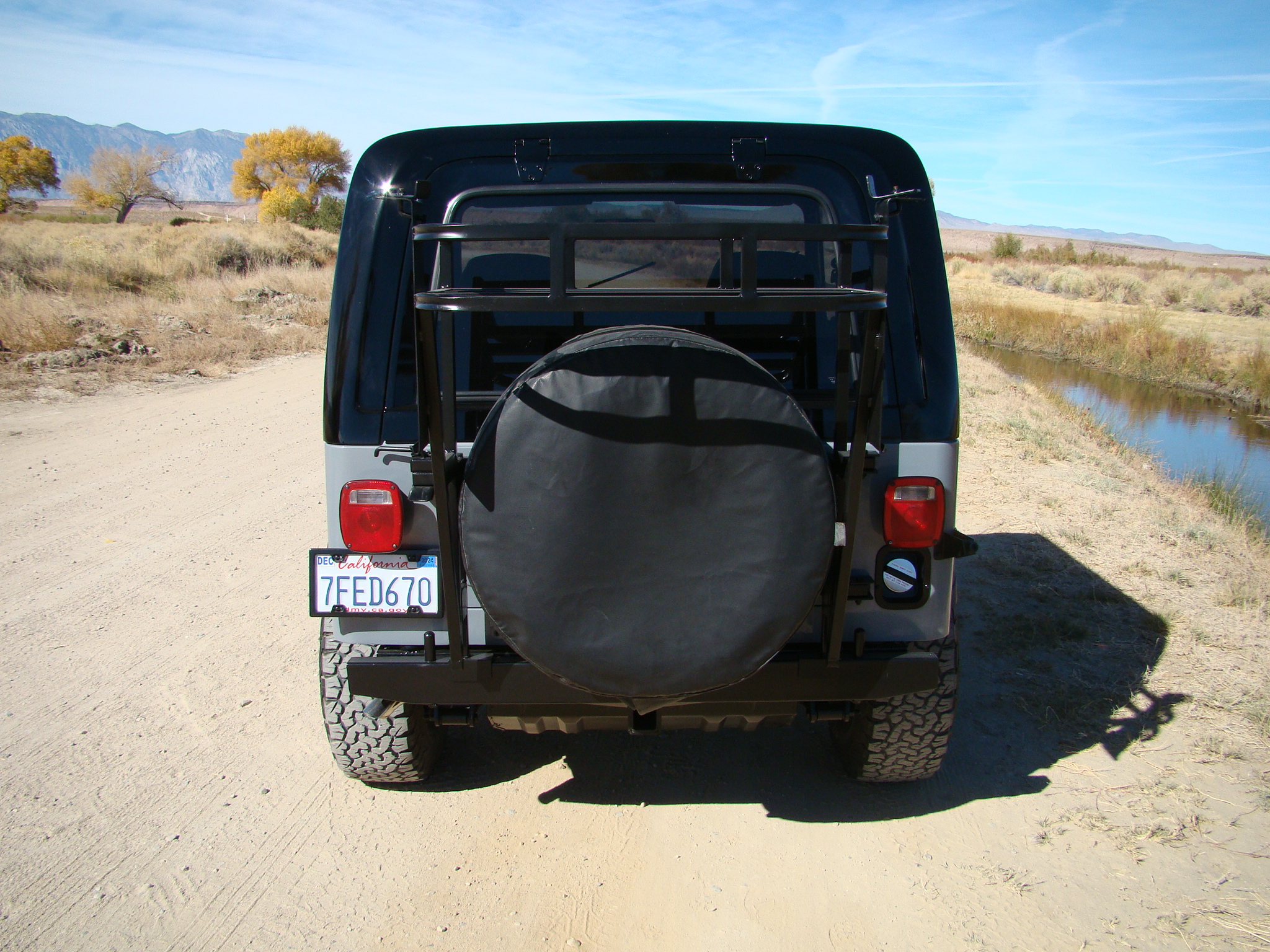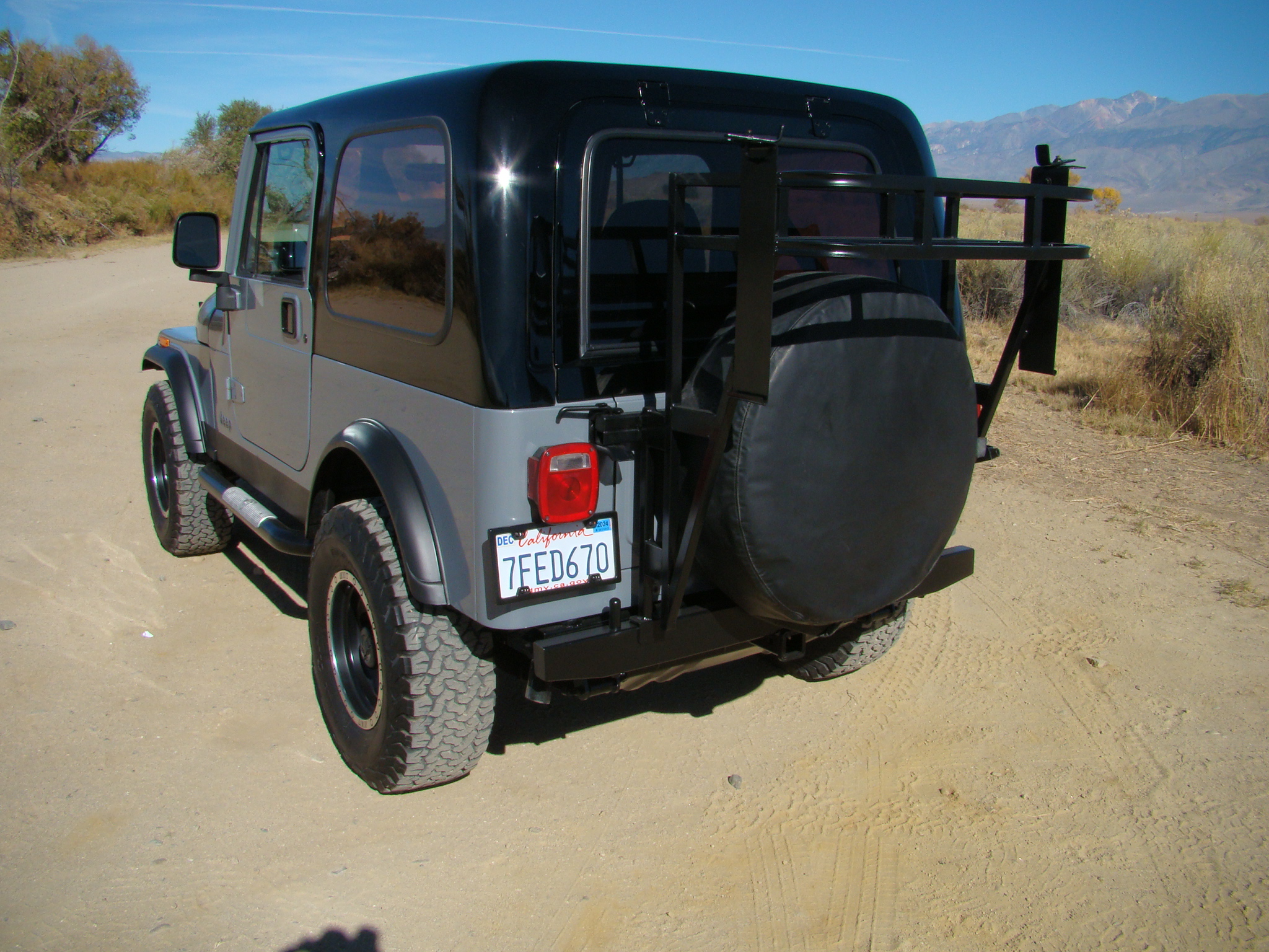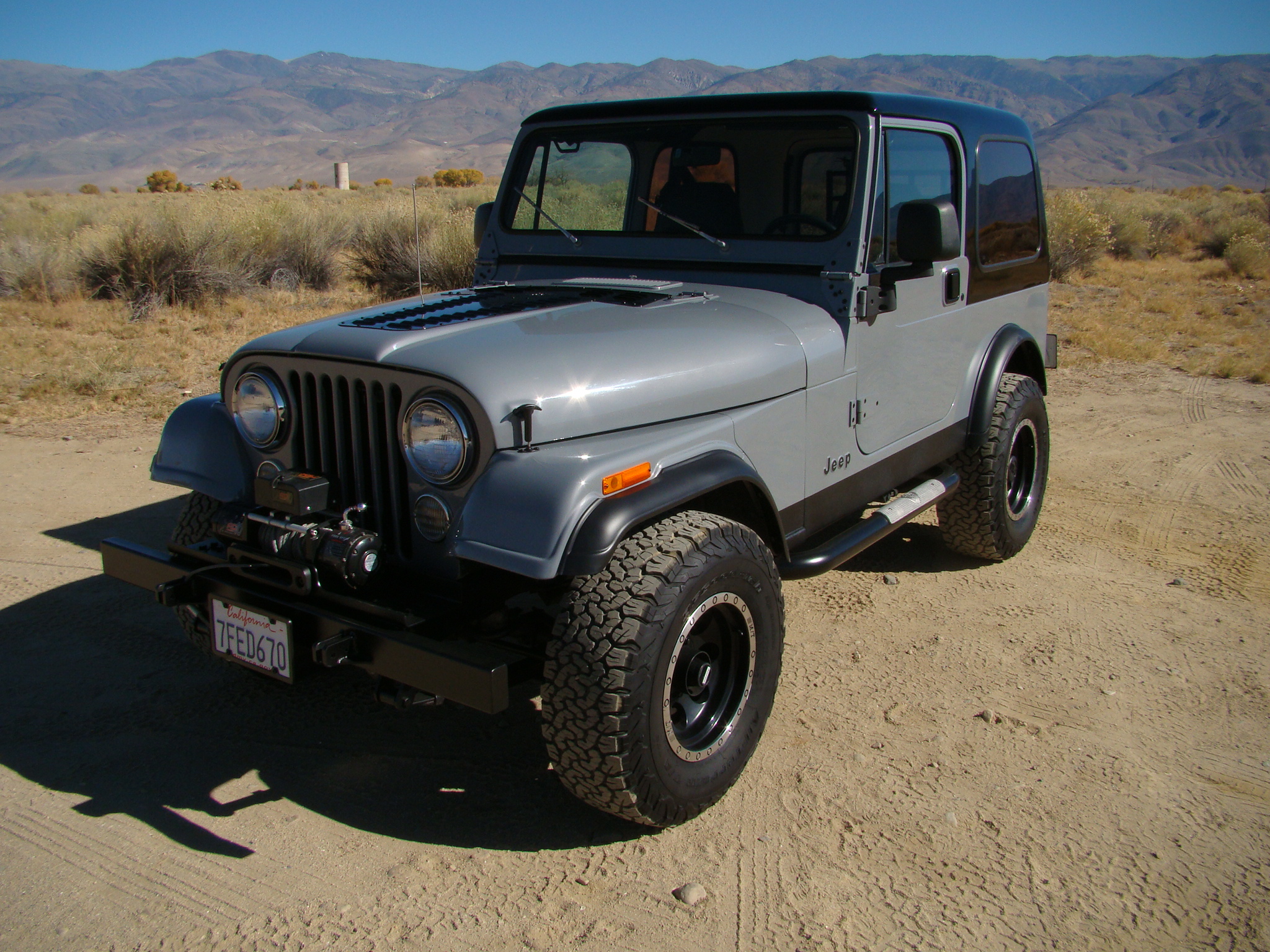 Matte black 15″ Mickey Thompson Classic Baja Lock wheels were mounted with 31×10.5″ BFGoodrich All-Terrain T/A KO2 tires in 2015, and a covered spare is affixed to the swing-away tire carrier along with a storage rack. The Jeep is equipped with manually locking front hubs, an AGR steering box, and Rancho 1″ lift springs and shock absorbers. Braking is handled by power-assisted front discs and rear drums.