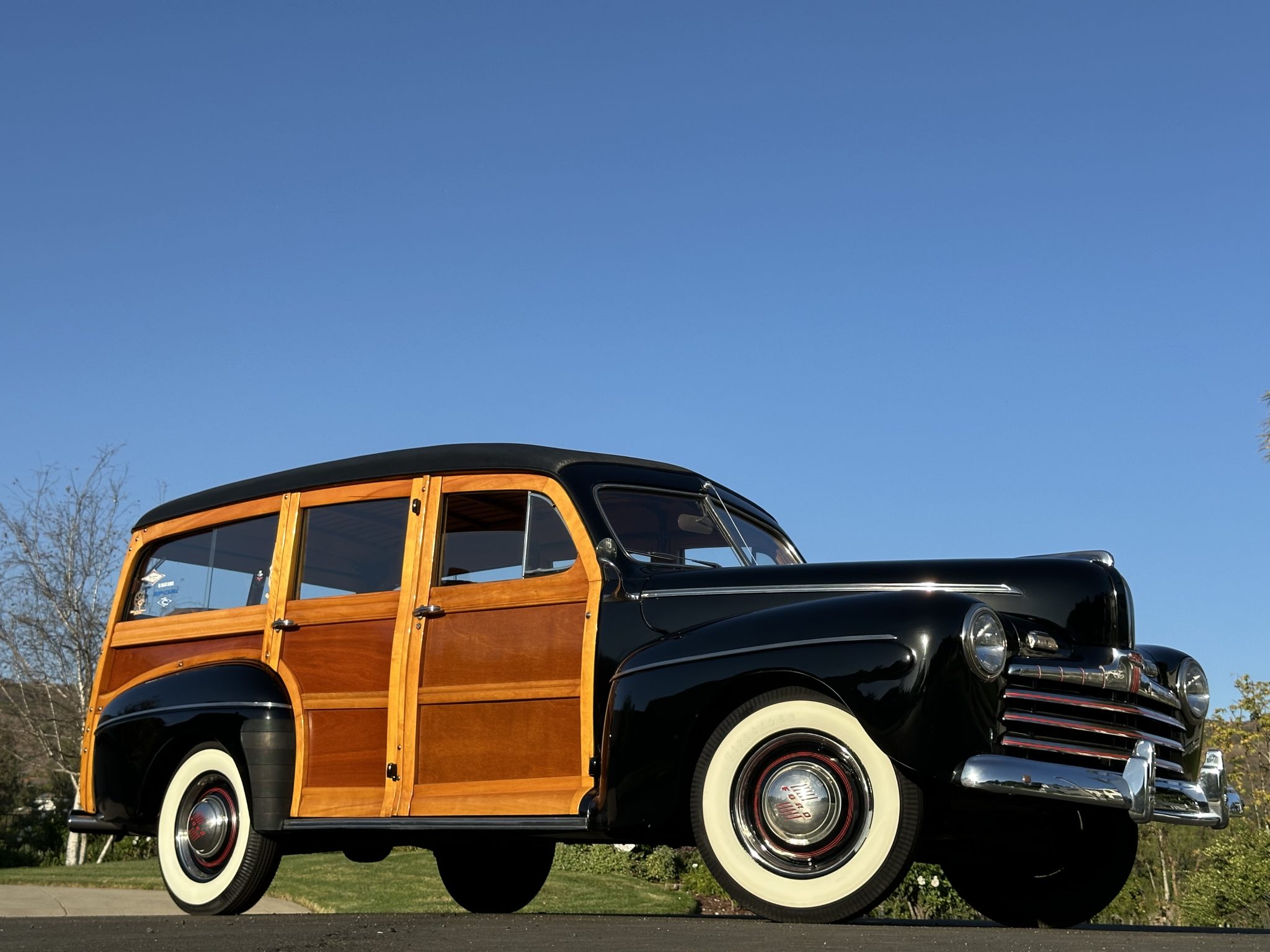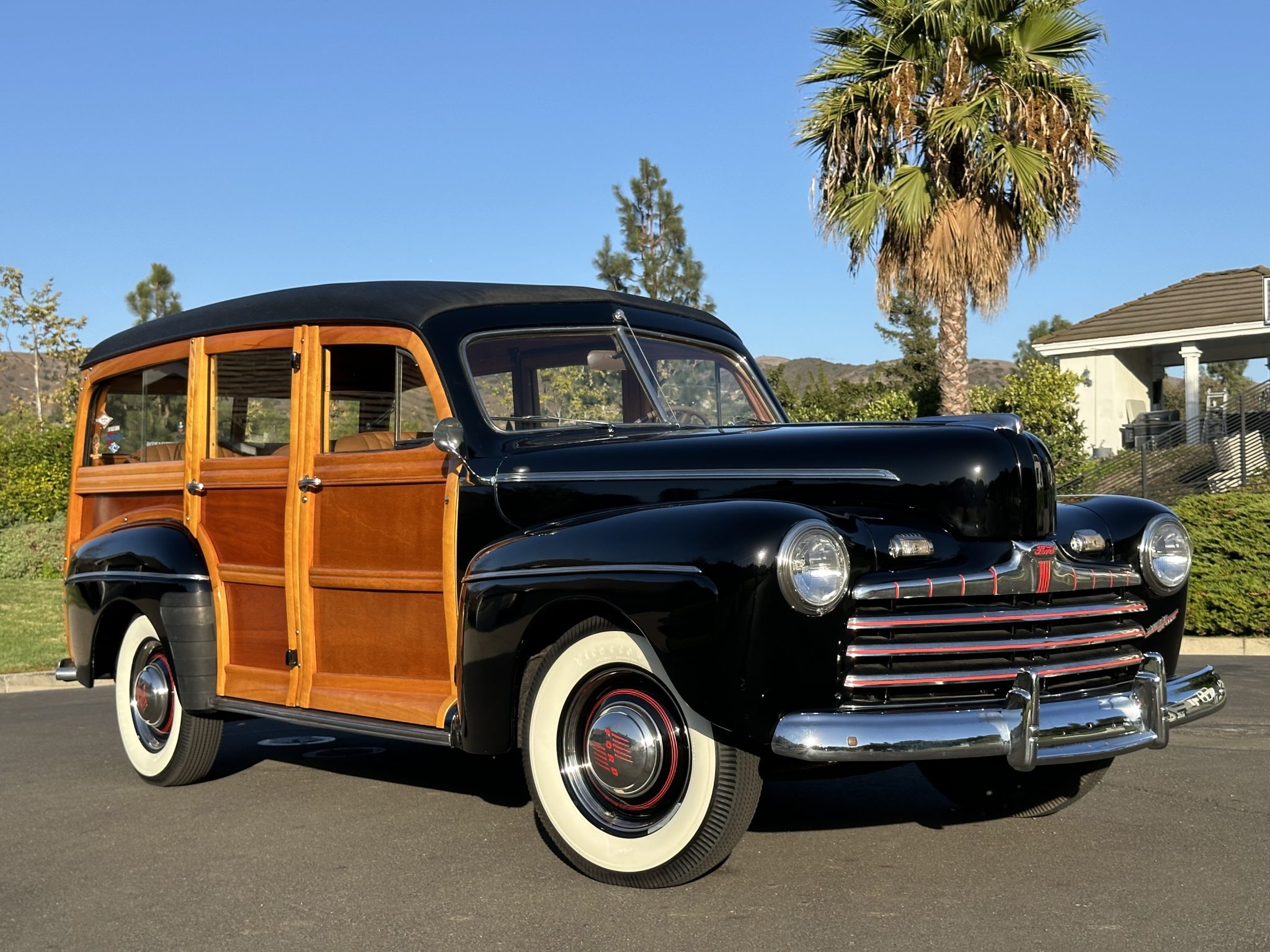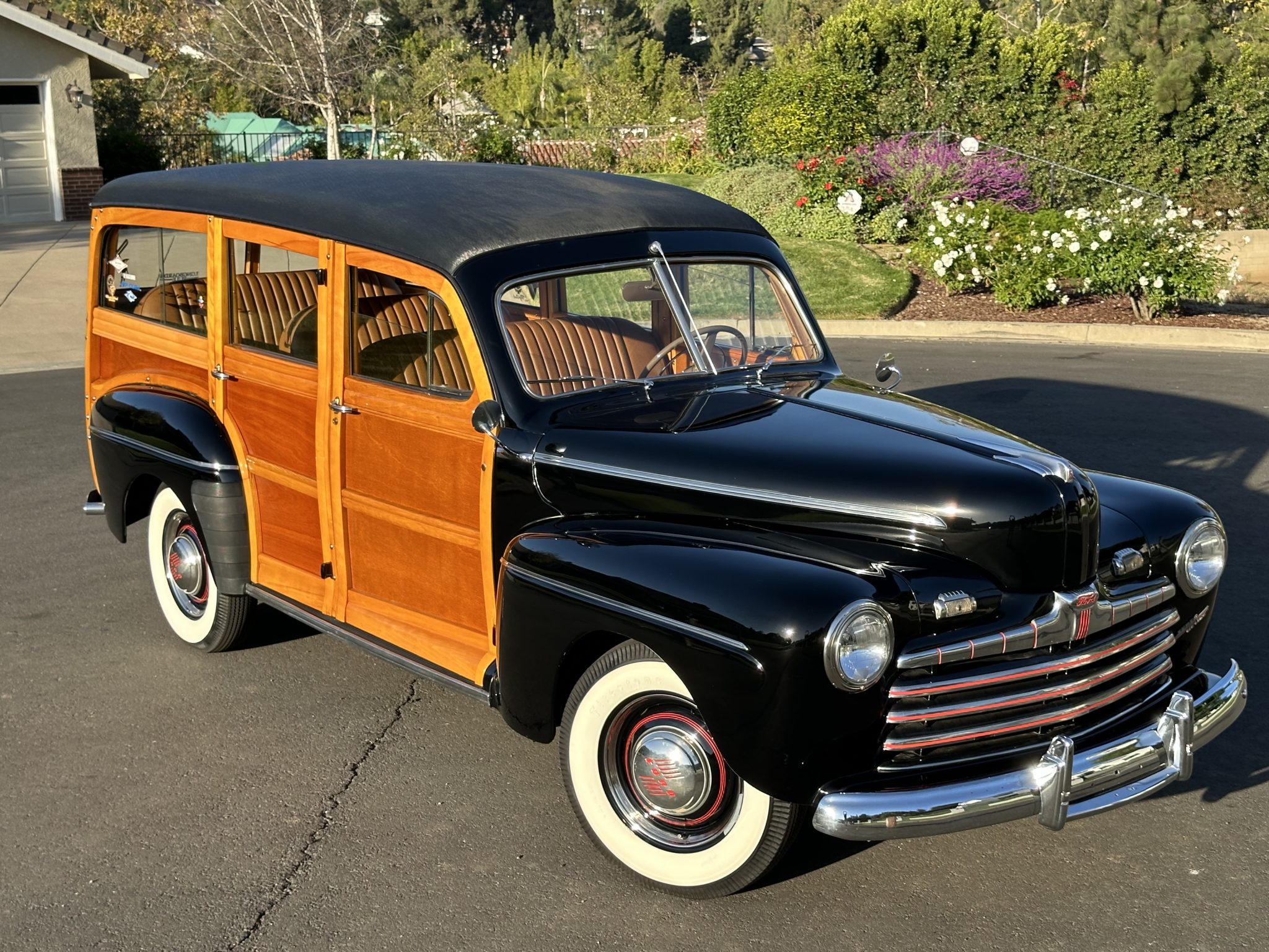Body-color 16” steel wheels feature hubcaps with trim rings and are mounted with Firestone whitewall tires measuring 6.00-16. A spare is housed in a body-color cover attached to the tailgate. The car was factory equipped with front and rear transverse leaf springs, and braking is provided by hydraulically actuated front and rear drums.