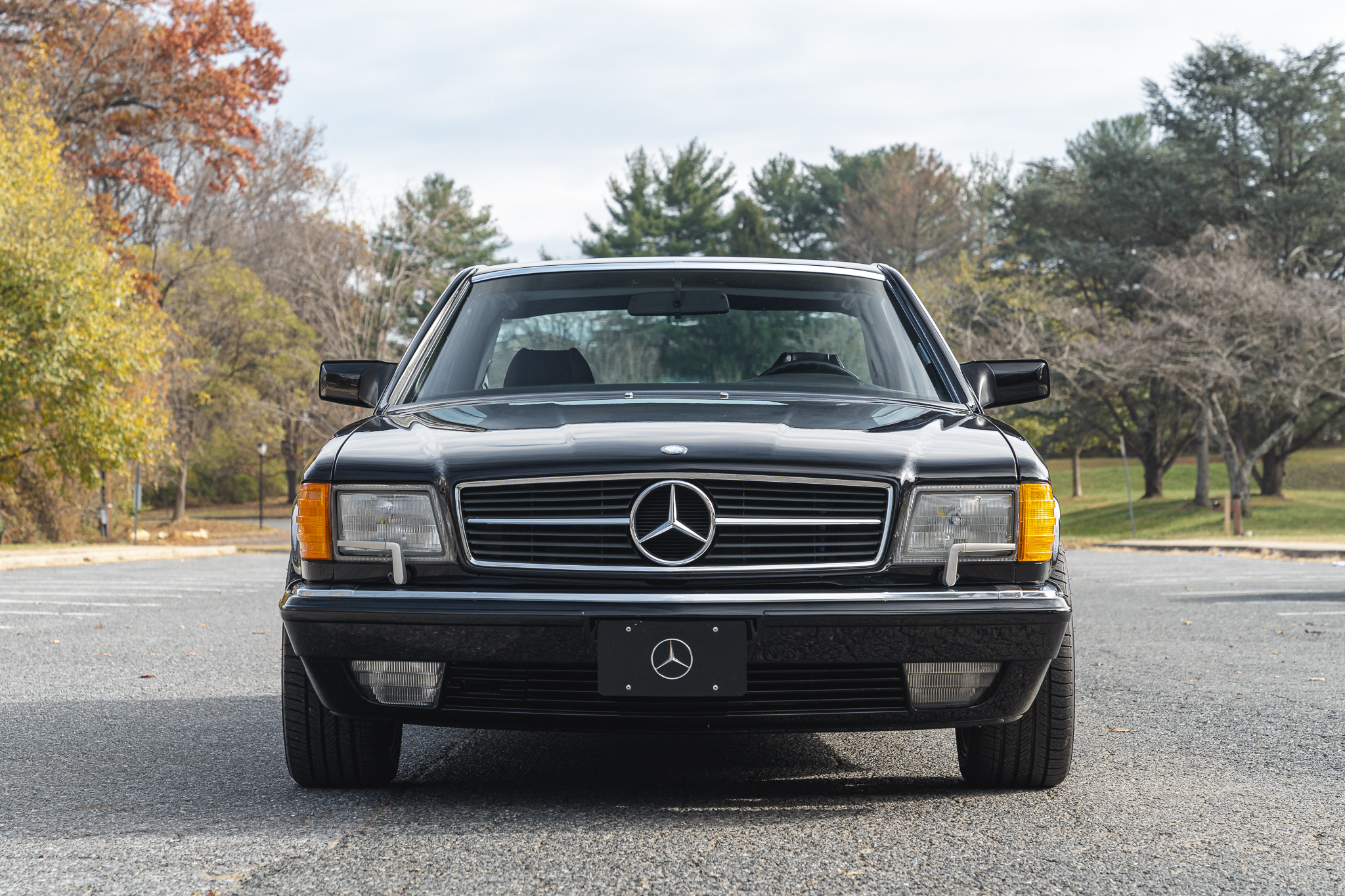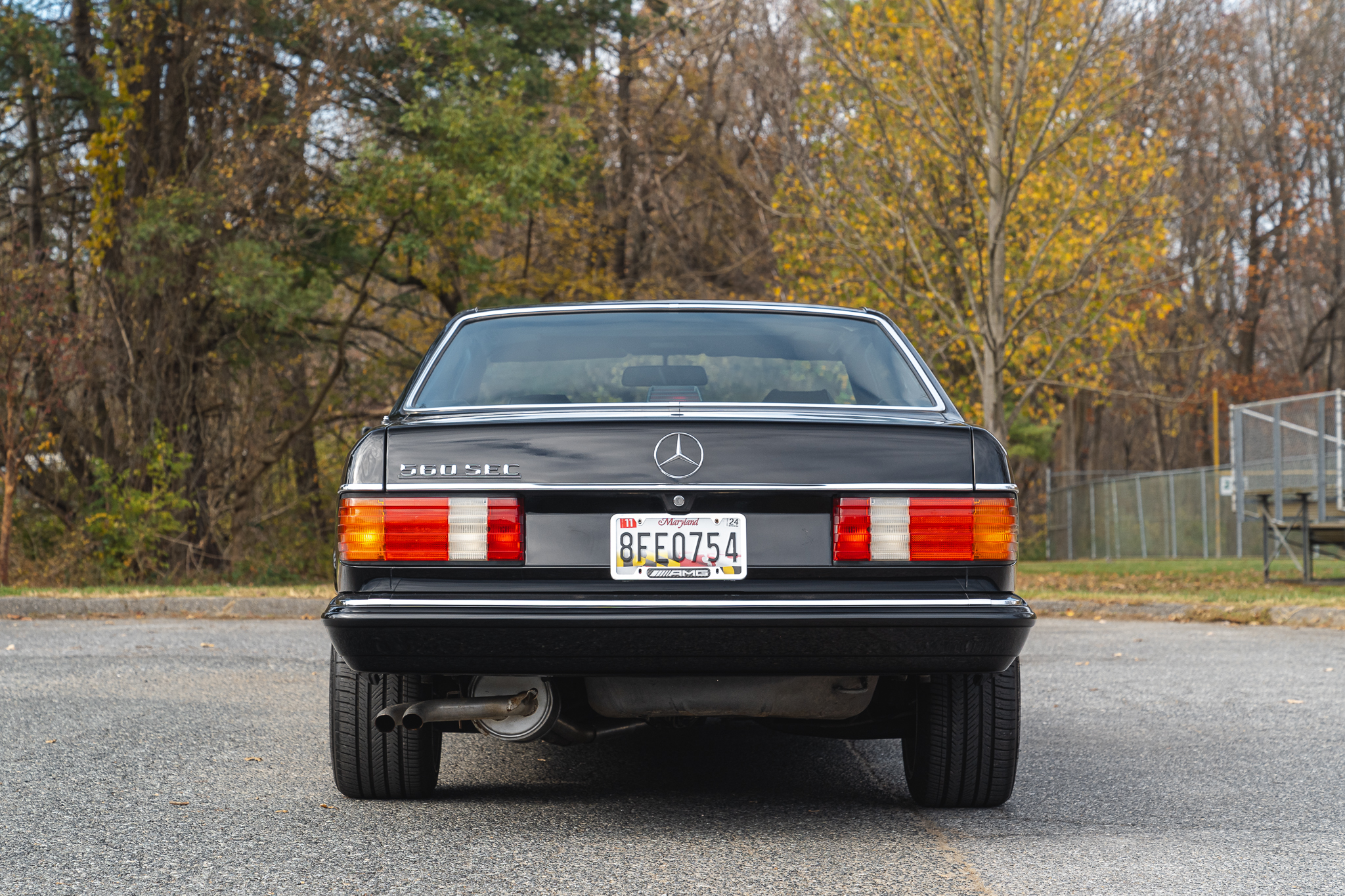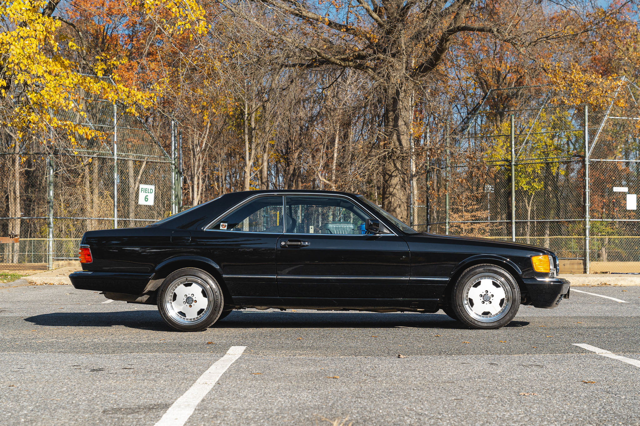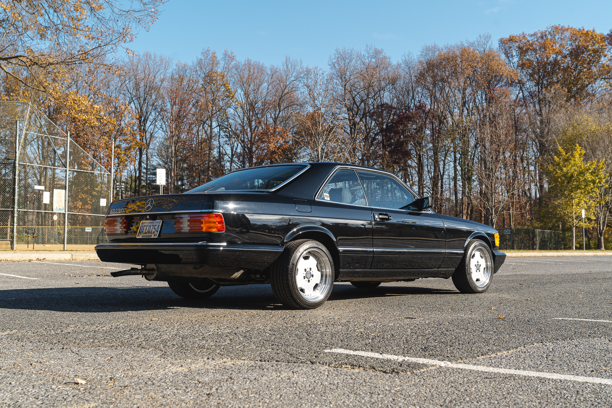 AMG-style 17″ alloy wheels were fitted under current ownership and are mounted with Michelin Pilot Sport All-Season tires and wheel spacers at all four corners. The 560SEC was equipped with self-leveling rear suspension as standard equipment, and braking is handled by power-assisted four-wheel discs with ABS and ventilated front rotors.