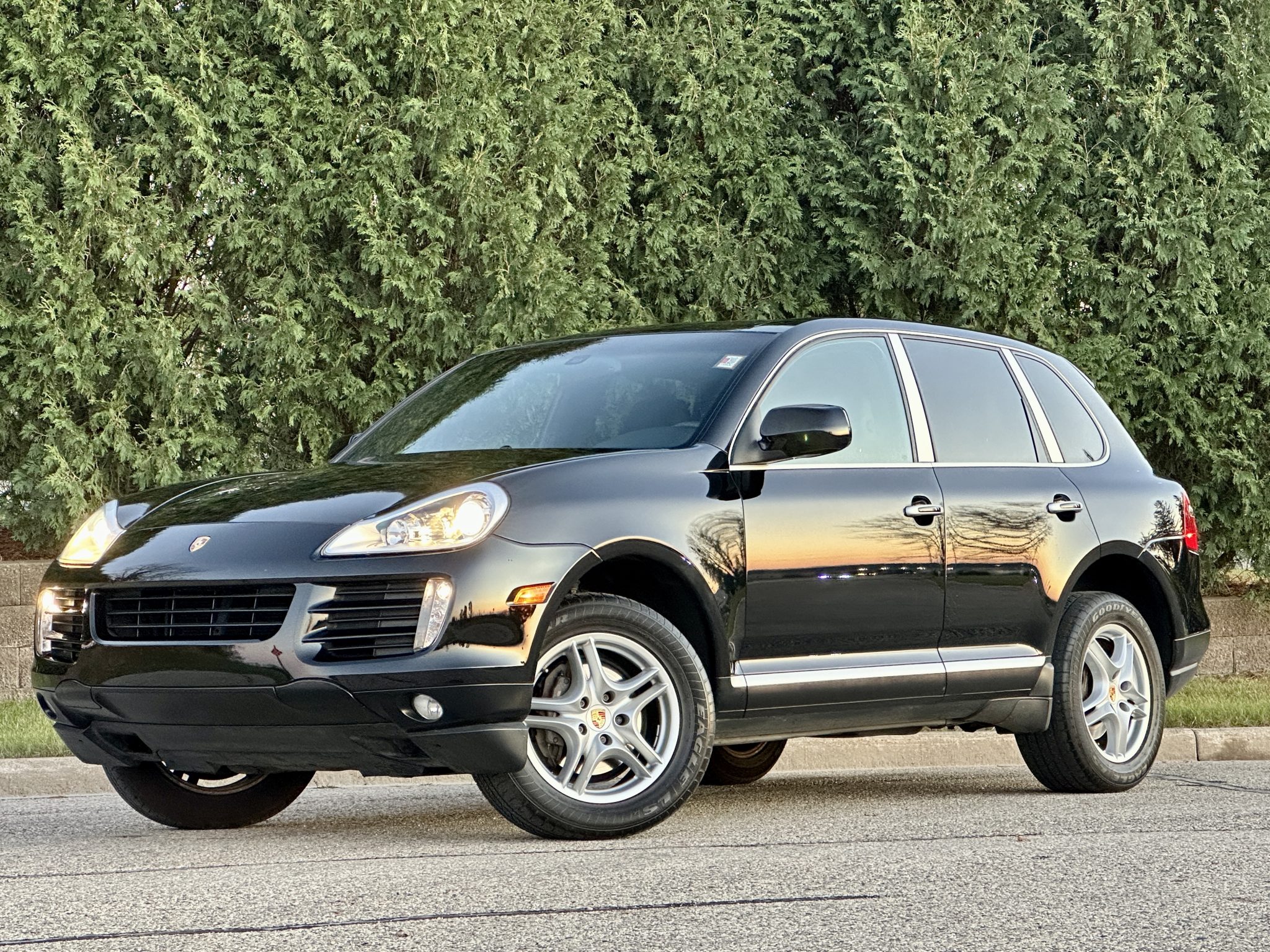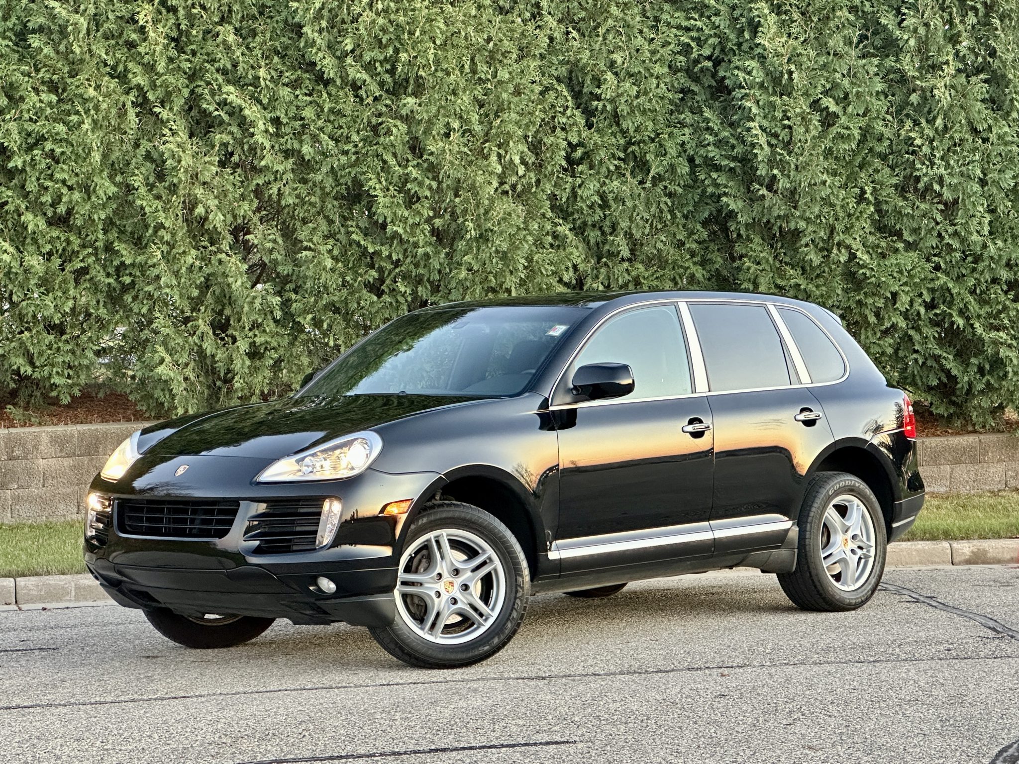 The 18″ Cayenne Turbo II alloy wheels feature color Porsche-crest center caps and are mounted with 255/55 Goodyear Eagle LS2 tires. Stopping power is from Porsche-branded calipers over ventilated rotors at each corner, and the truck is equipped with Variable Assist Power Steering. The front brake pads were replaced in December 2022.