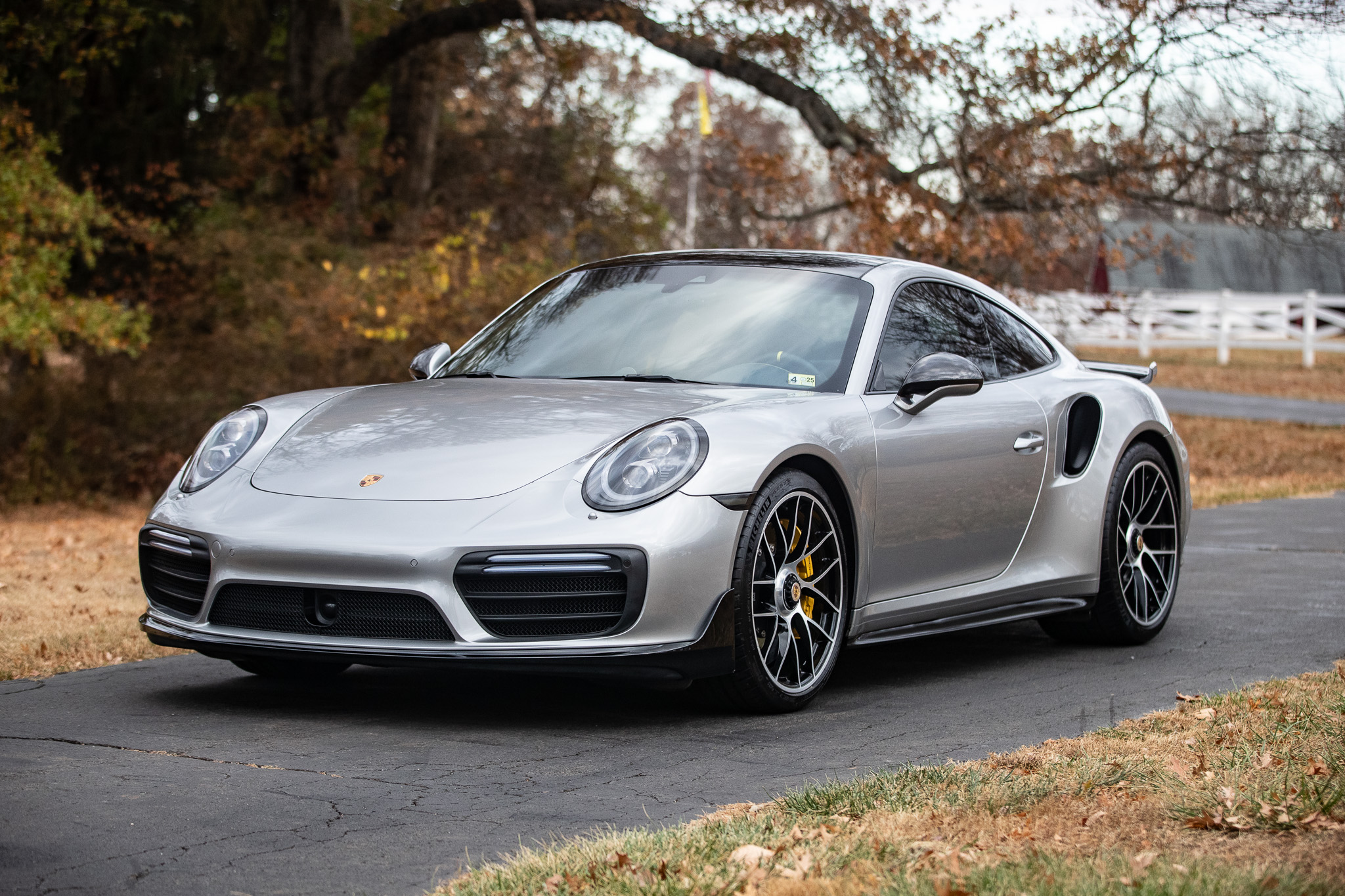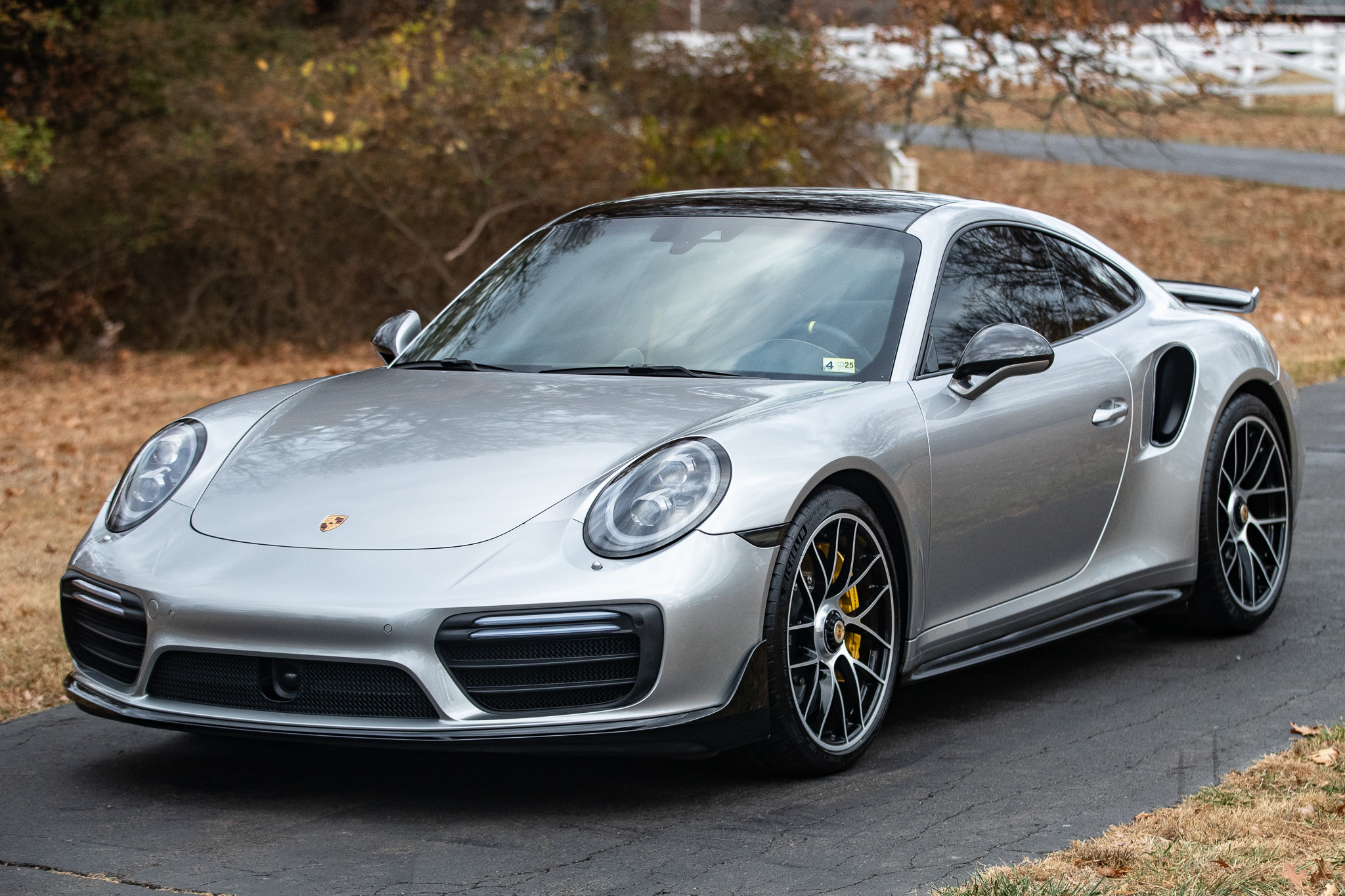 The 20″ Turbo S center-lock alloy wheels wear Michelin tires that were mounted in November 2024. Braking is handled by Porsche Ceramic Composite Brakes (PCCB) featuring yellow-painted Porsche-branded calipers at all four corners. The car is equipped with Power Steering Plus, rear-axle steering, Porsche Dynamic Chassis Control (PDCC), a front-axle lift system, and Porsche Active Suspension Management (PASM).