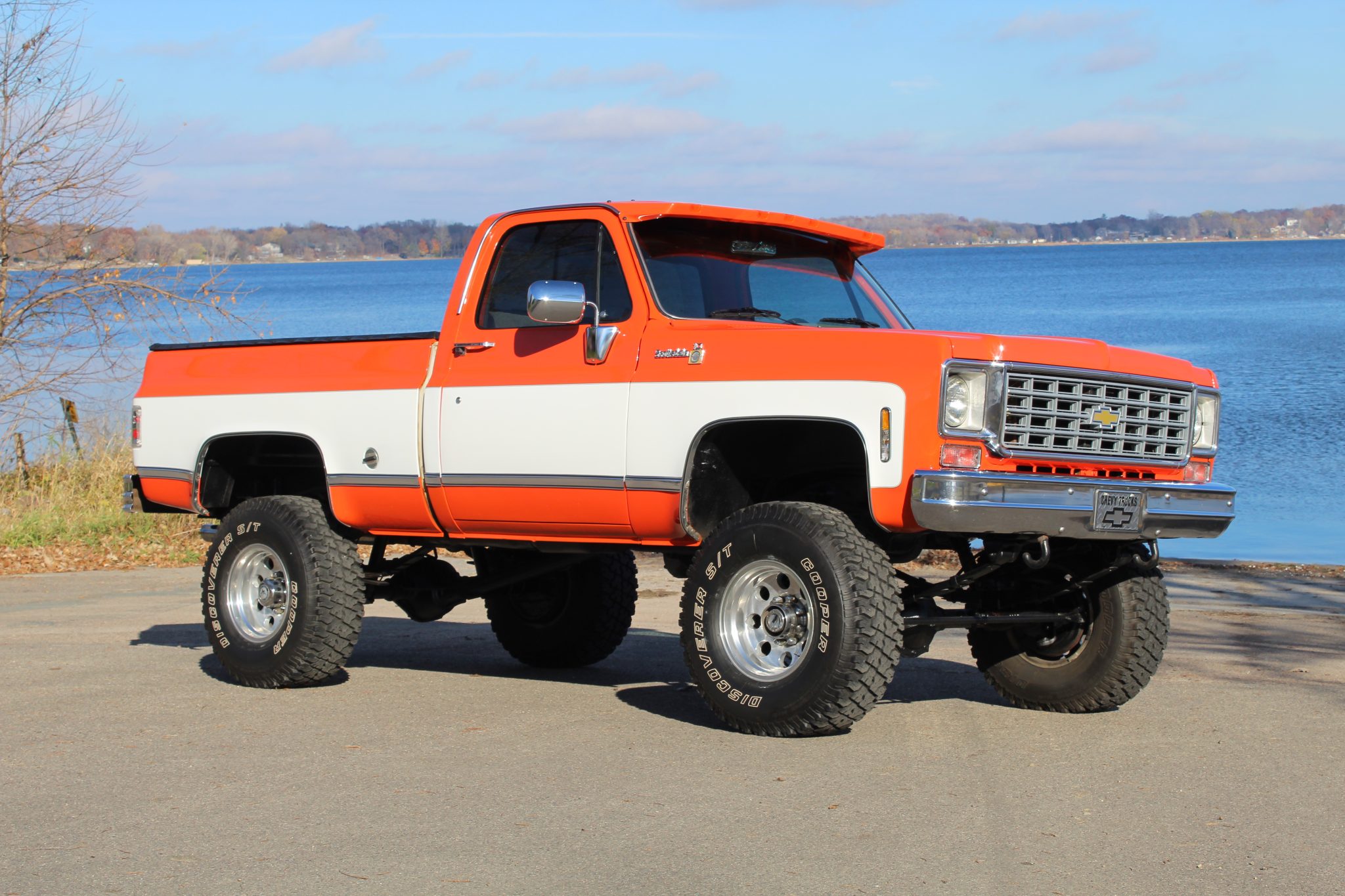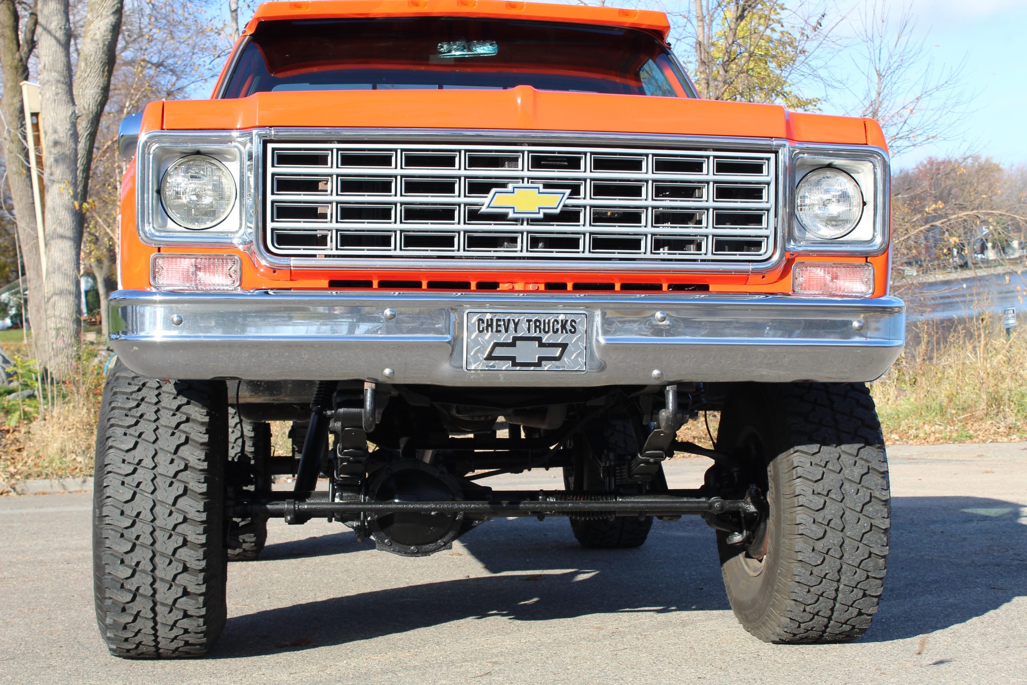 The 16″ American Racing wheels are mounted with 315/750 Cooper Discoverer S/T white-letter tires. The truck has been fitted with a six-inch lift kit and power steering. Braking is provided by front discs and rear drums.
