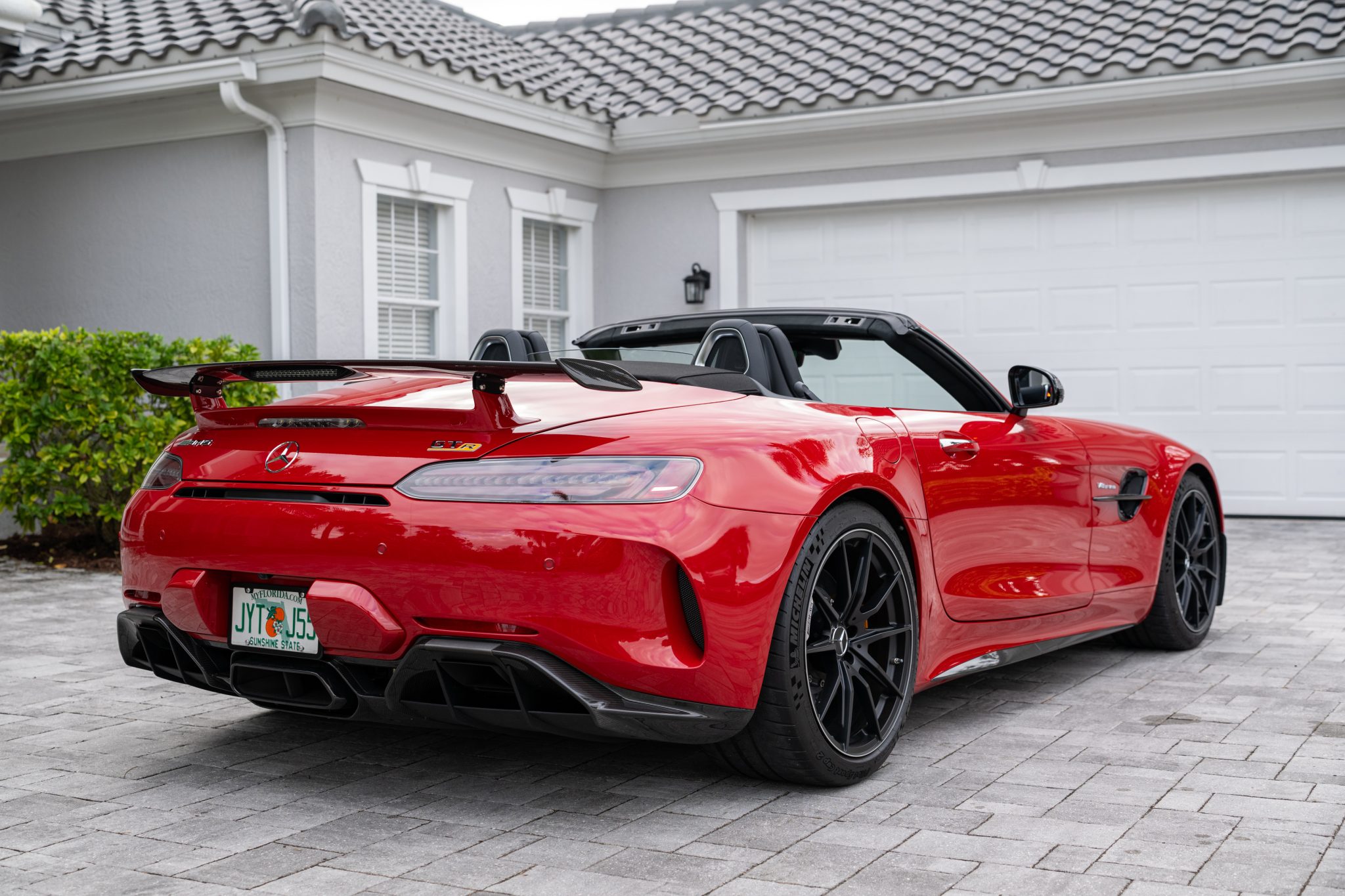 The 19″ and 20″ black AMG Black Series forged 10-spoke wheels are mounted with 275/35 front and 325/30 rear Michelin Pilot Sport Cup 2 tires. Optional ceramic-composite brakes with gold-painted calipers are fitted at all four corners. The car came equipped from the factory with an AMG Adaptive Sport Suspension and rear-axle steering. The GT R features adaptive dampers and a larger rear anti-roll bar compared to the standard AMG GT.