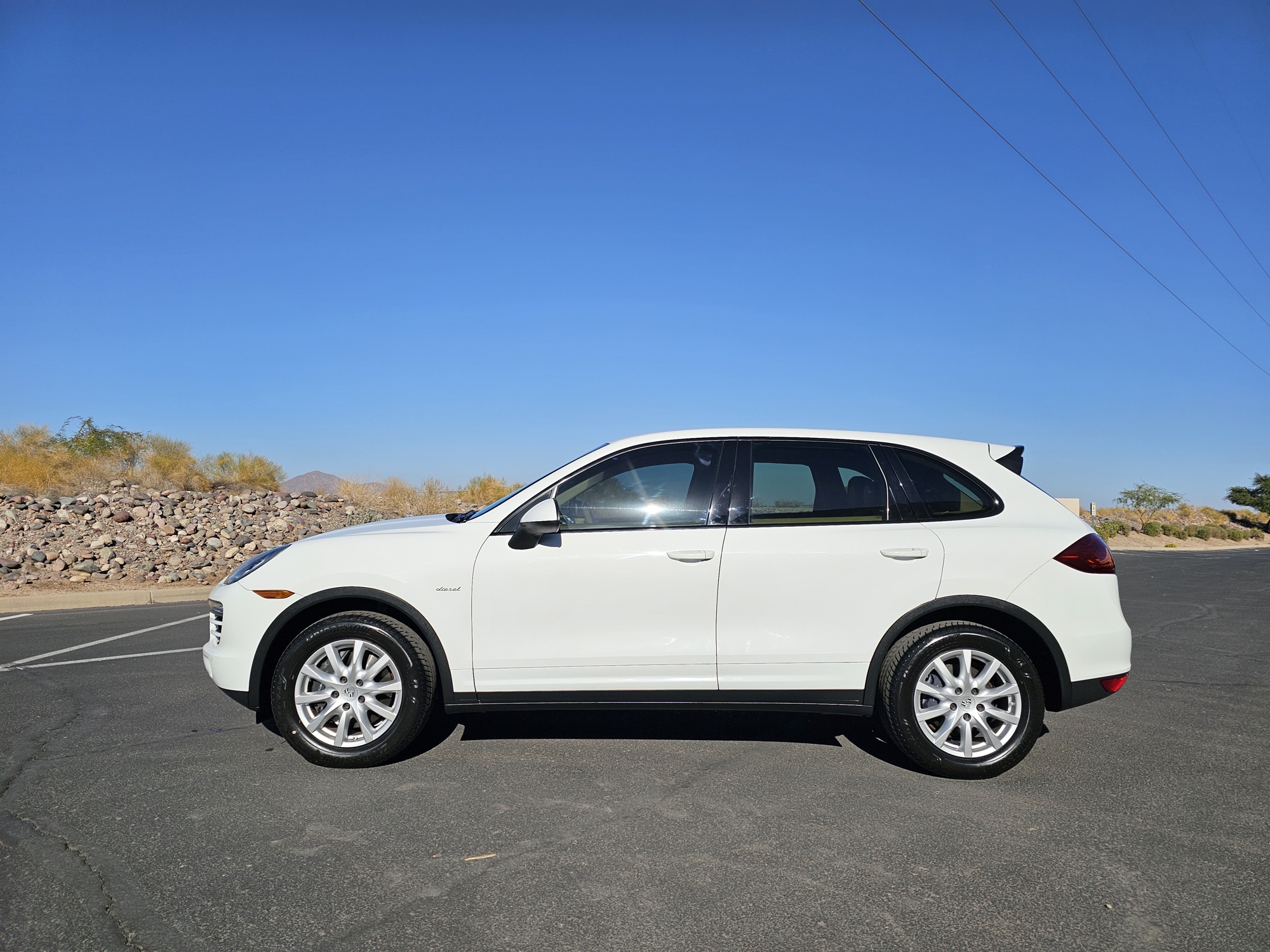 The 18″ Cayenne alloy wheels are mounted with Bridgestone Alenza tires. Stopping power is provided by six-piston front and four-piston rear brake calipers over ventilated rotors at each corner. The Carfax report notes a brake fluid flush as well as front brake pad and lower control arm replacements in February 2024.