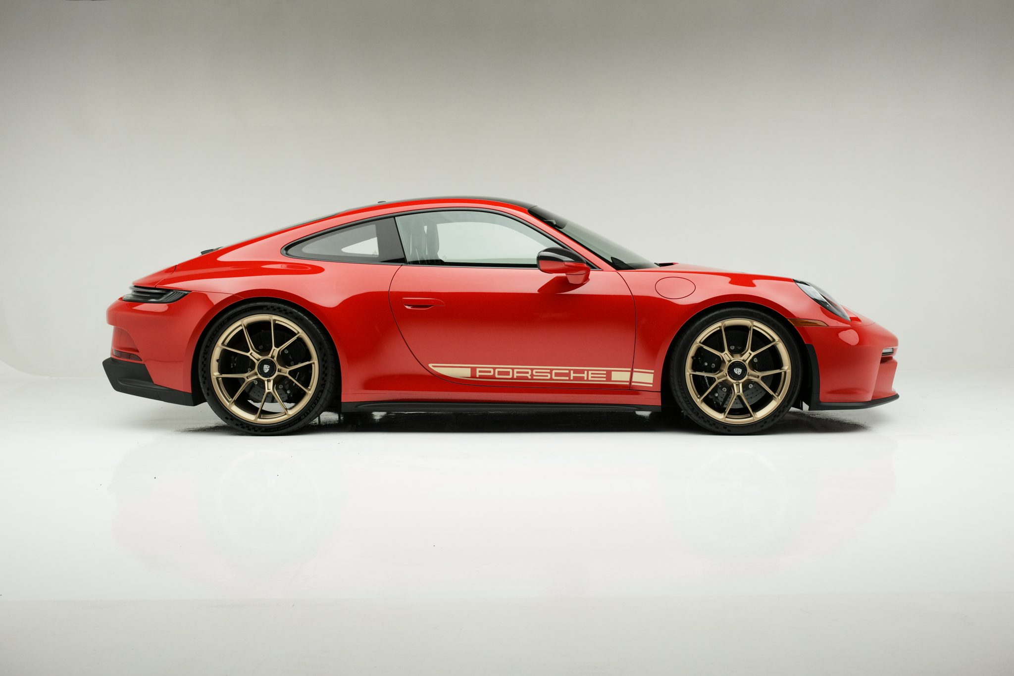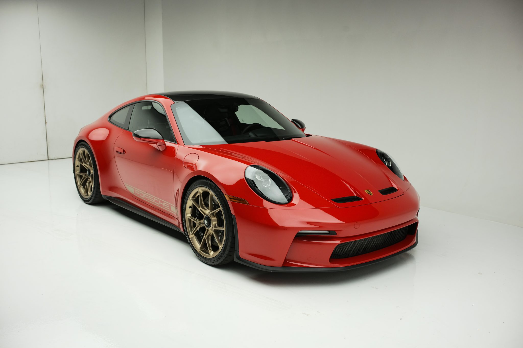Satin Neodyme-finished 20″ front and 21″ rear GT3 center-lock wheels are mounted with Michelin Pilot Sport Cup 2 tires. Stopping power is provided by Porsche Ceramic Composite Brakes (PCCB) with black-finished calipers over cross-drilled and ventilated discs at each corner. The car is equipped with a front-axle lift system and rear-axle steering.