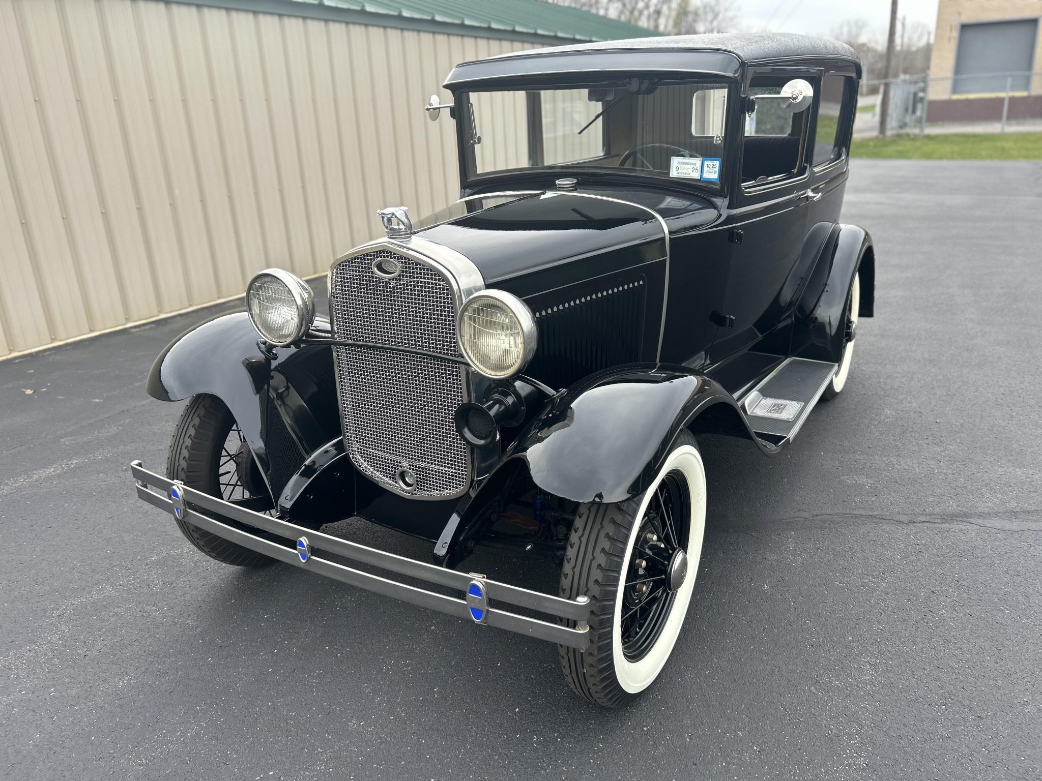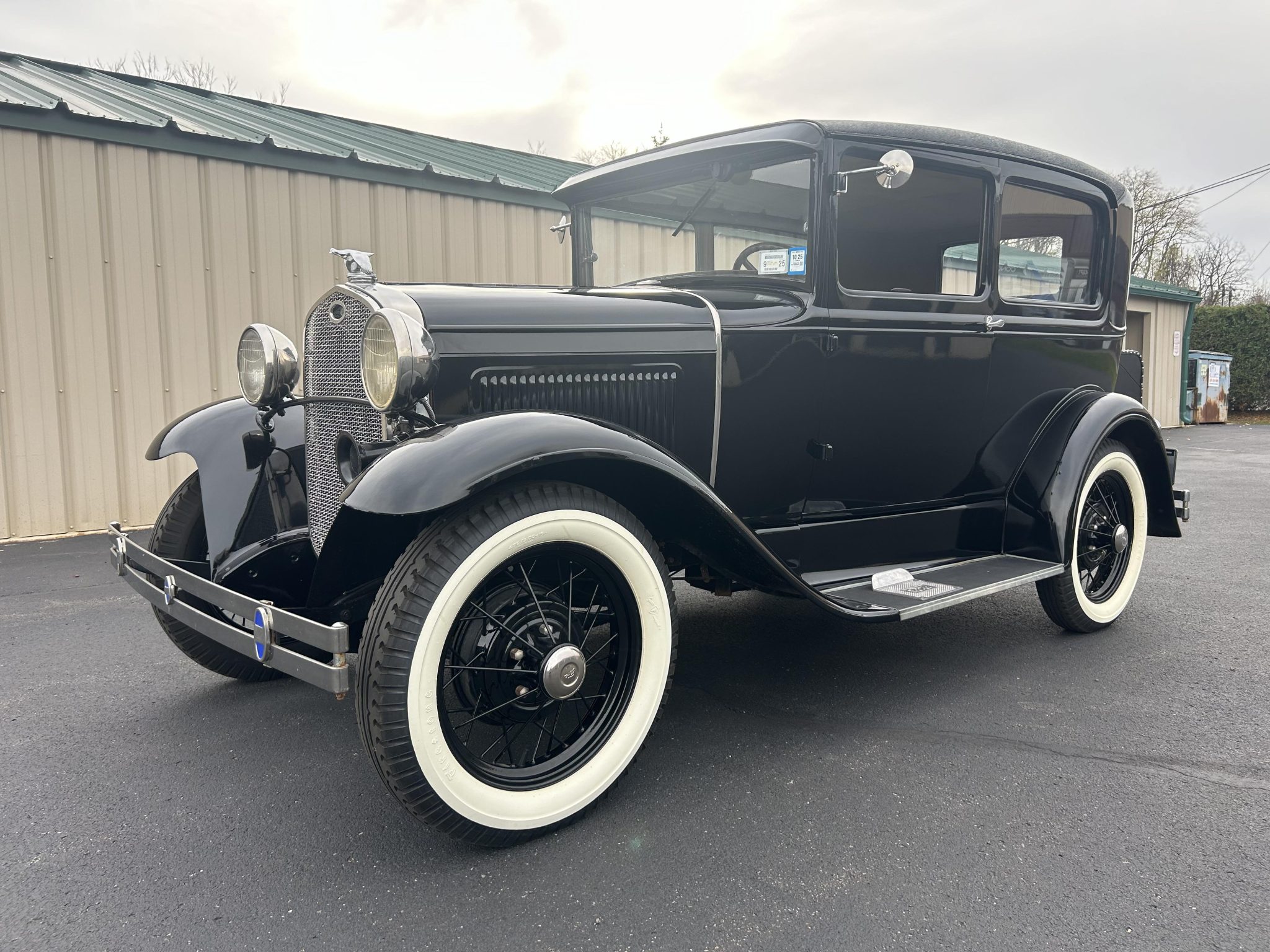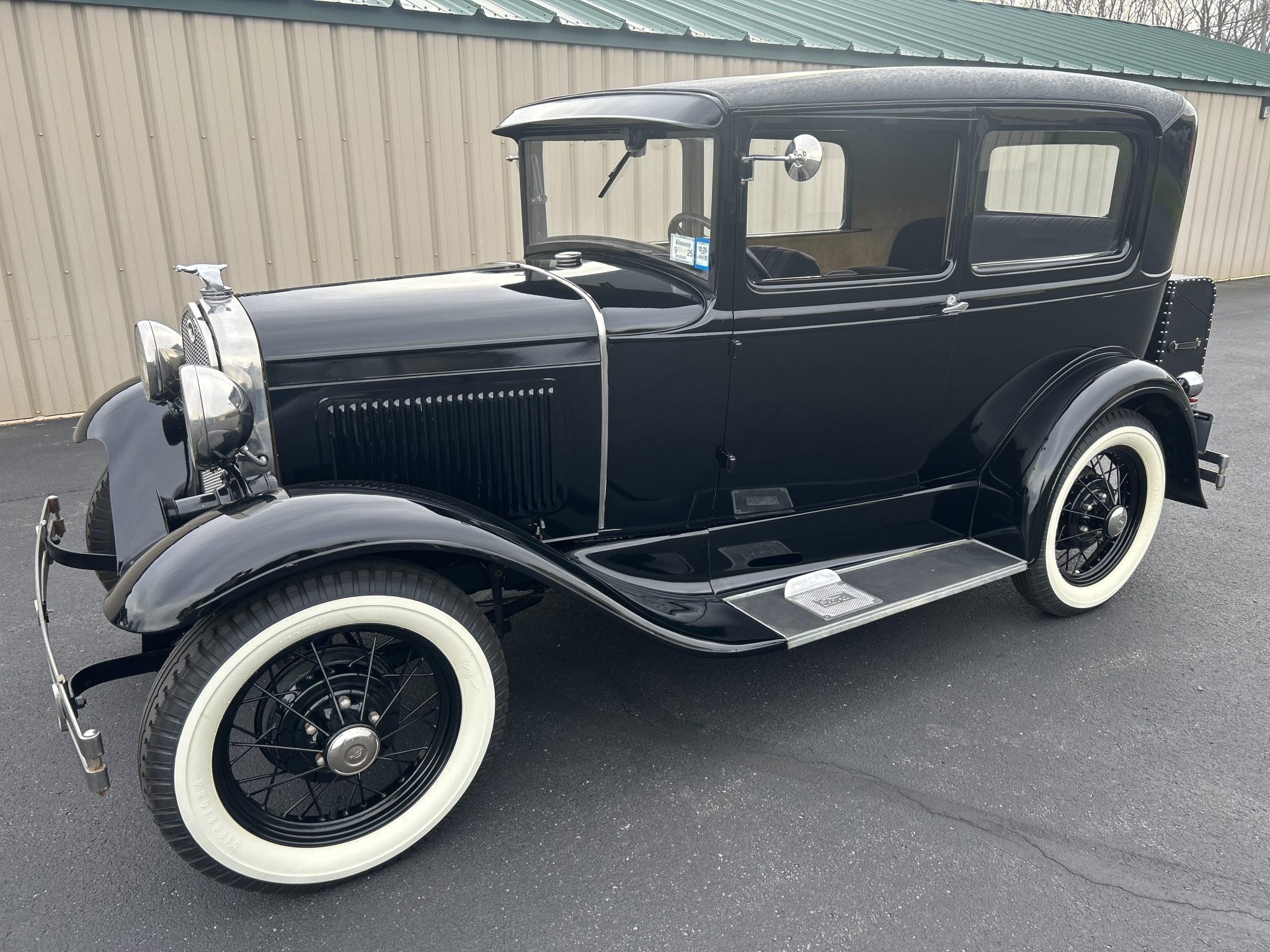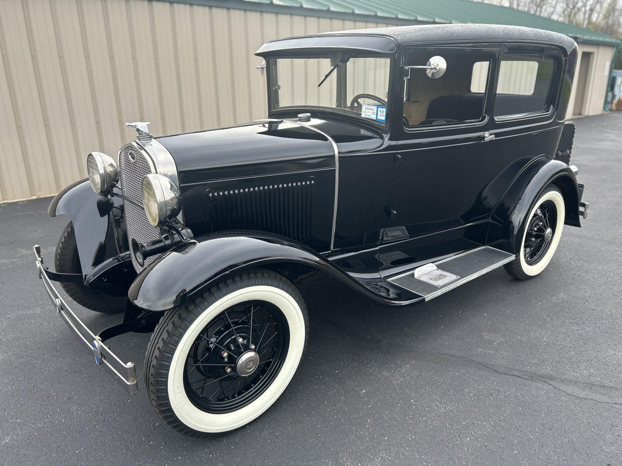 Black-painted 19″ wire-spoke wheels are wrapped in Firestone Gum Dipped whitewall tires measuring 4.75/5.00. A fold-down luggage rack with a black trunk is positioned ahead of a rear-mounted spare tire under a black cover. Braking is provided by four-wheel drums. Modified suspension is handled by modern-style shock absorbers.