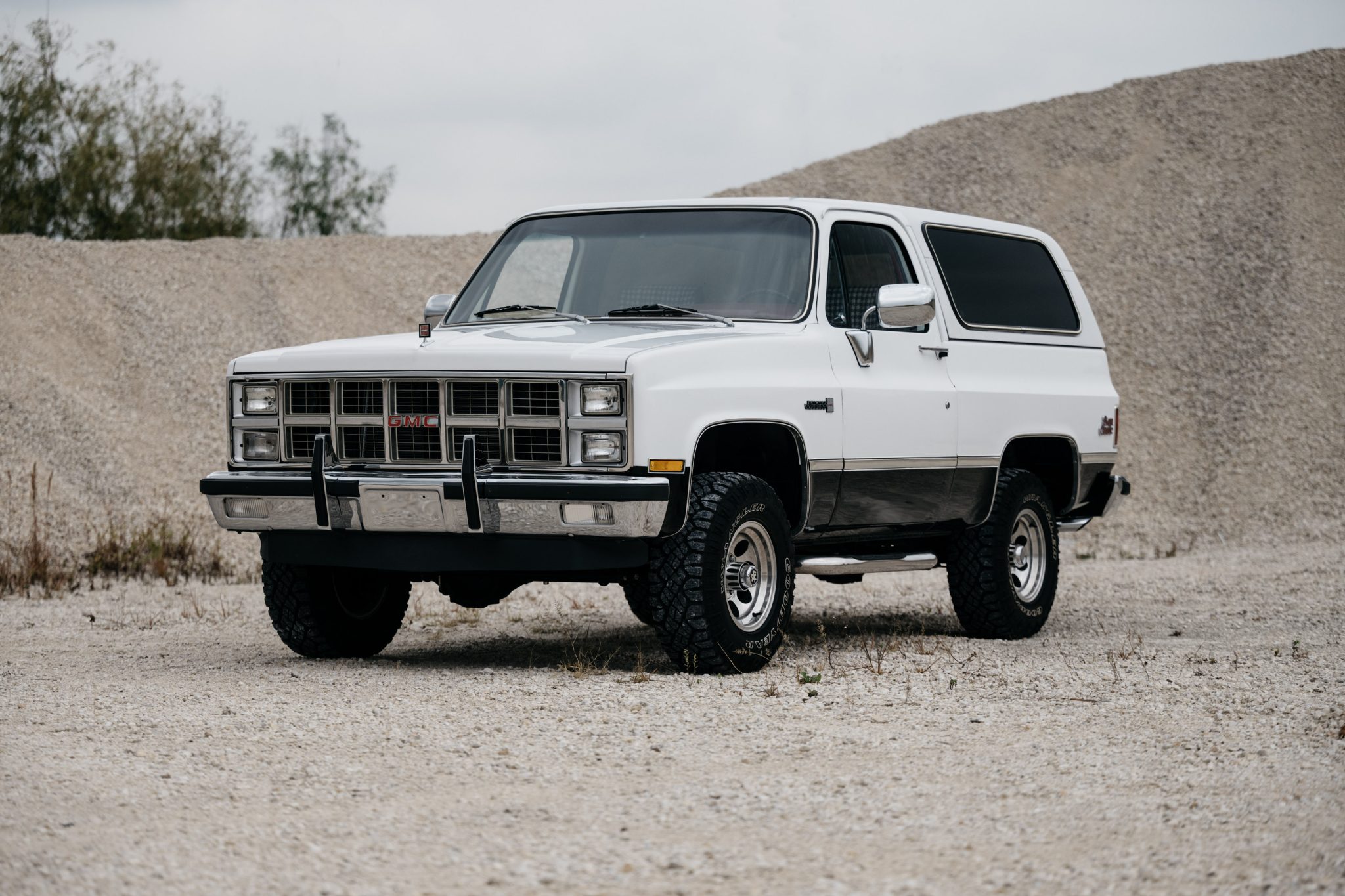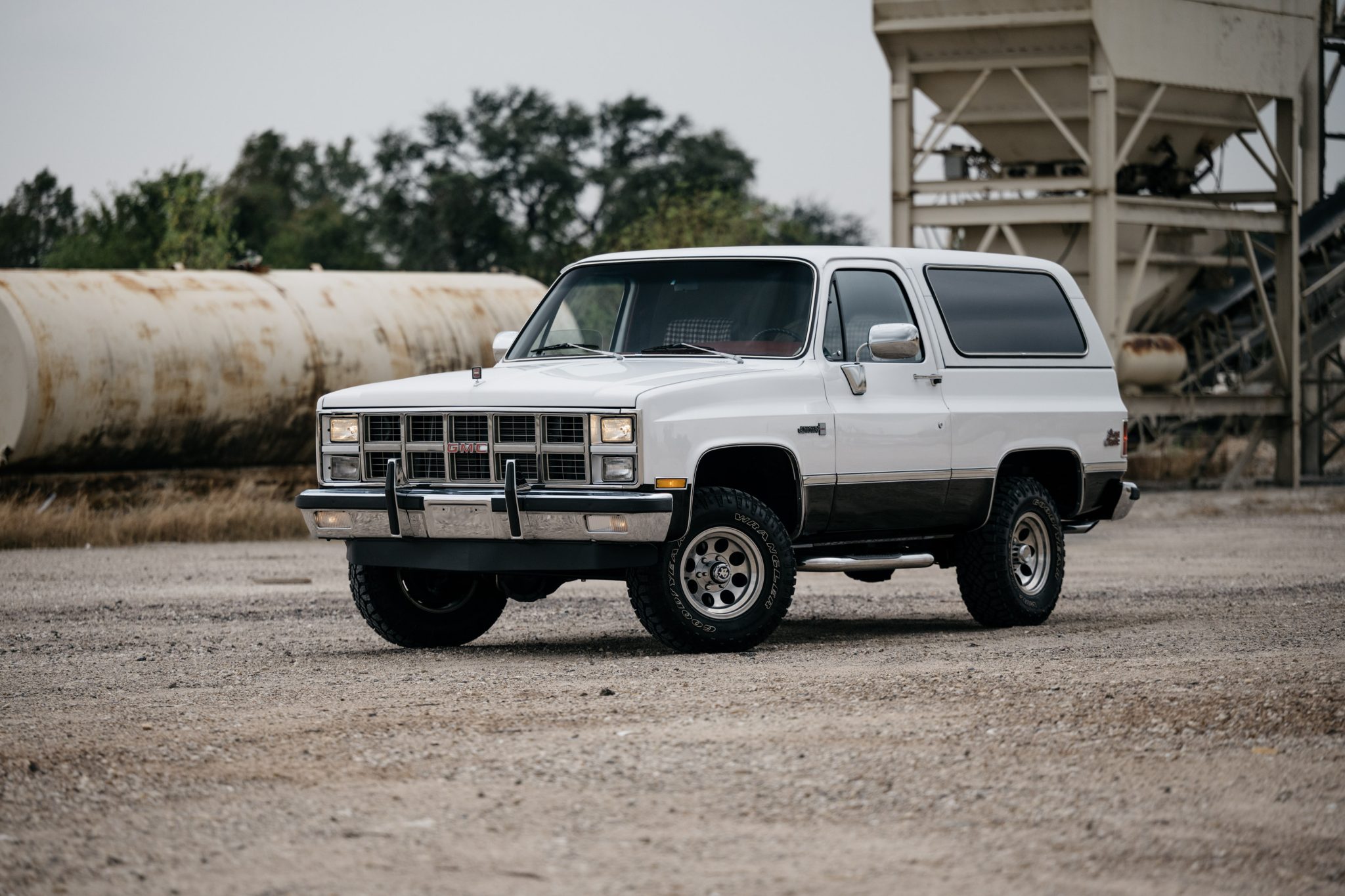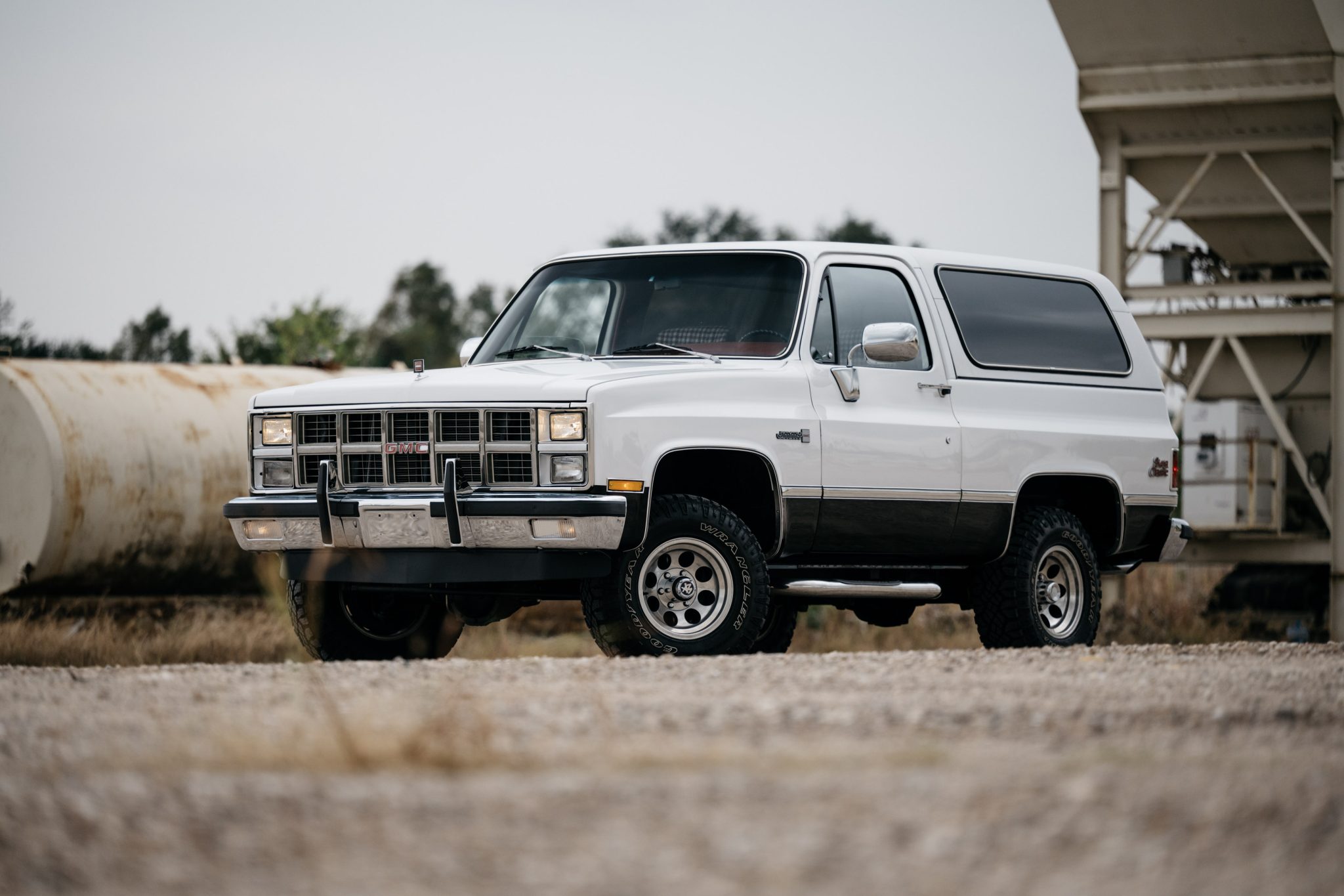 Polished 15″ aluminum wheels wear 31×10.50″ Goodyear Wrangler Duratrac tires showing 2021 production date codes. The steering gearbox, idler arm, drag links, tie rod ends, ball joints, brake calipers, front dampers, rear leaf spring bushings, and other components that were replaced in 2023 are itemized in records shown at the end of the gallery below.