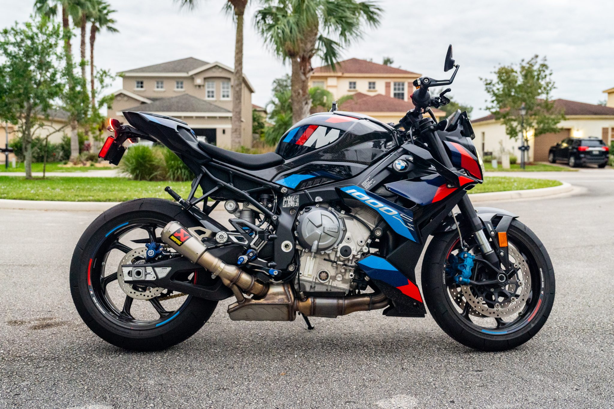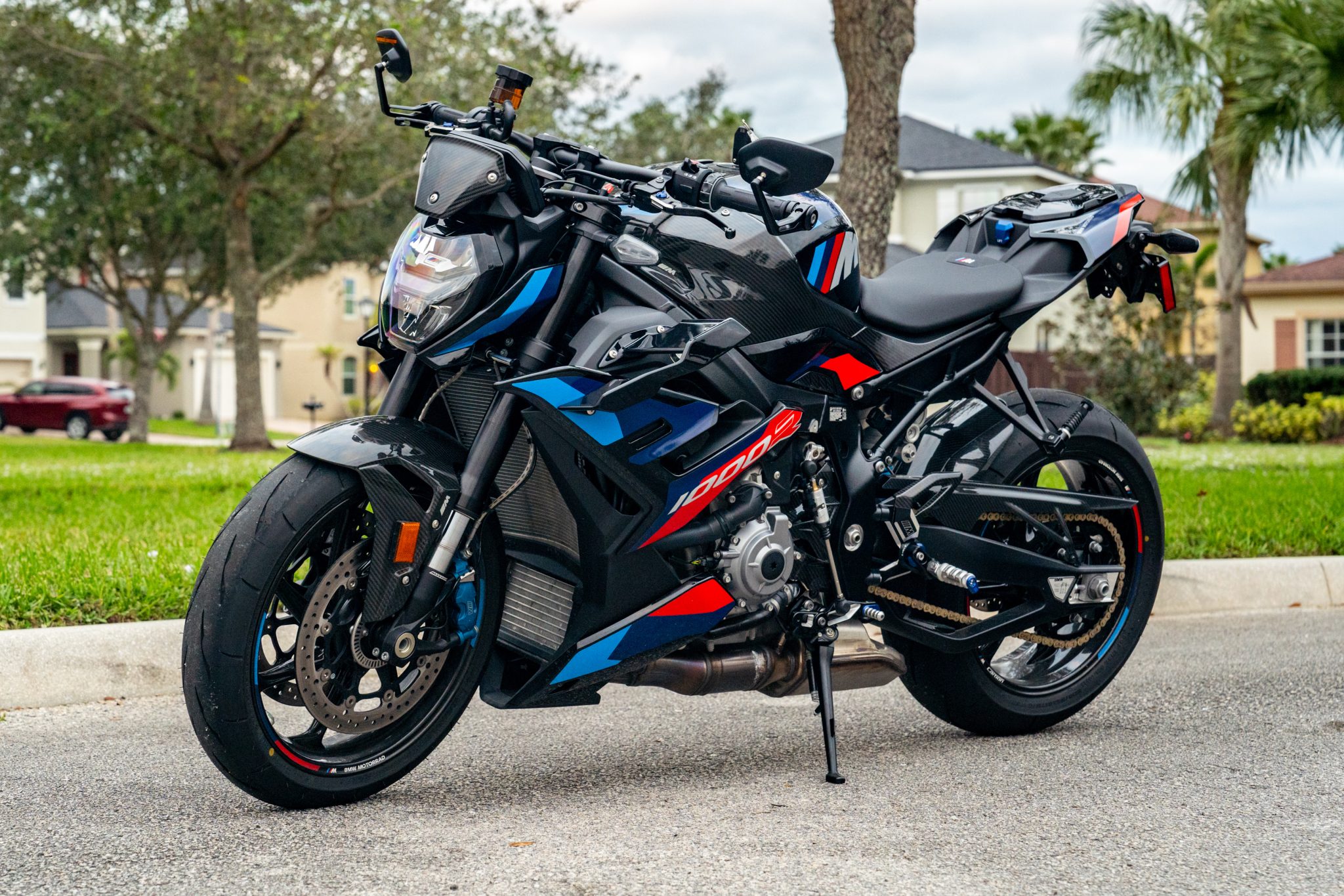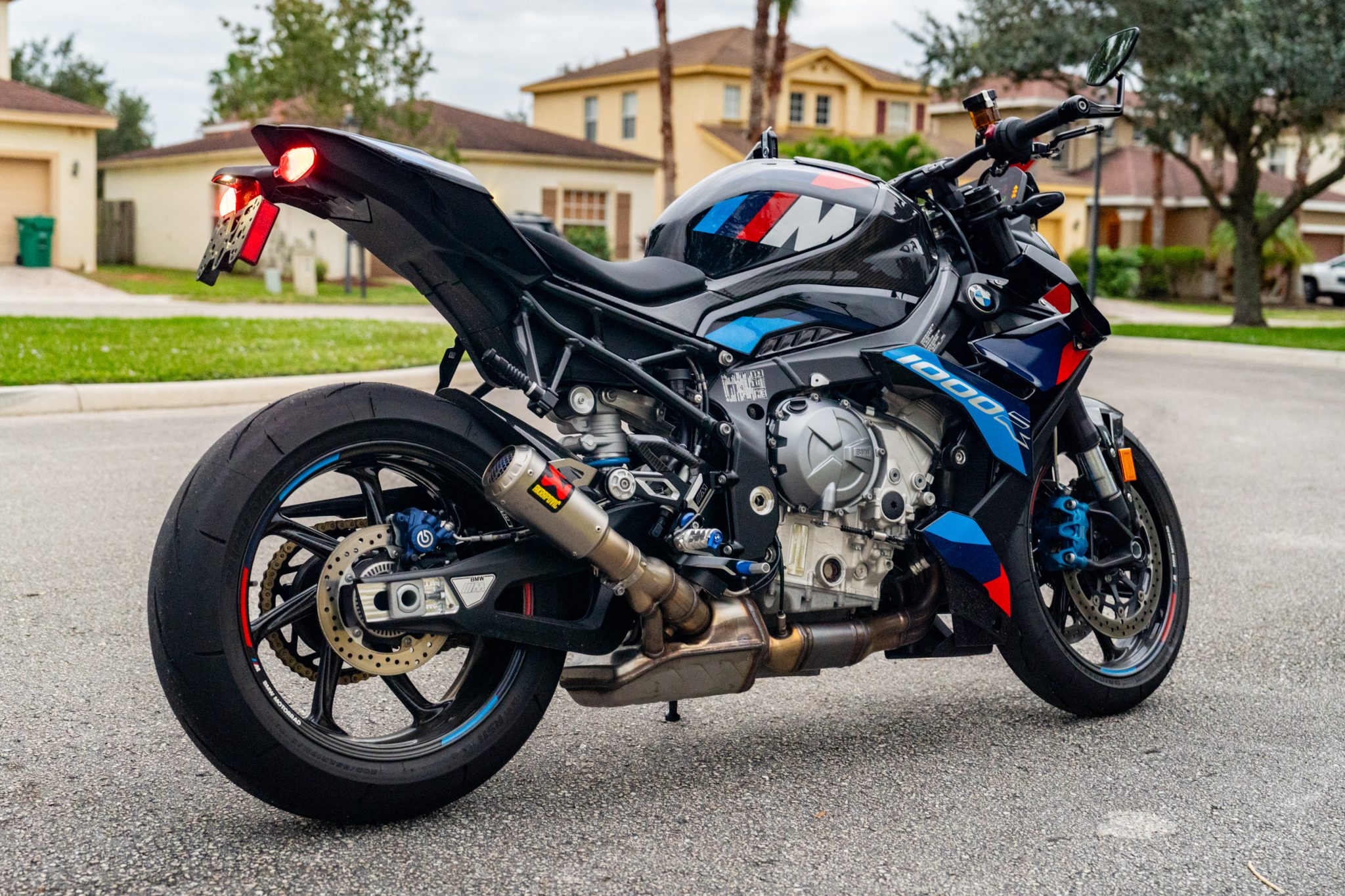 M Carbon 17″ wheels wear Bridgestone Battlax Racing Street RS11 tires. The triple disc brakes feature BMW Motorrad Race ABS Pro along with blue-finished calipers, the front of which are four-piston components. The electronically adjustable Dynamic Damping Control (DDC) suspension consists of a 45mm Marzocchi inverted fork in addition to a monoshock attached to the aluminum swingarm.