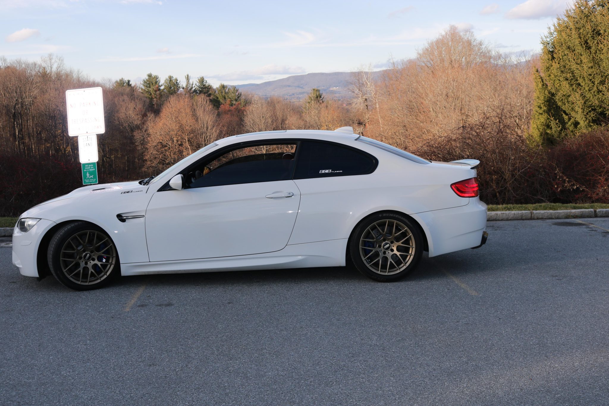 Bronze-finished 18×8.5″ front and 18×9.5″ rear Avant Garde M359-style wheels are mounted with 245/40 Sumitomo HTR Z5 front and 265/40 Sumitomo HTR ZIII rear tires. Electronic Damping Control (EDC) and Dynamic Stability Control (DSC) were equipped from the factory, and the car has been lowered. Braking is handled by four-wheel vented and cross-drilled discs measuring 14.2″ and 13.8″ front and rear, respectively. Aftermarket M stickers have been added to the front calipers.