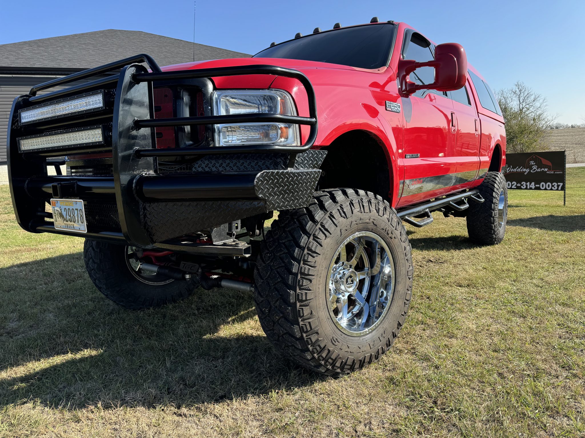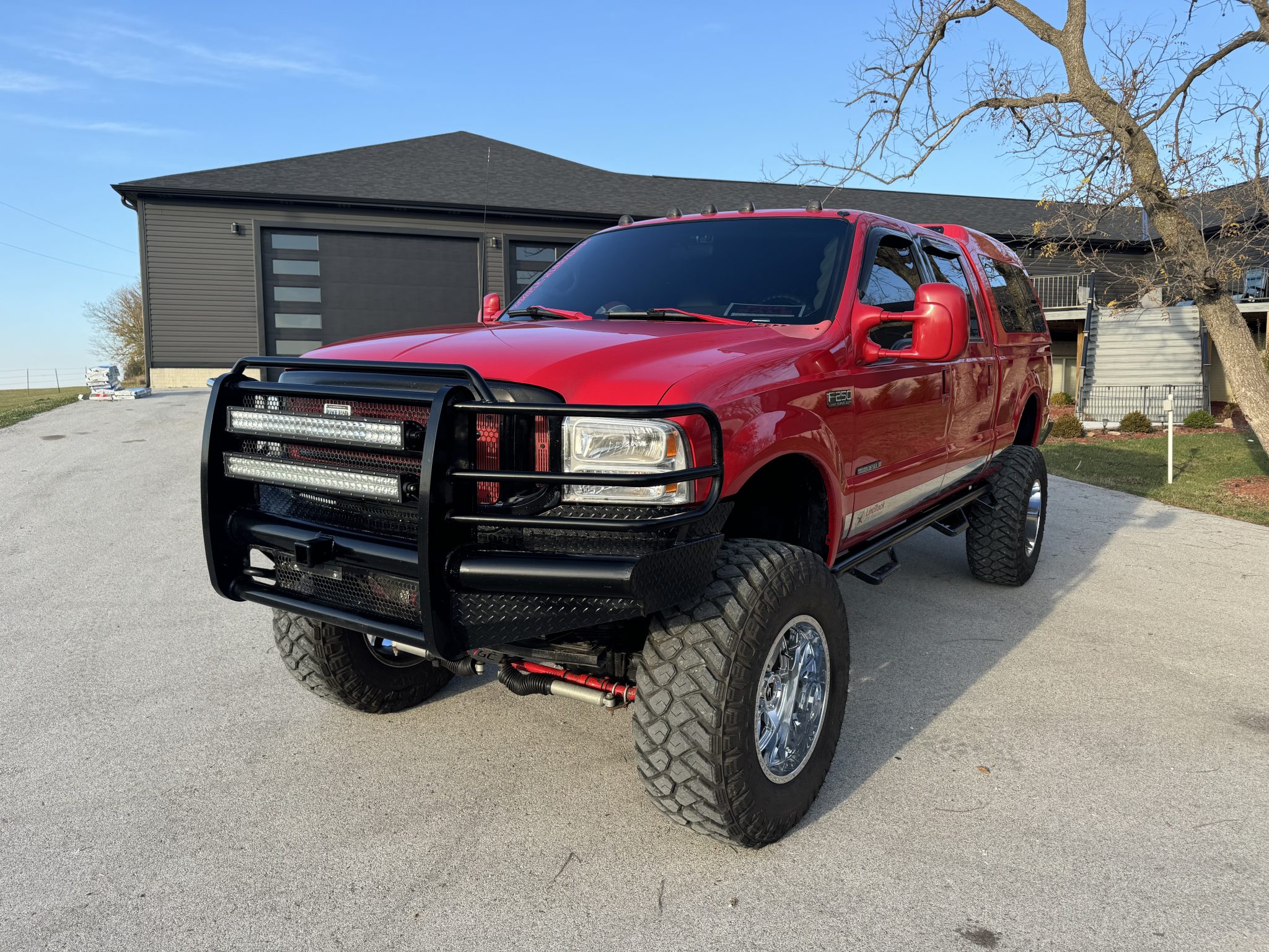 The 20″ Gear Off Road wheels are mounted with 40×13.5″ Maxxis Razr MT Radial tires. The truck is equipped with a 10″ lift kit and rear air bags. Stopping power is provided by four-wheel disc brakes. Stainless-steel brake lines are installed and the brake pads, brake rotors, and brake calipers were replaced in December 2023. A matching set of tires is included in the sale. Rock chips in the wheel wells are noted by the seller.
